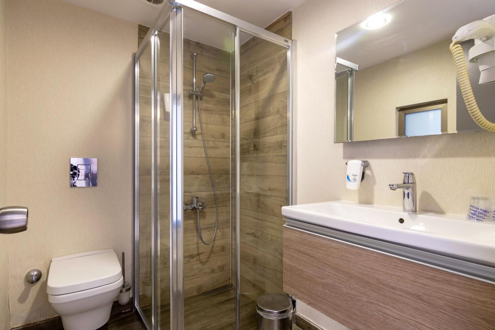 The bathroom is huge, with a fully functional shower. It includes a hairdryer, shaving kit, cotton pads, shower cap, shampoo, shower gel, body lotion, and a sewing kit — everything is clean and well-prepared. Each person gets two towels and there’s also a foot towel and disposable slippers.