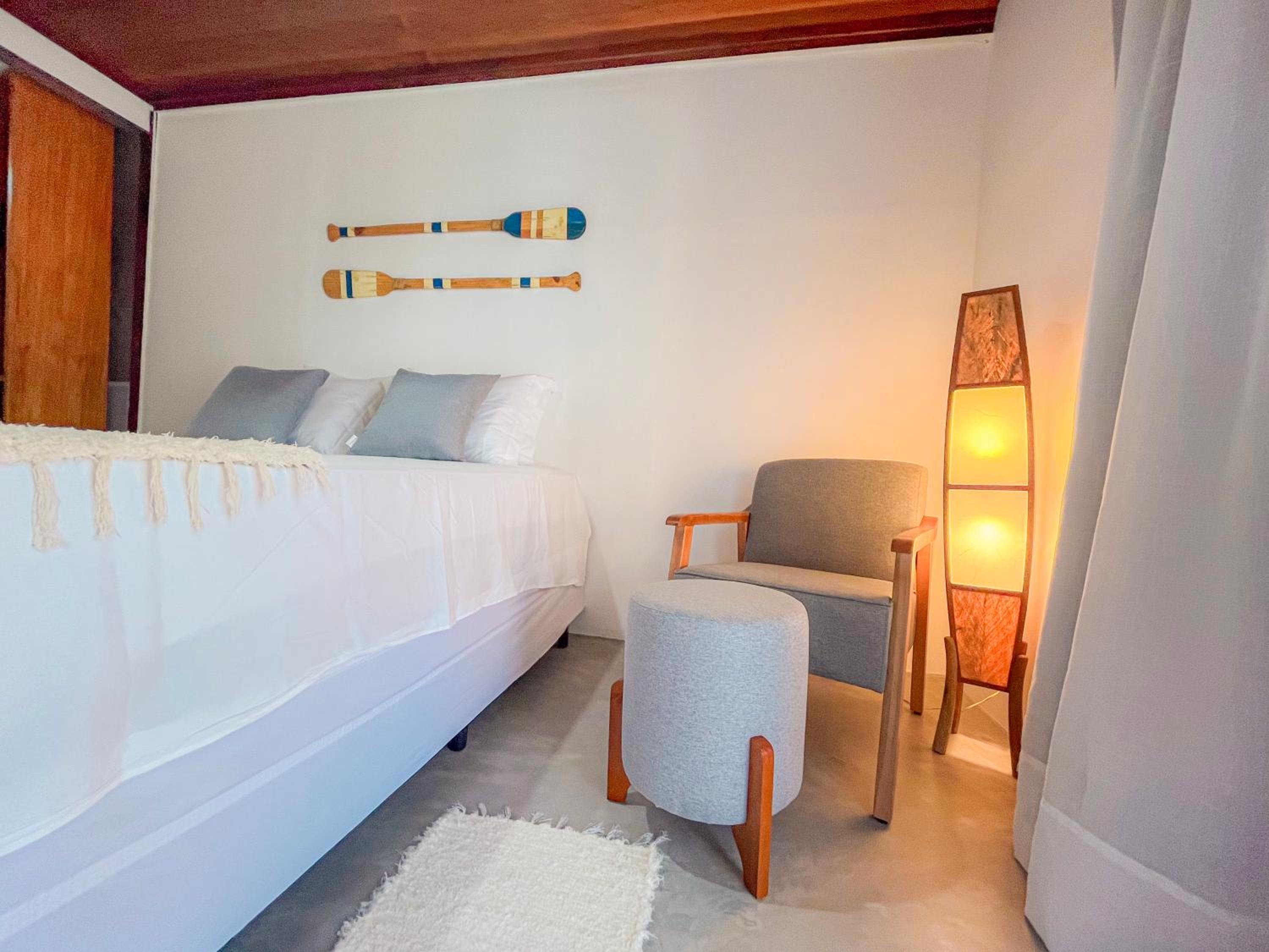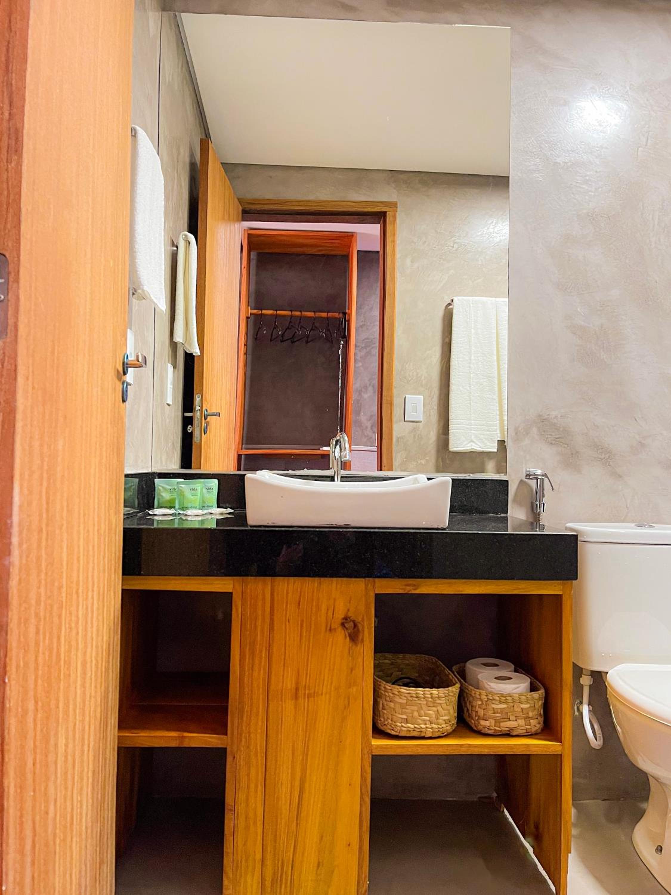 Banheiro muito pequeno. Sem espaços adequados pra pendurar roupas, chapéus, cangas, sem lugar para uma necessaire, falta mesinha de cabeceira adequada.