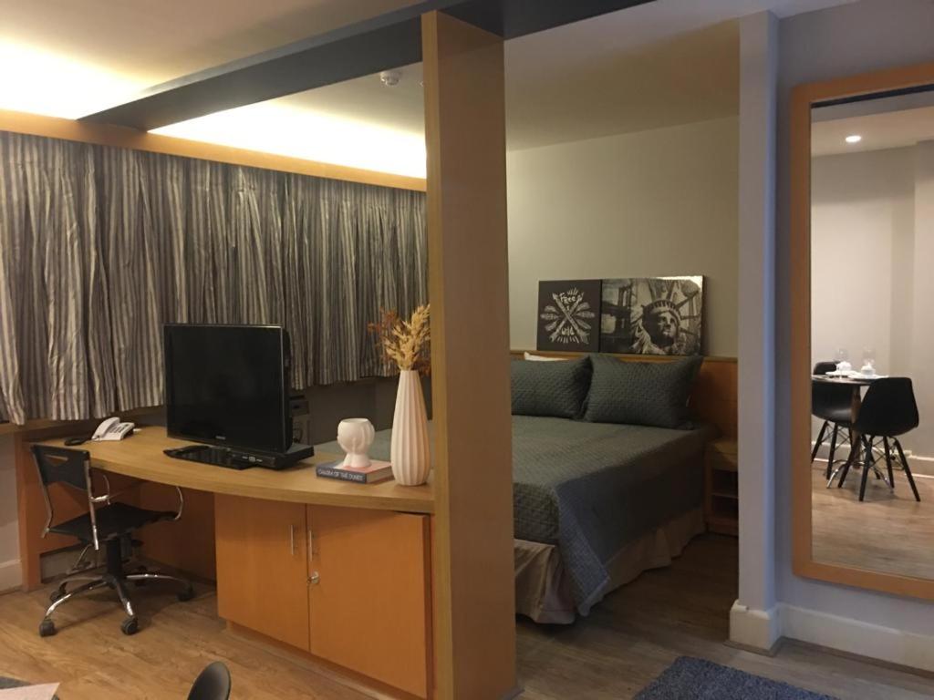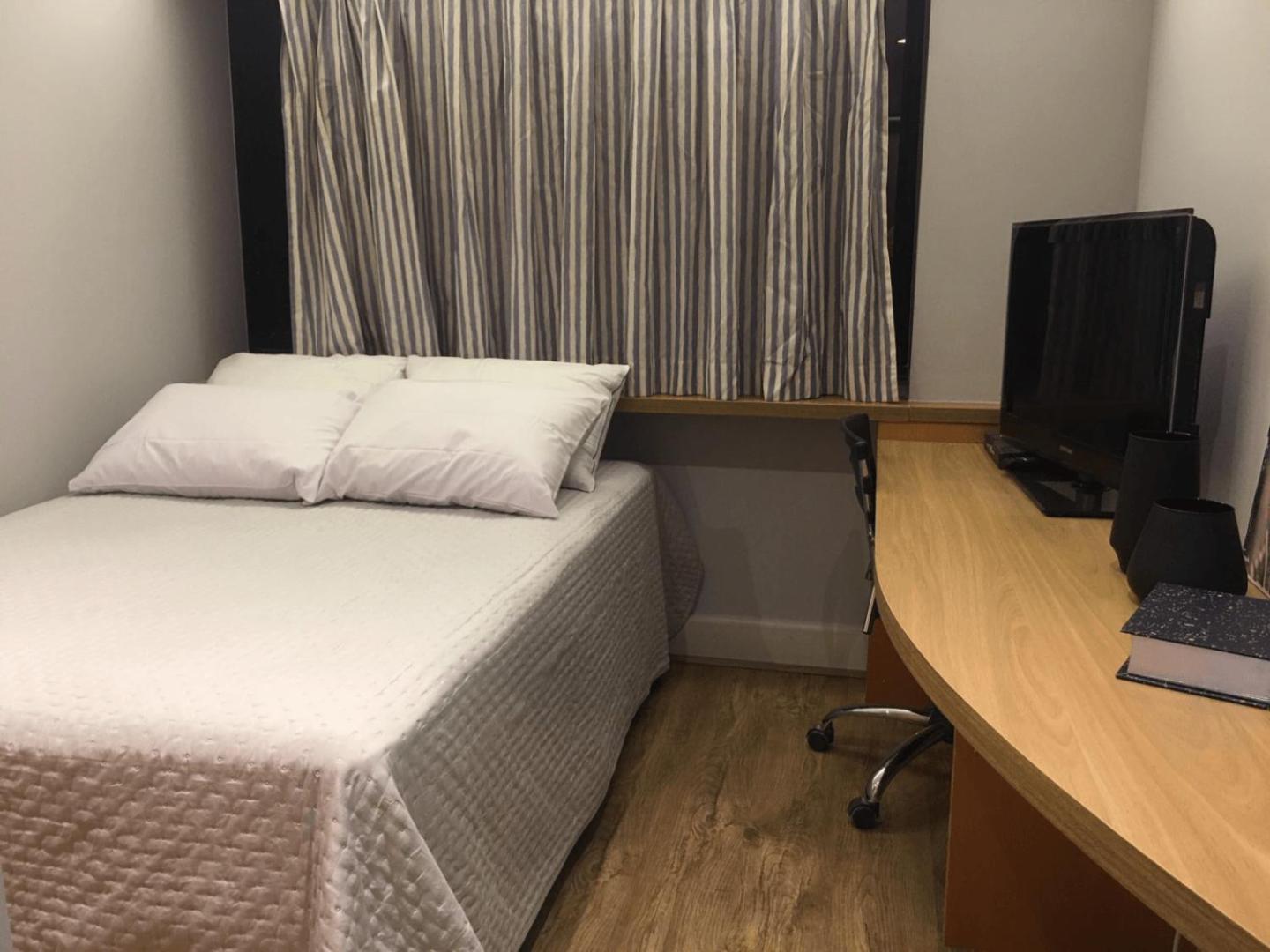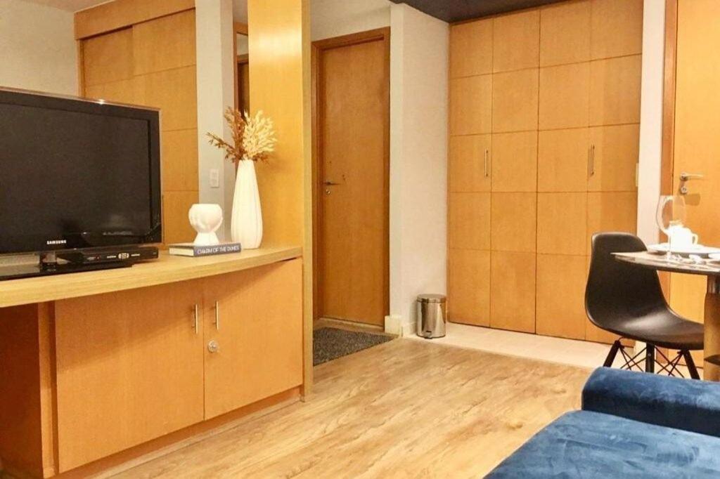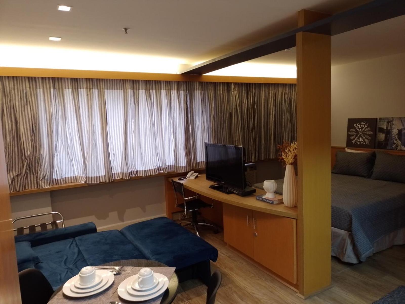 Discover the comfort of air-conditioned rooms with private bathrooms, TVs, and kitchen facilities at Flat com 02 suítes no Jardins.