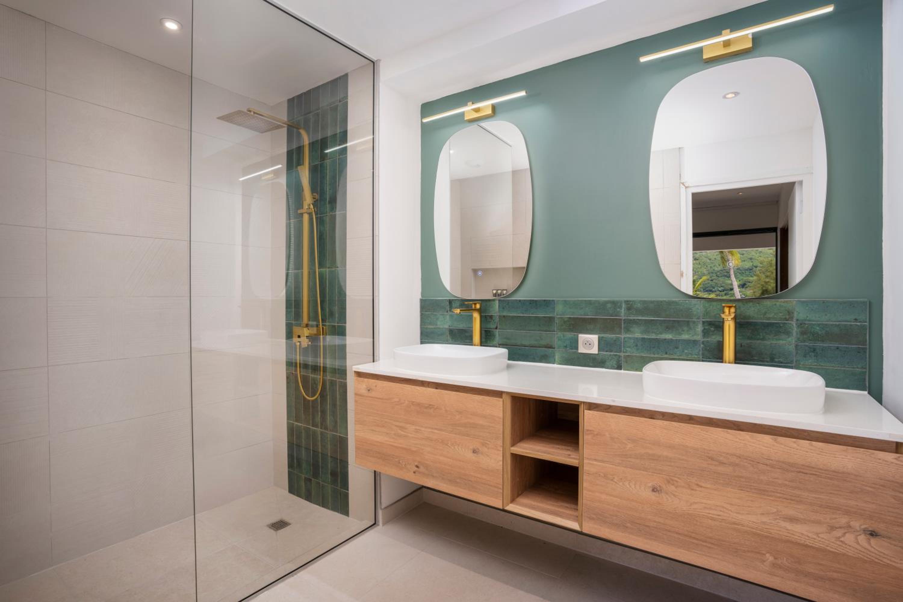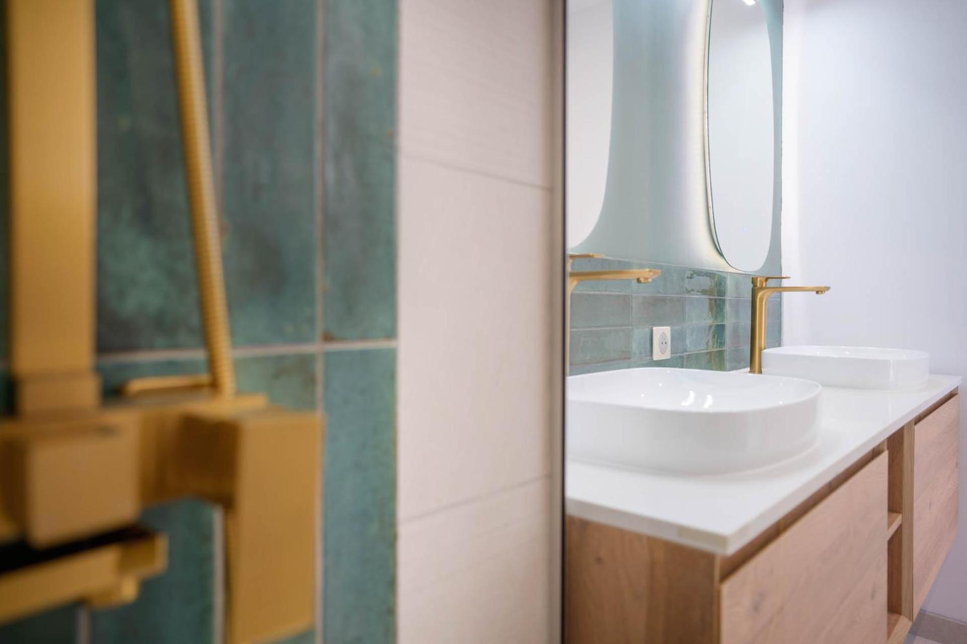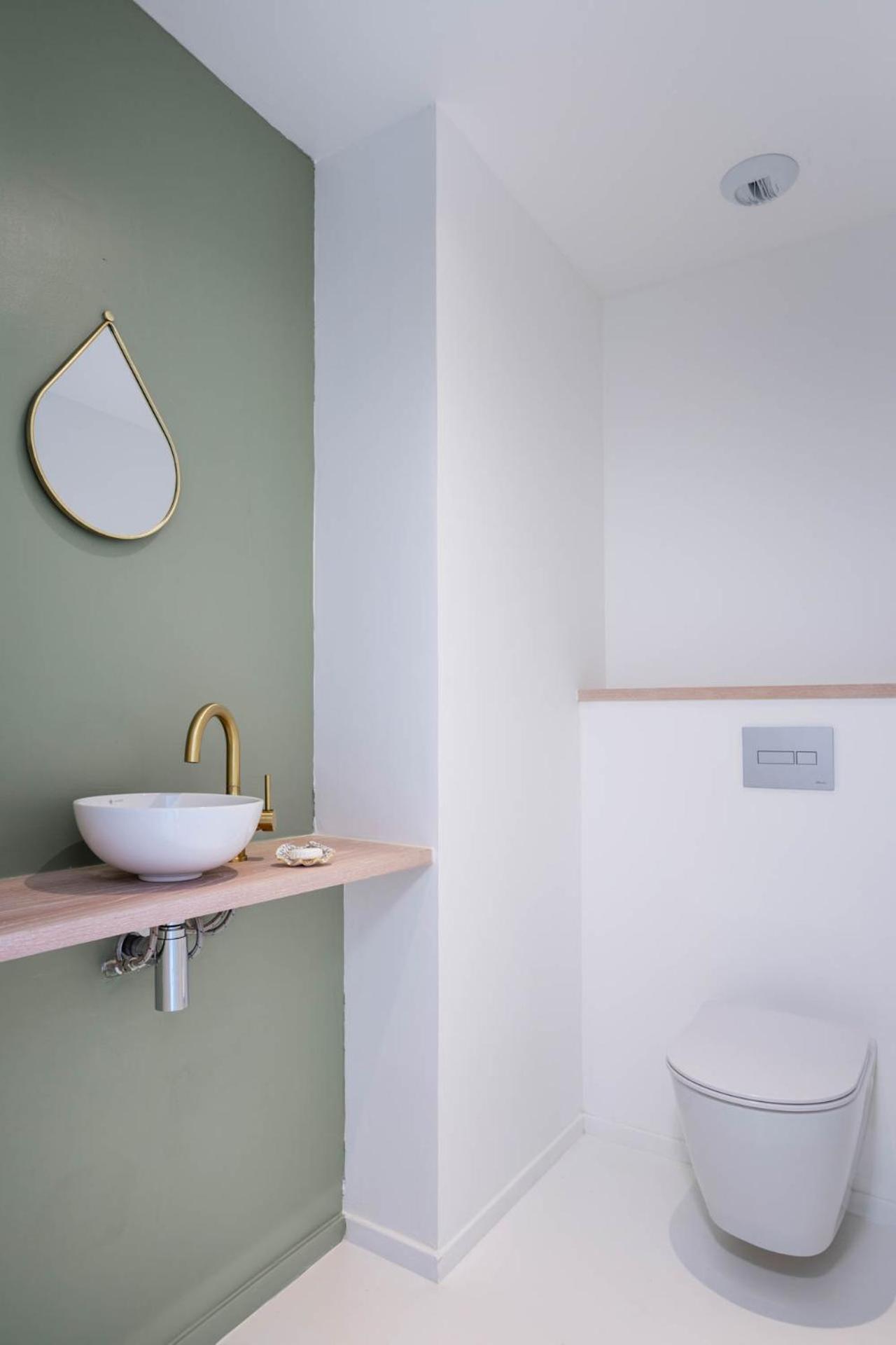 Pas de meuble de rangement dans la salle de bains. La douche italienne fermée par un simple rideau sur un seul côté ce qui entraîne un sol mouillé au niveau des toilettes.