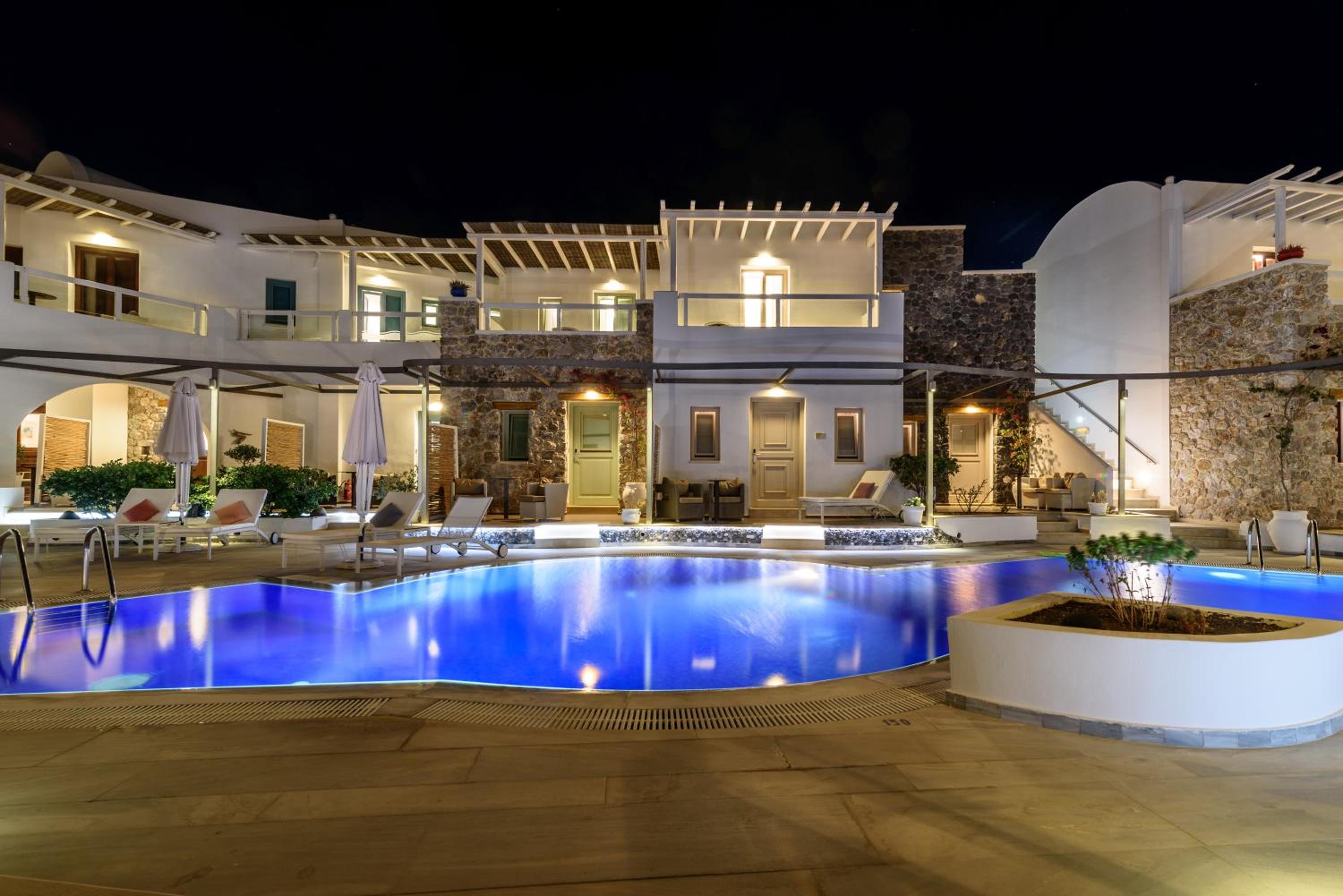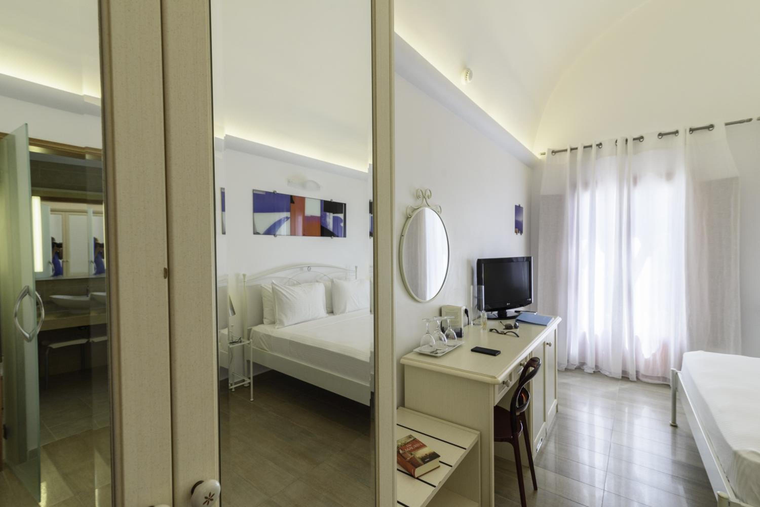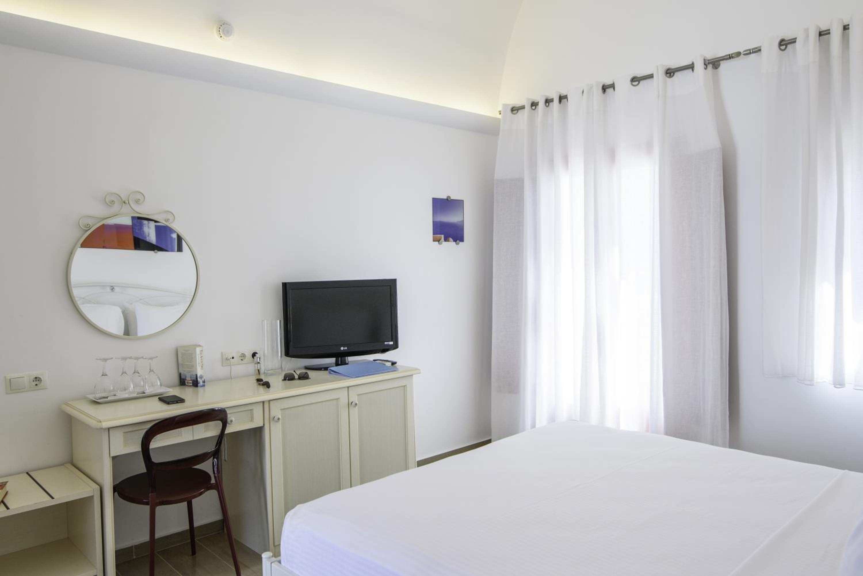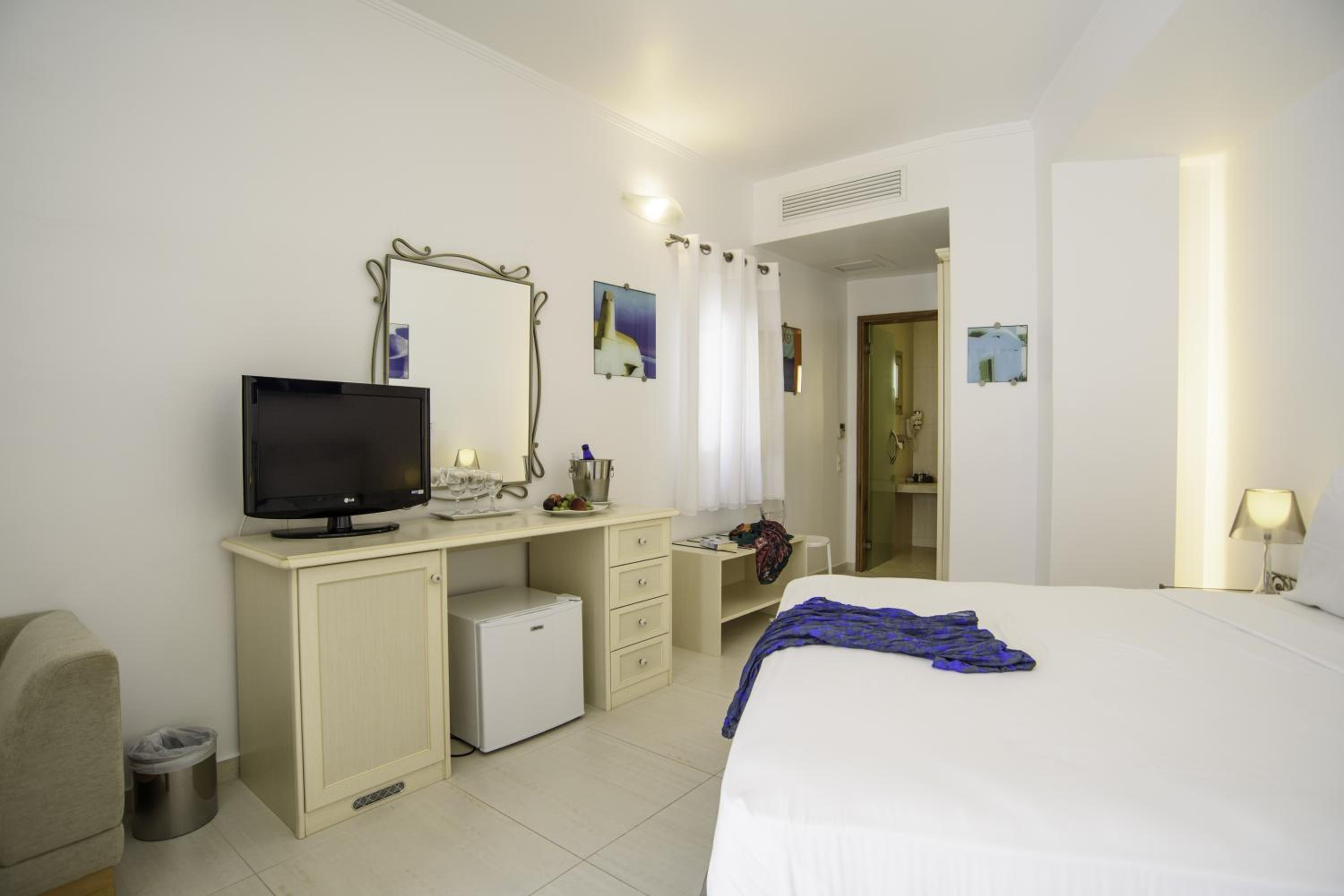 La Mer Deluxe Hotel & Spa, located just steps away from Kamari Beach, offers elegant rooms blending traditional Cycladic design with modern amenities. Enjoy a hydromassage tub or shower, flat-screen TV, and free Wi-Fi in every room.