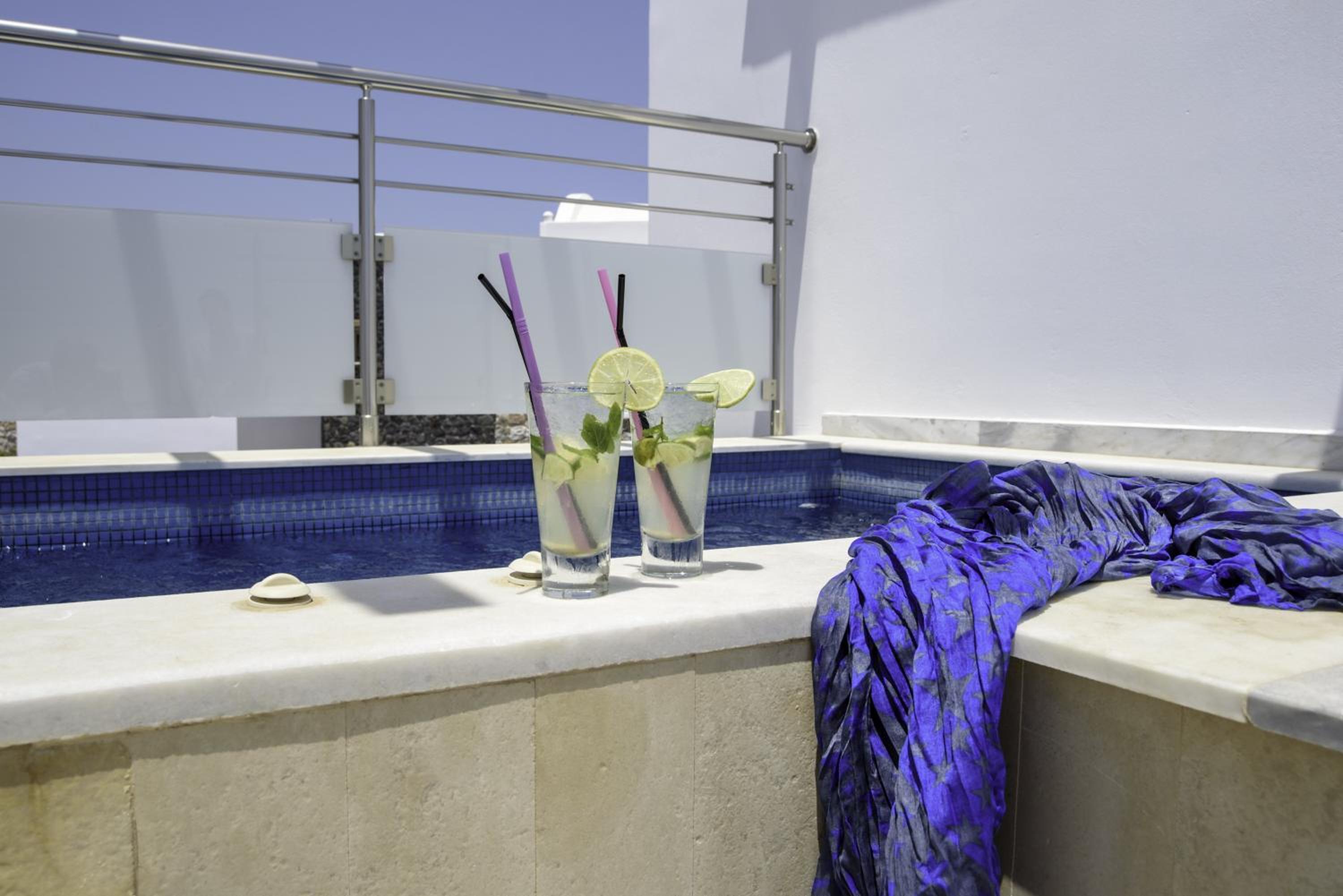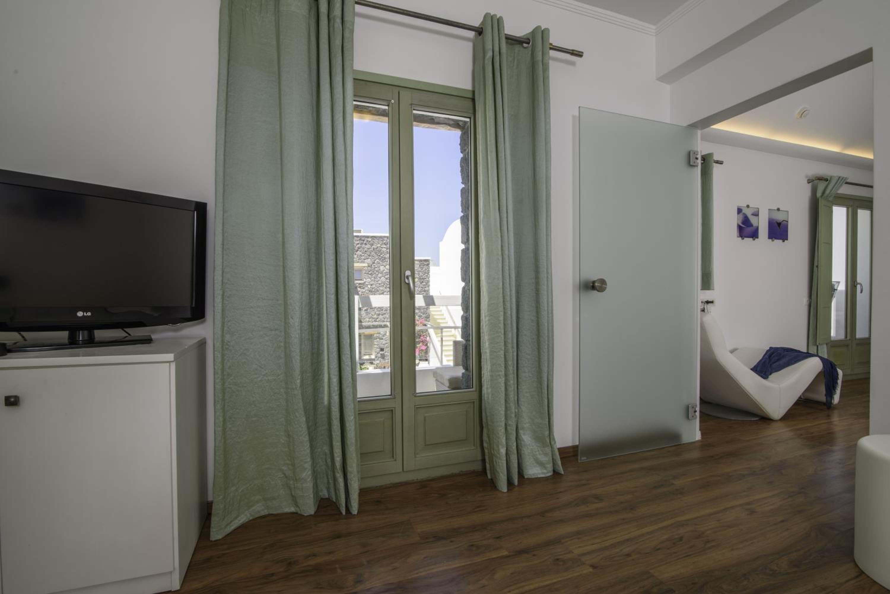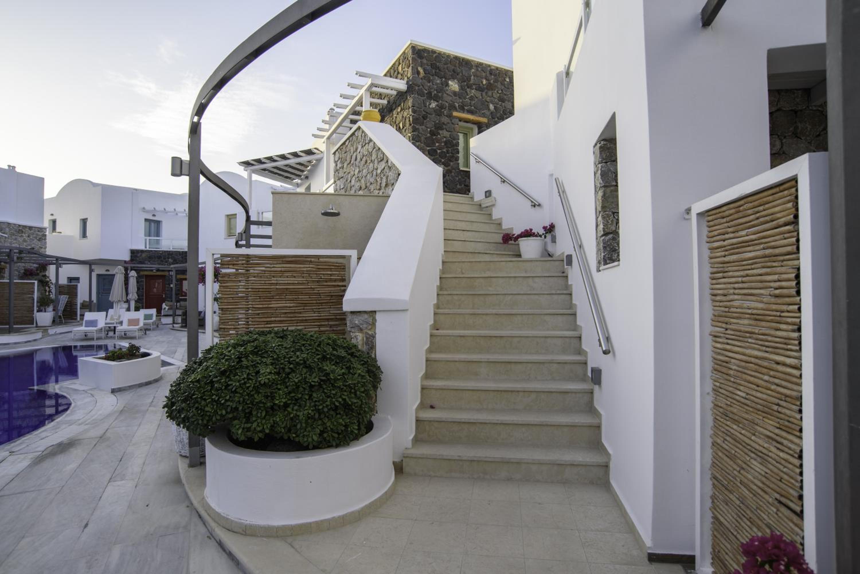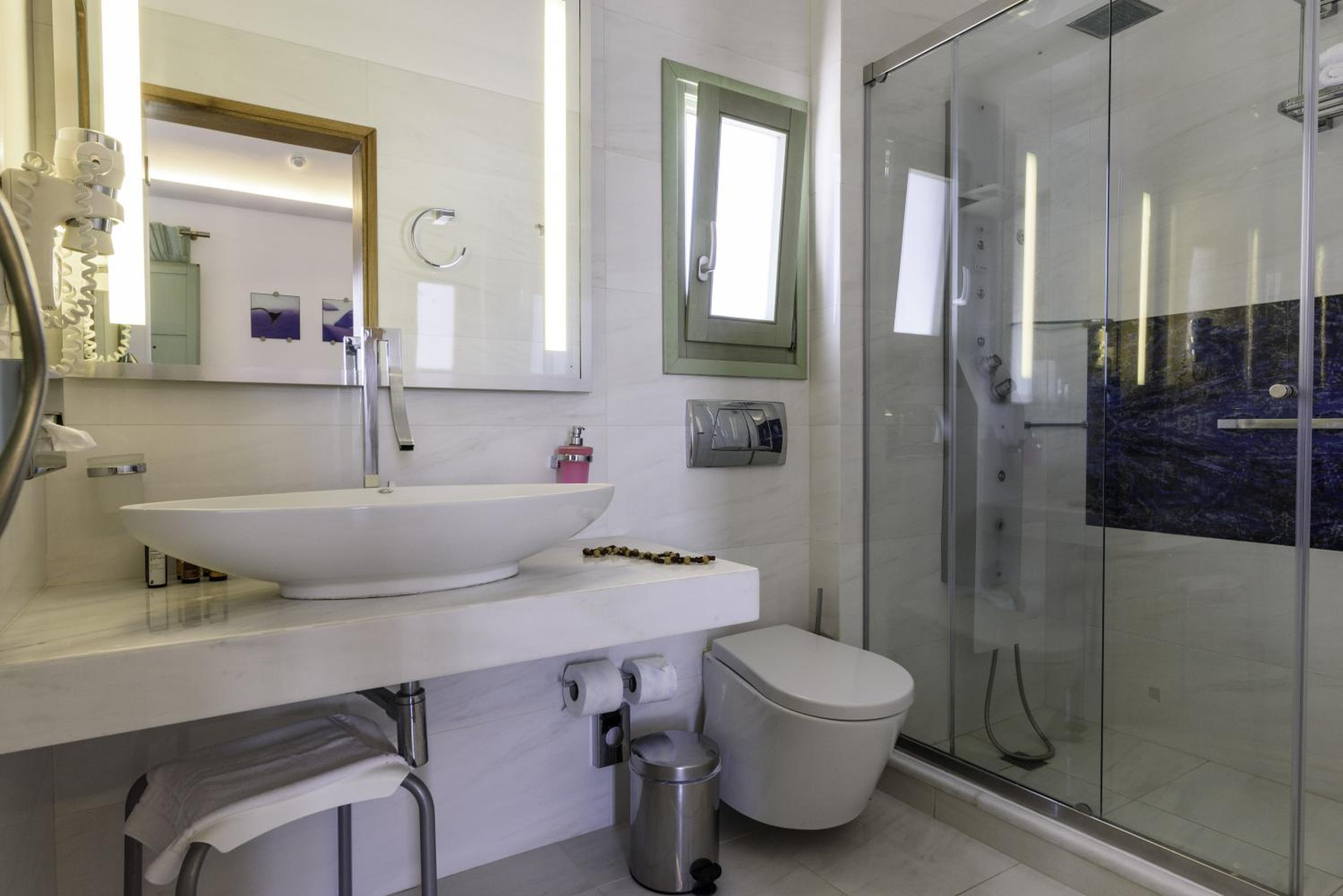 La Mer Deluxe Hotel & Spa, located just steps away from Kamari Beach, offers elegant rooms blending traditional Cycladic design with modern amenities. Enjoy a hydromassage tub or shower, flat-screen TV, and free Wi-Fi in every room.