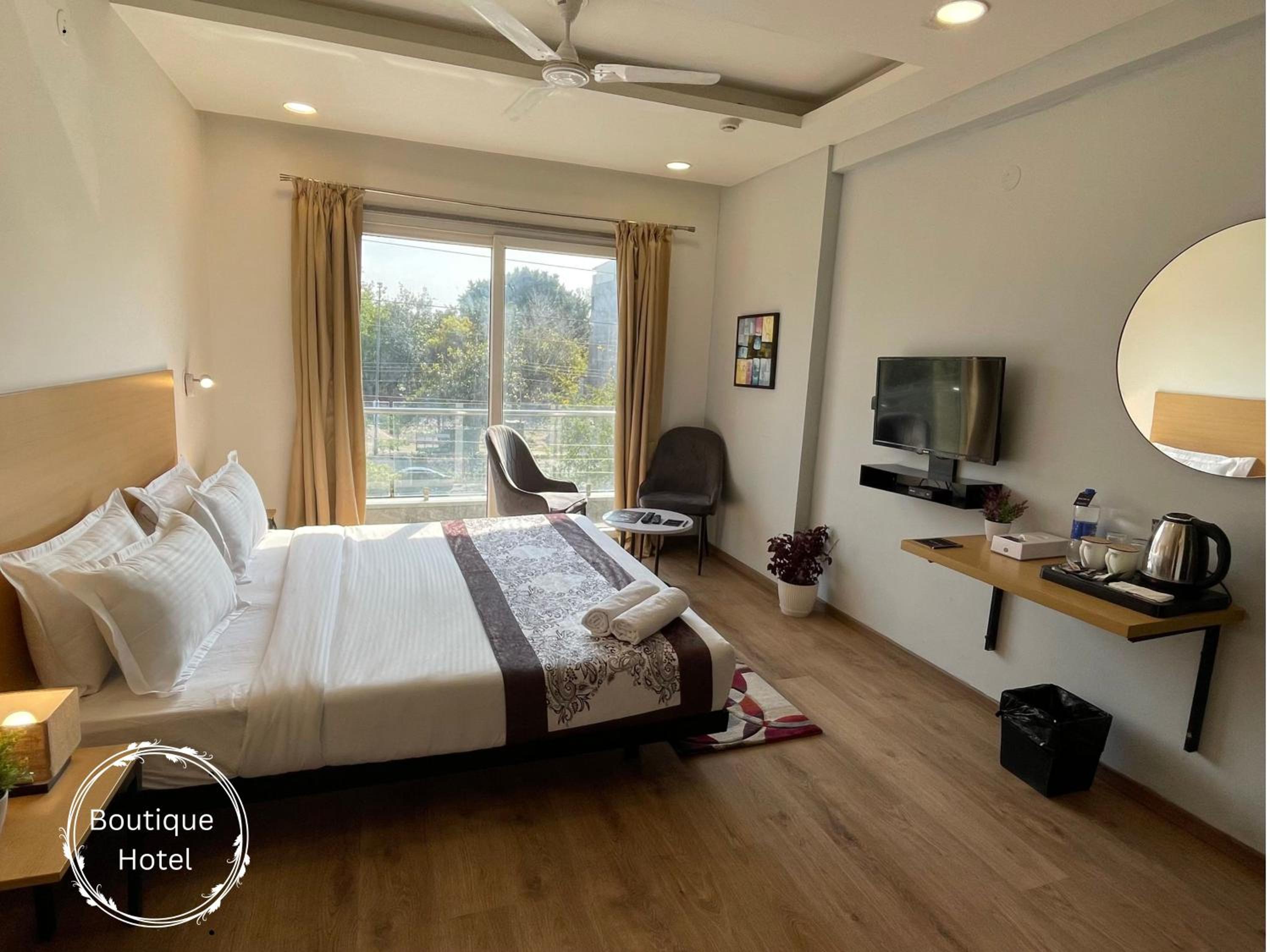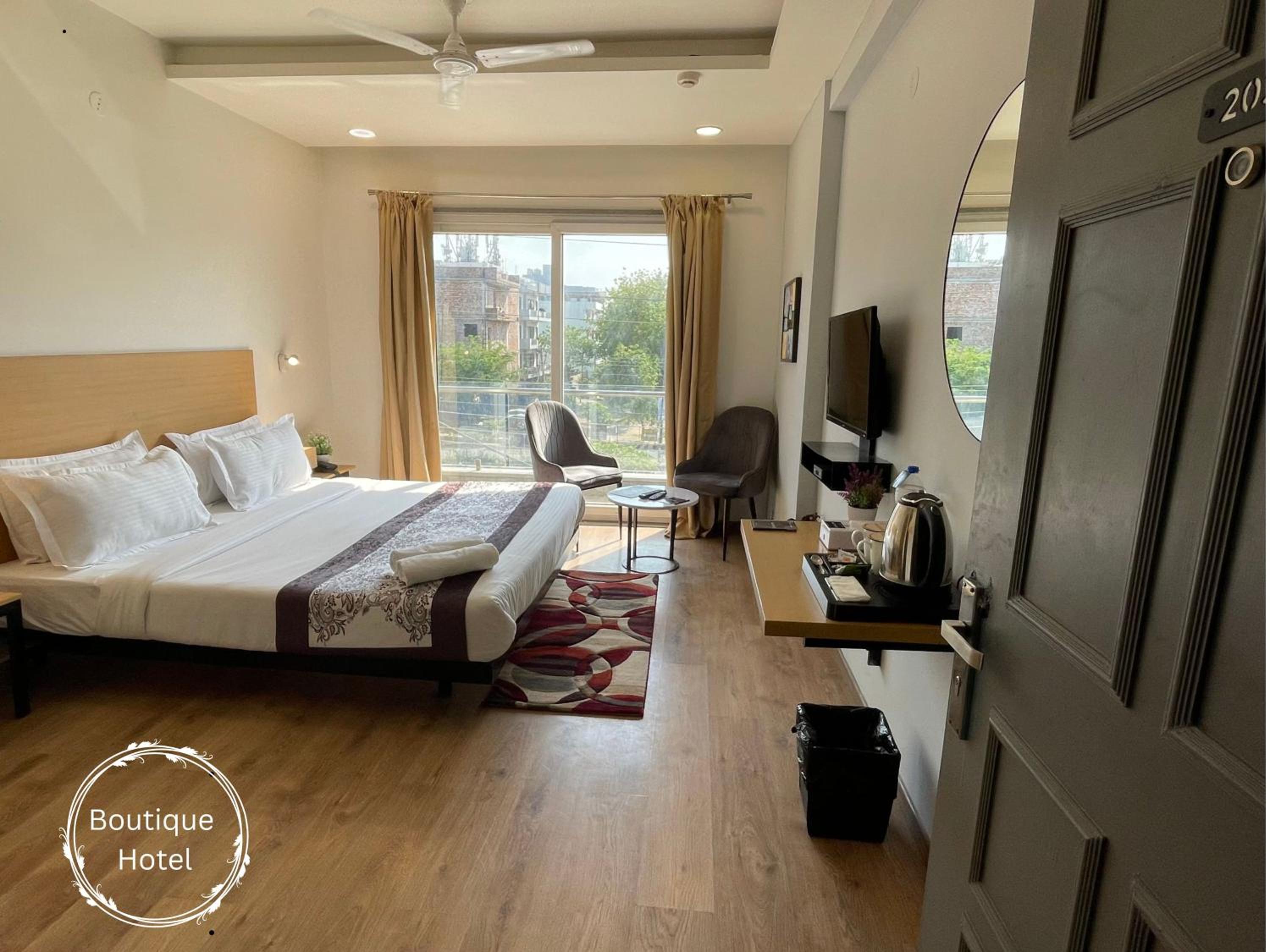 The hotel offers air-conditioned rooms with modern amenities, including a flat-screen TV, private bathroom, and city views from the balcony. Guests can enjoy a relaxing stay with quality bedding and convenient facilities like a kettle.