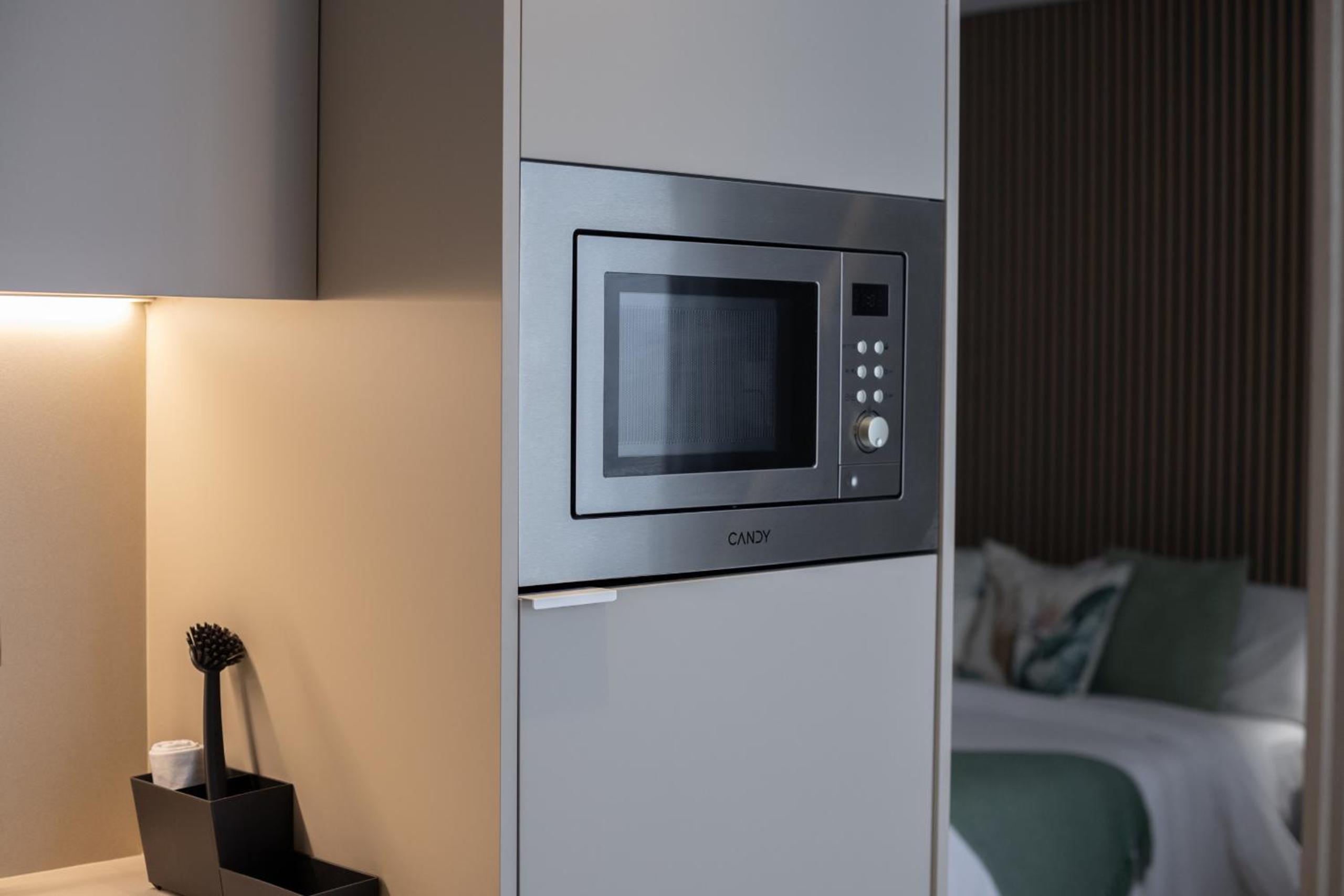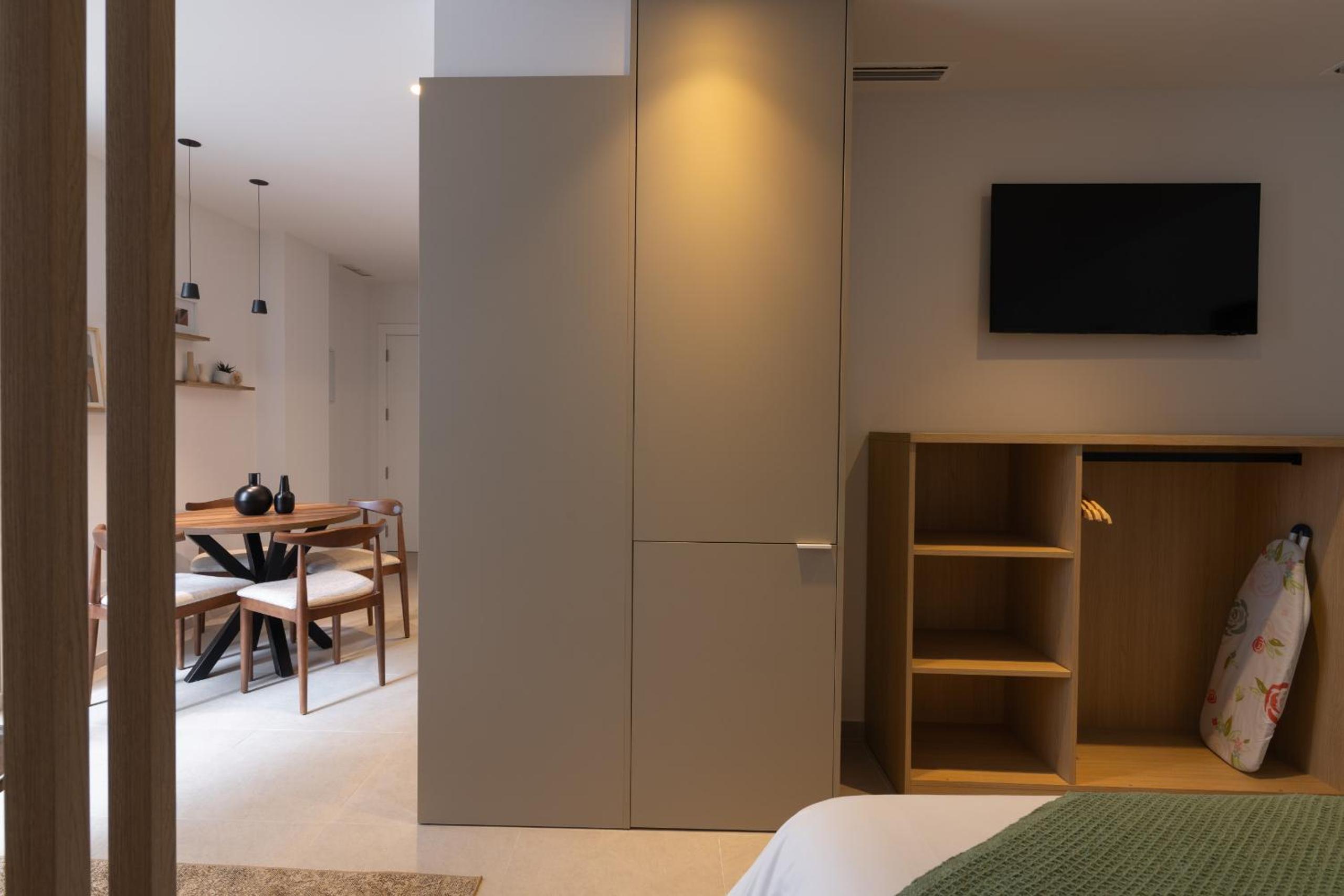 Comfortable Living: Air-conditioned aparthotel with a spacious bedroom, living room, and stylish bathroom.