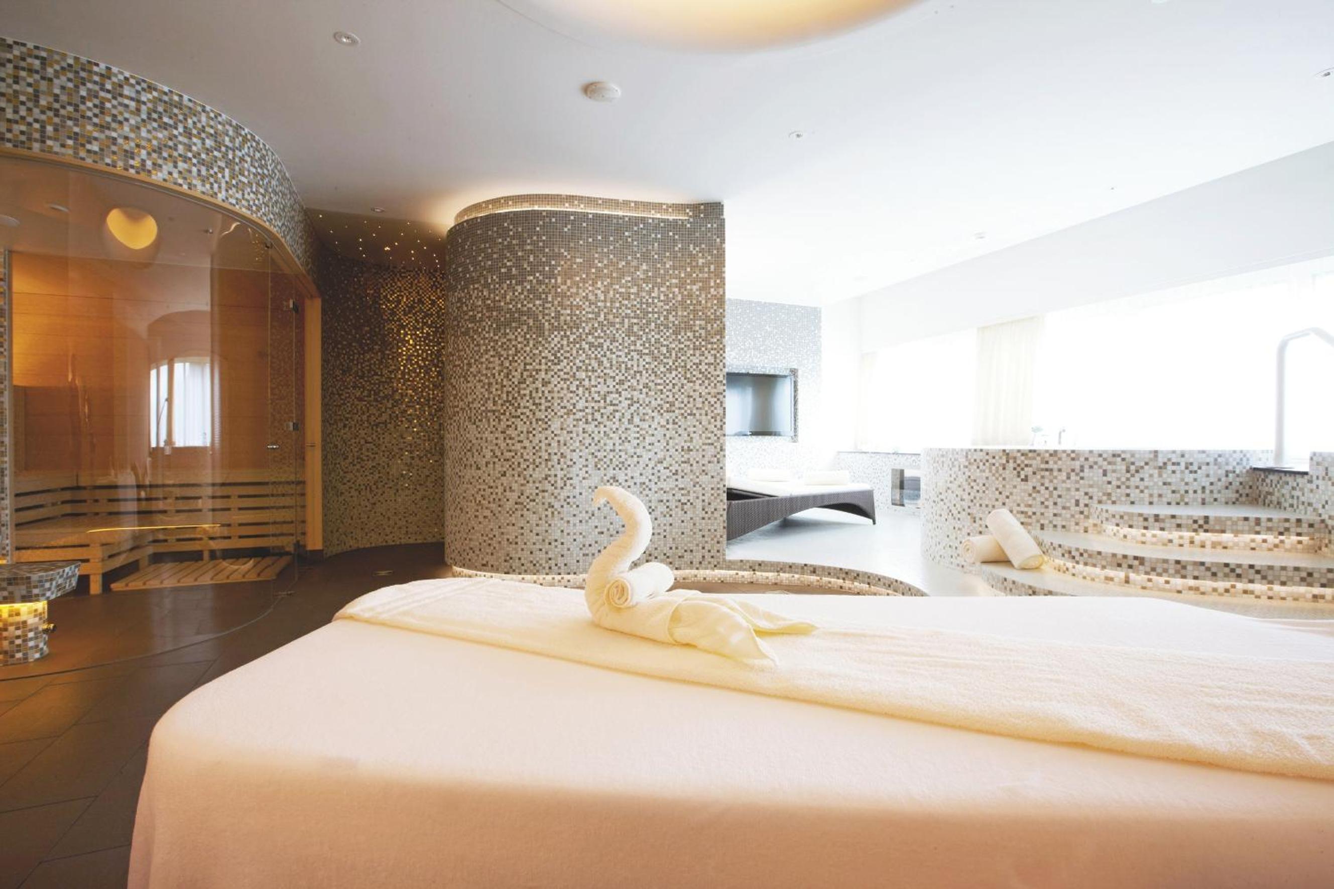 Indulge in relaxation at Oberwaid - Das Hotel's expansive spa featuring a sauna, hot tub, Turkish bath, whirlpools, and more. Enjoy complimentary access to the rejuvenating facilities during your stay.