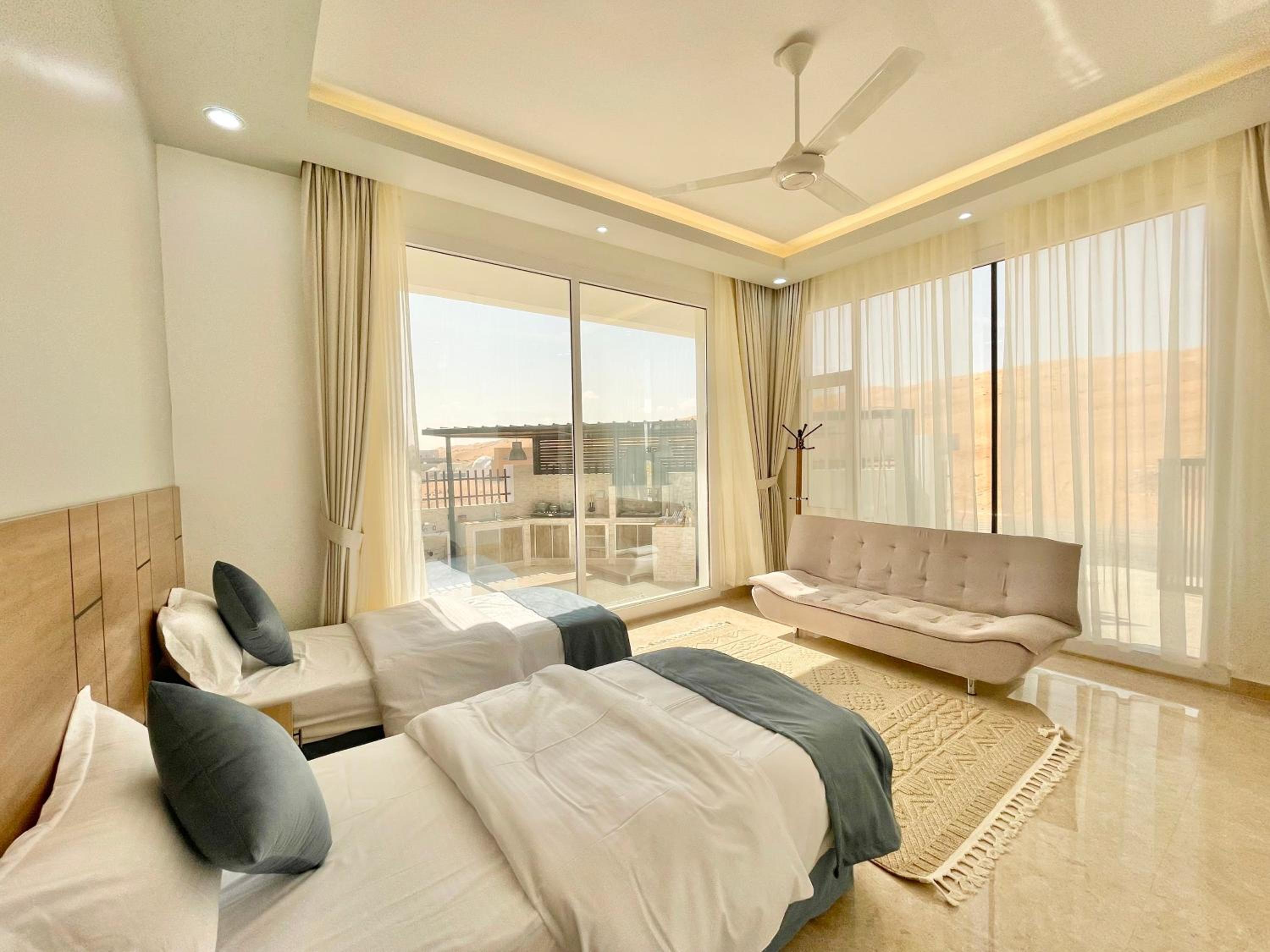 Peaceful, stunning location; you can walk straight out on to the sands and into the dunes, and book private tours and desert experiences direct with the very helpful owner. An extremely comfortable house to return to for rest, relaxation and shade (and delicious treats freely delivered daily) after desert activities. We were welcomed incredibly warmly by the owner and staff, our children adored it and we all want to return. We would highly recommend this property to families.