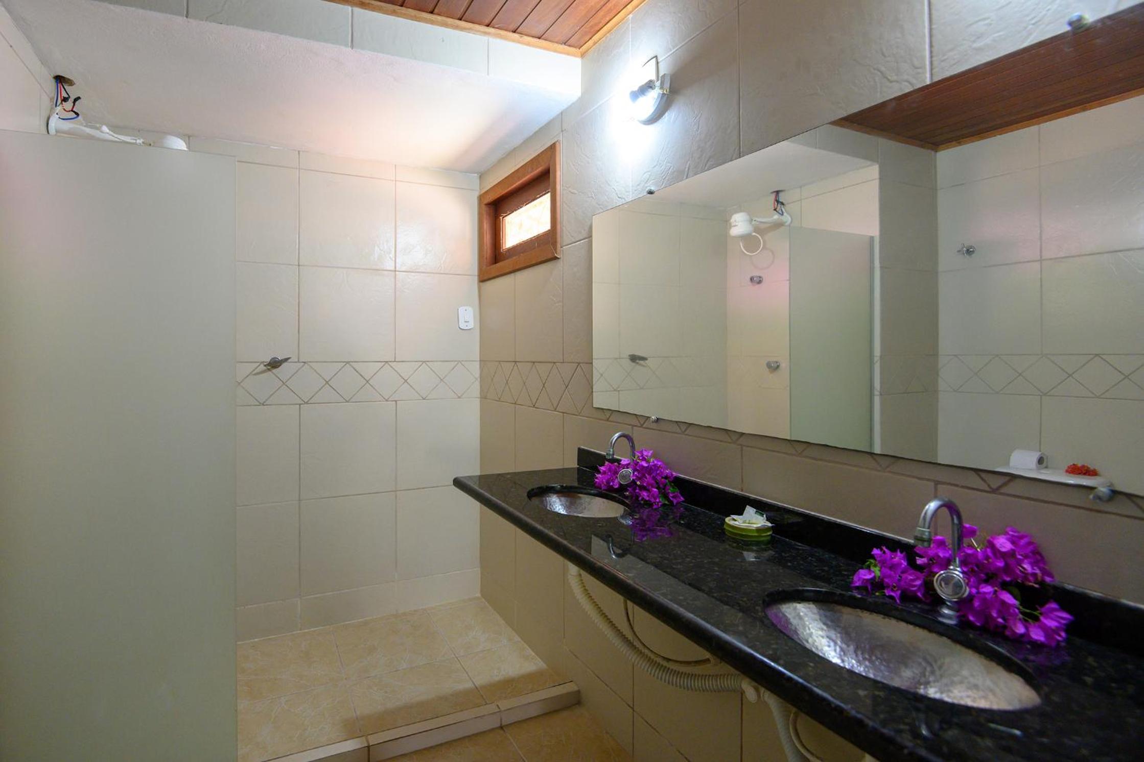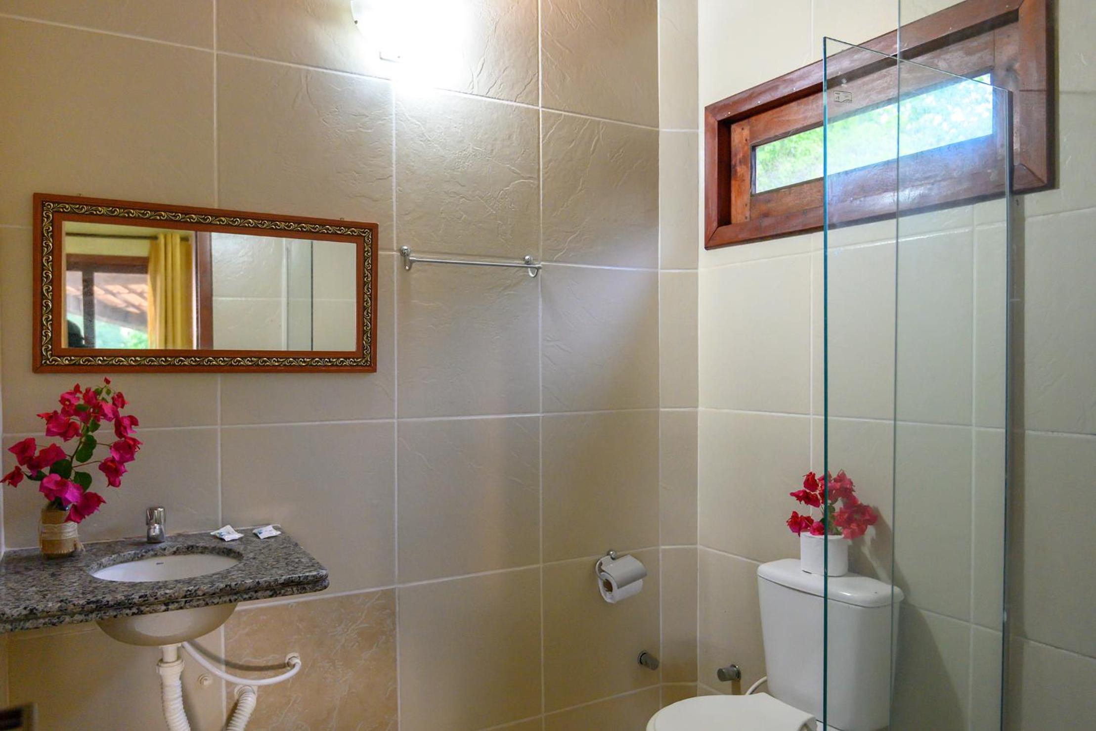 Quarto bem espaçoso, banheiro com chuveiro elétrico, espelho no banheiro e no quarto, cabideiro