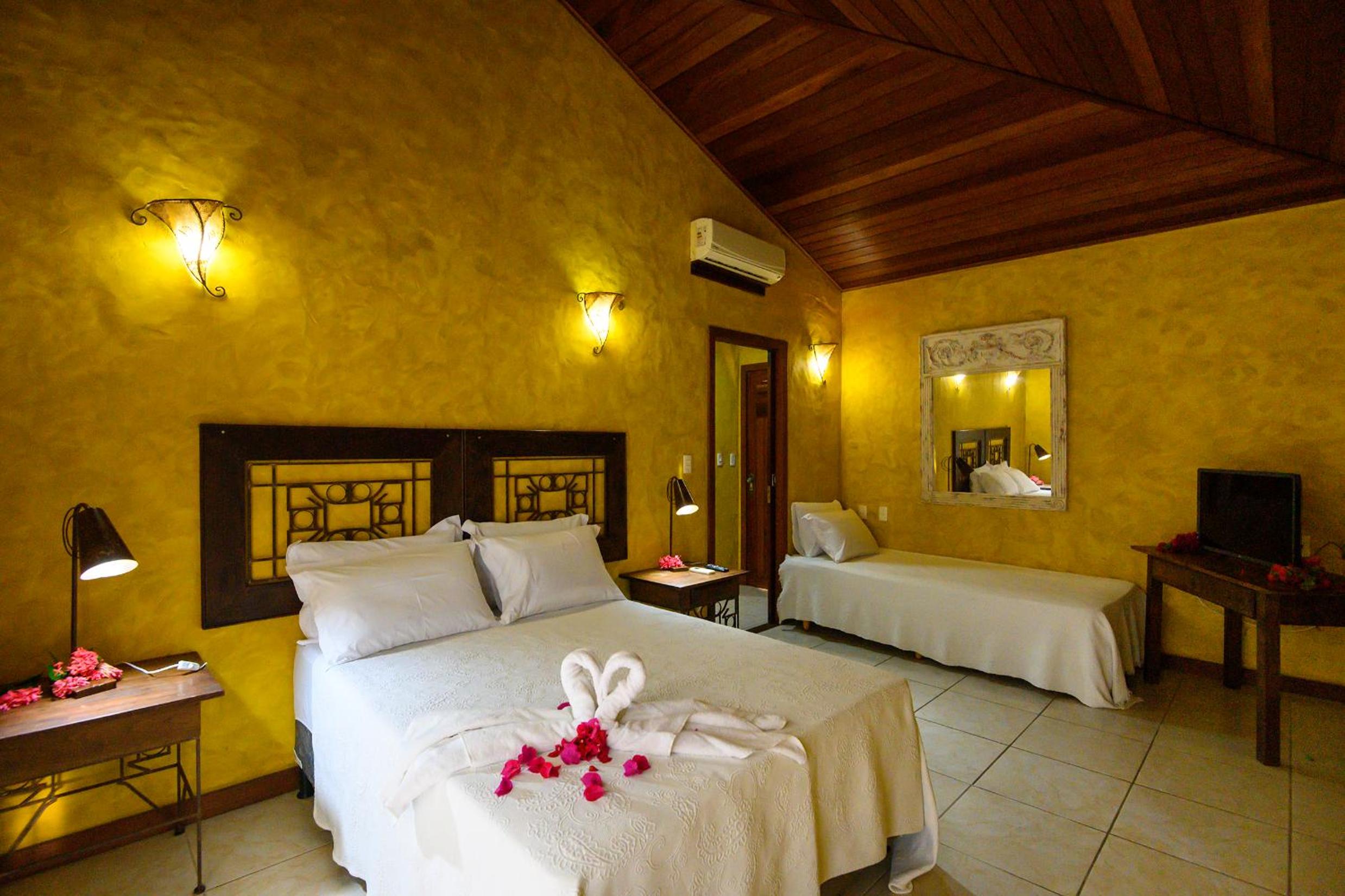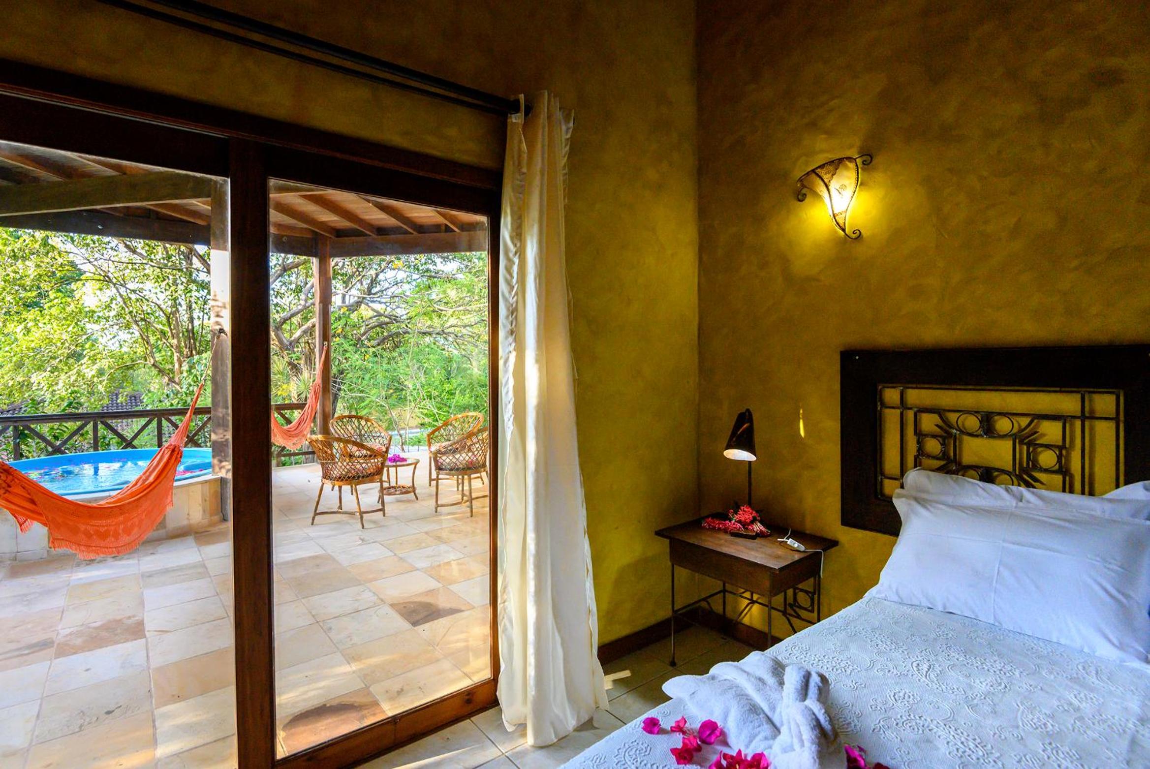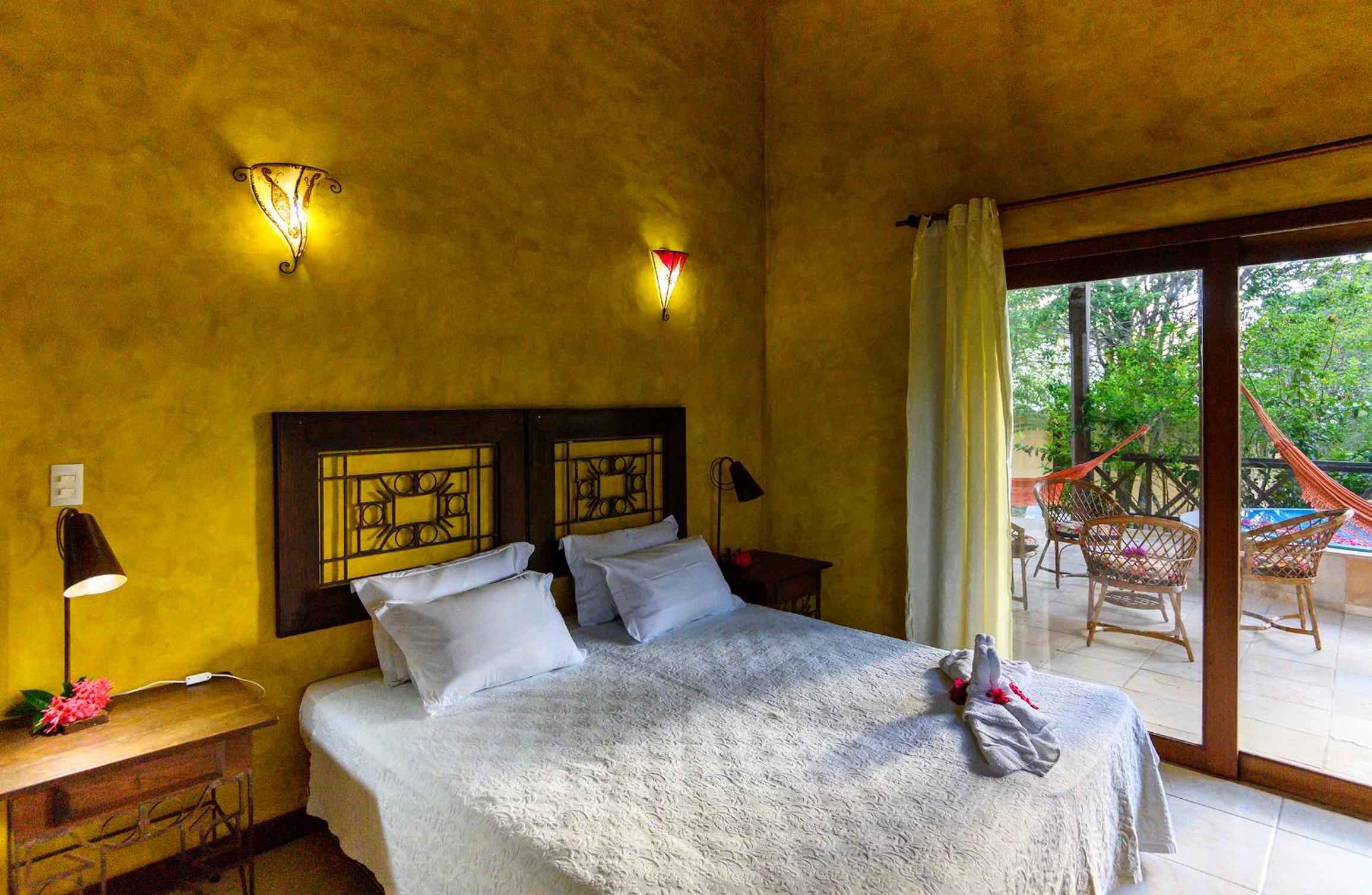 The rooms at Lago Hotel seamlessly blend rustic charm with modern amenities like air conditioning and TV. Step out onto your private balcony, complete with a hammock, and soak in the picturesque garden views.