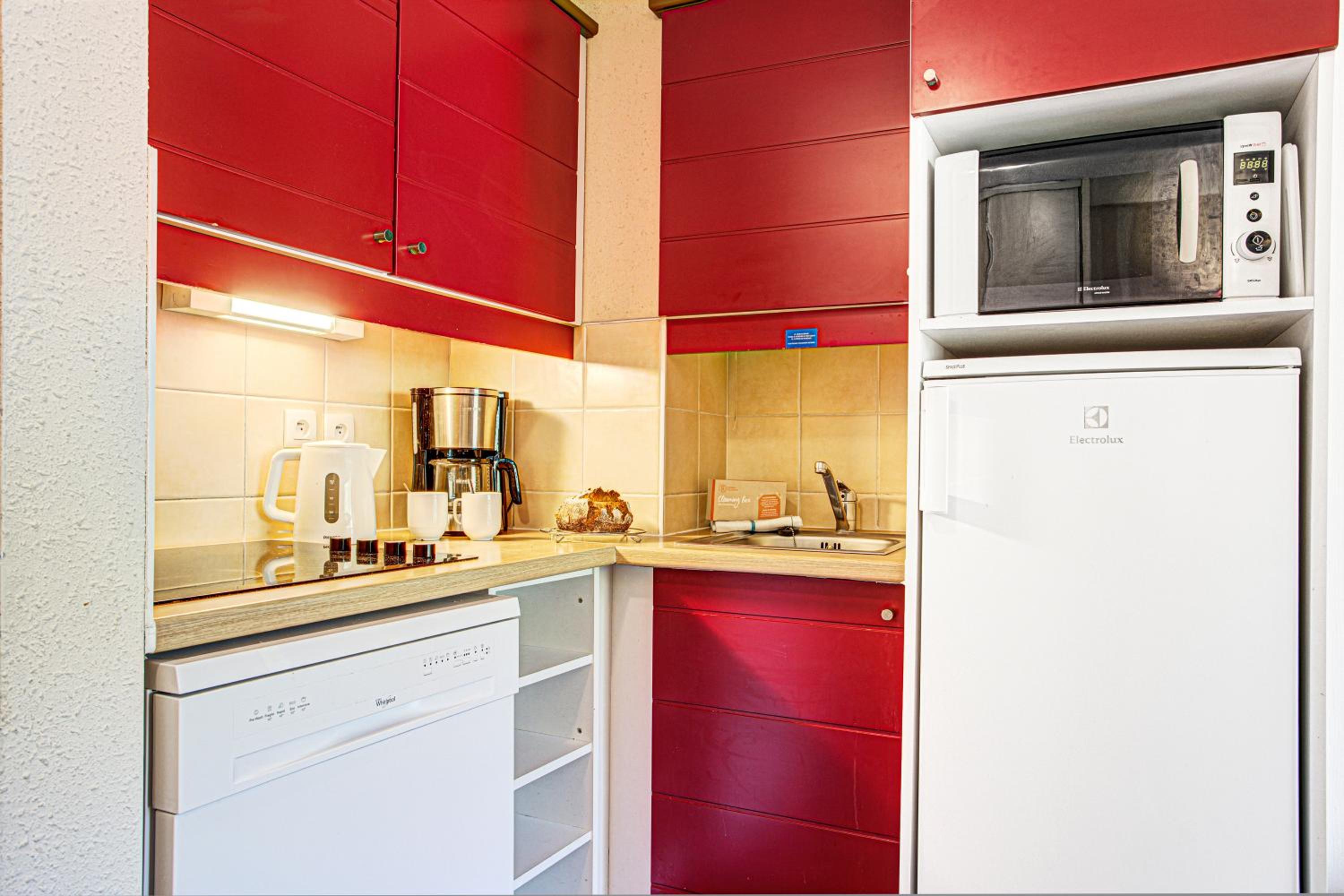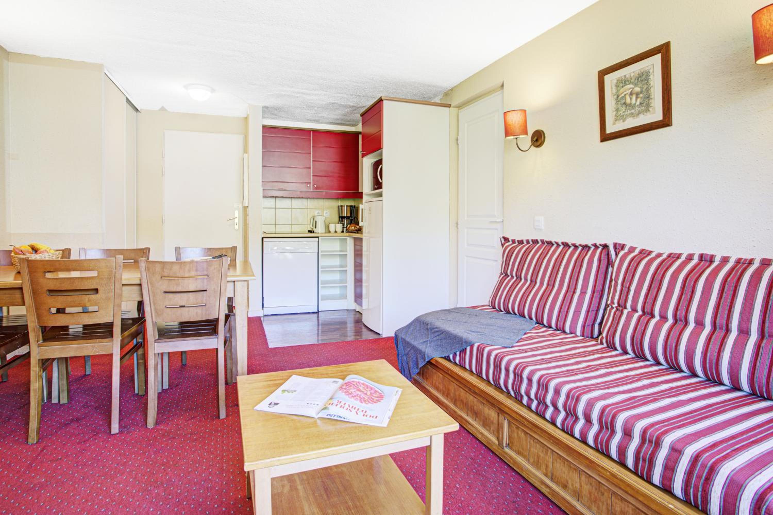 Experience comfort and convenience at Résidence Pierre & Vacances Pyrenees 2000 Le Séquoia with spacious living areas, TVs, and kitchenettes in every apartment.