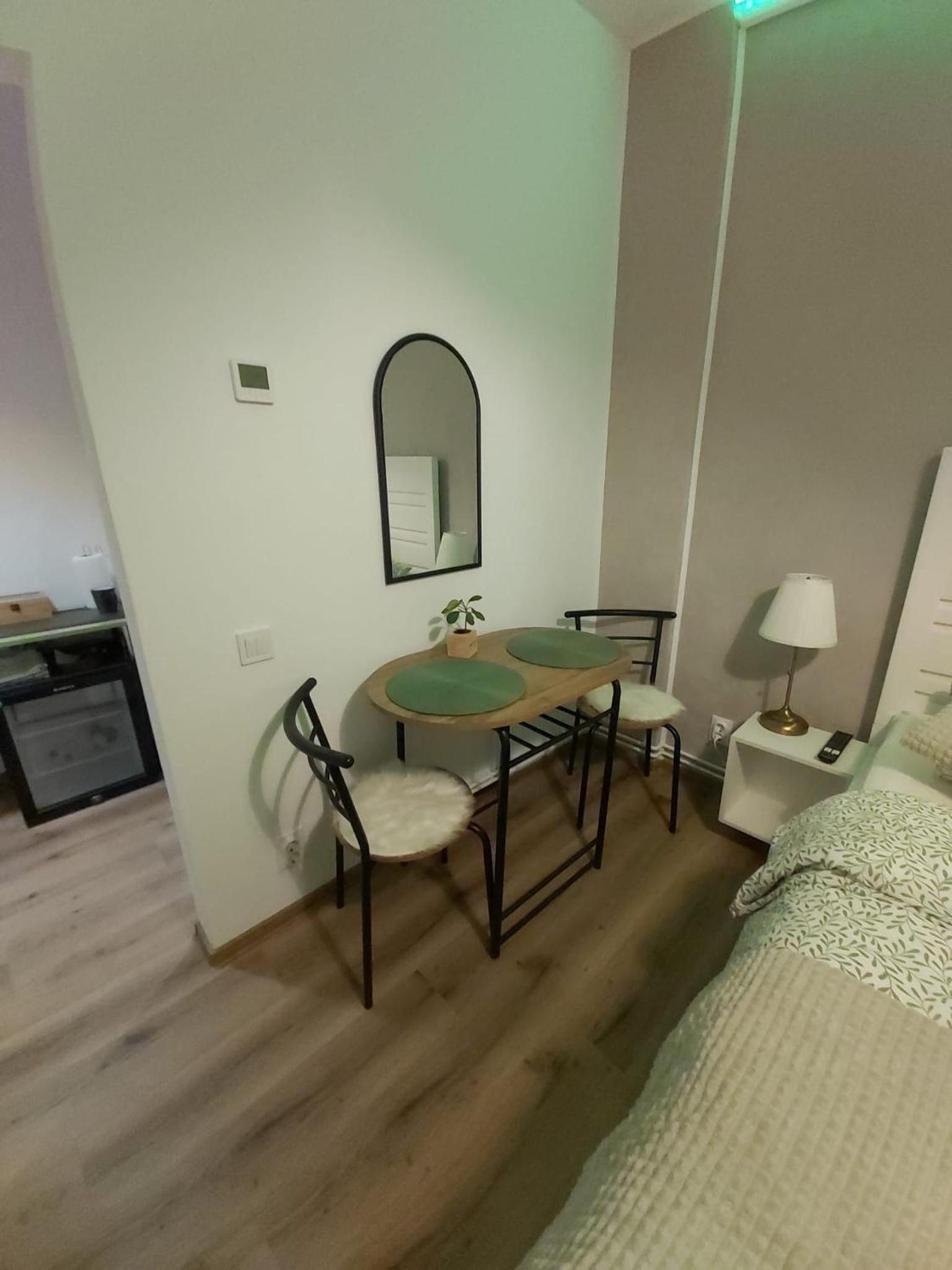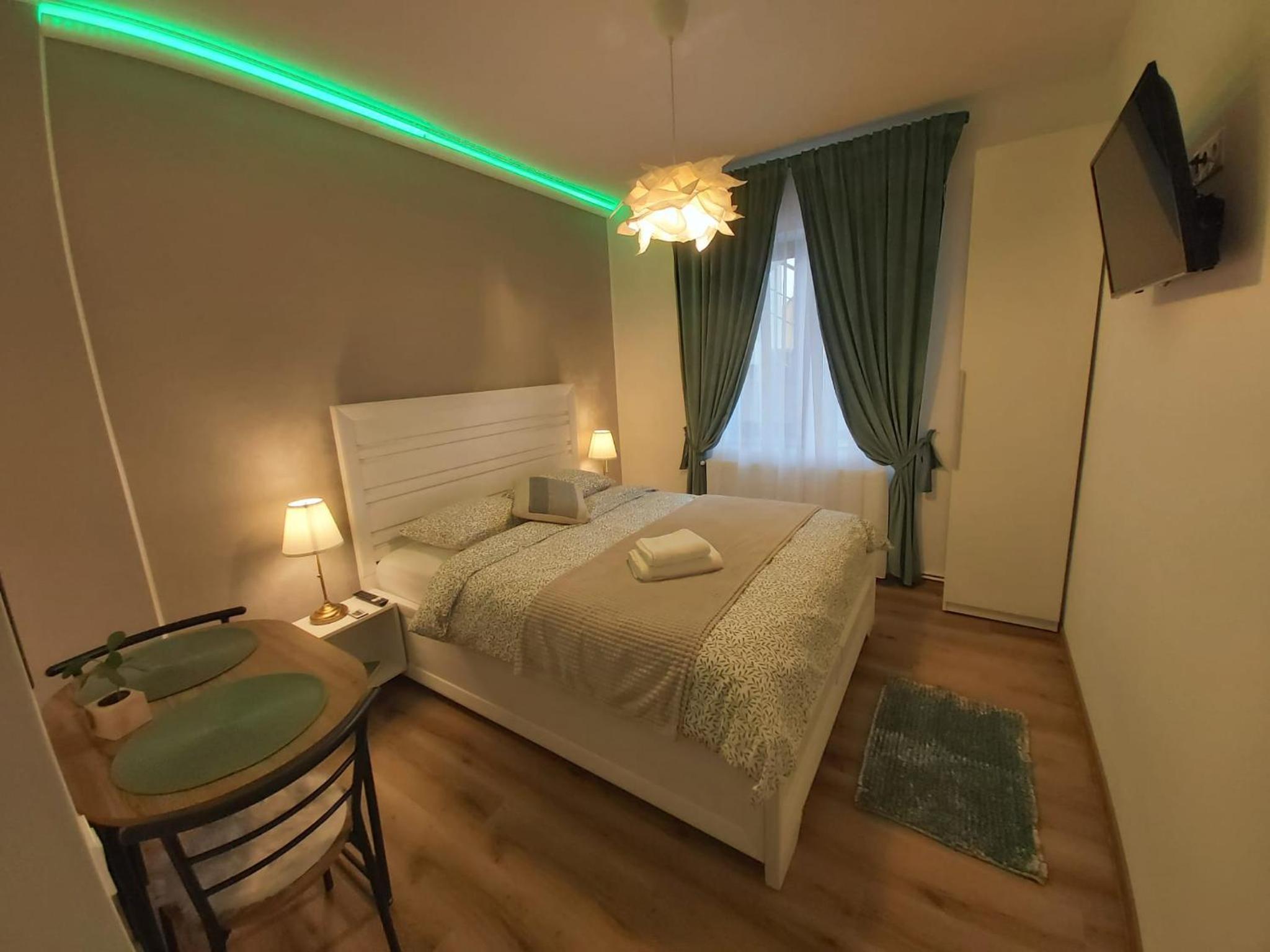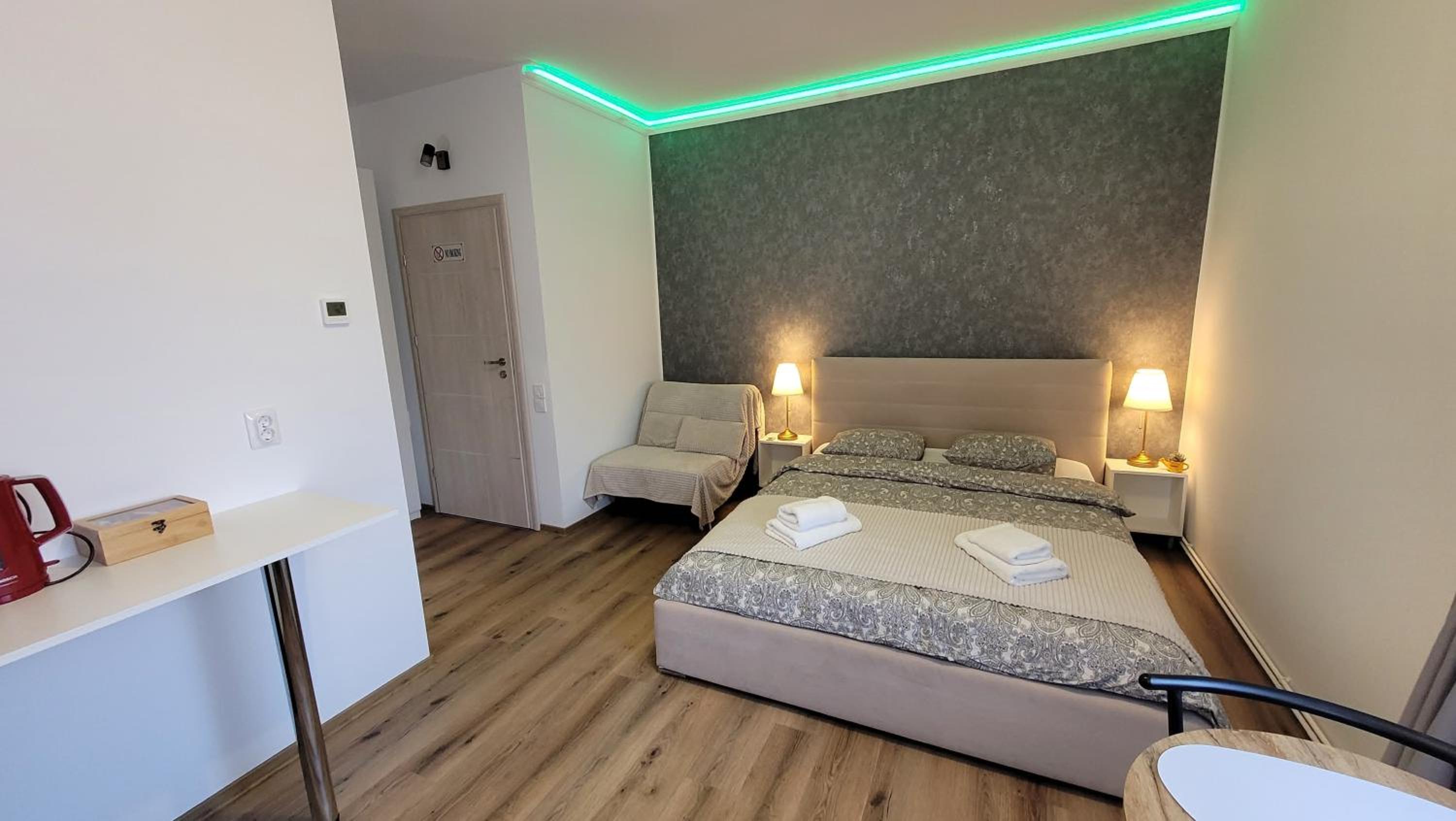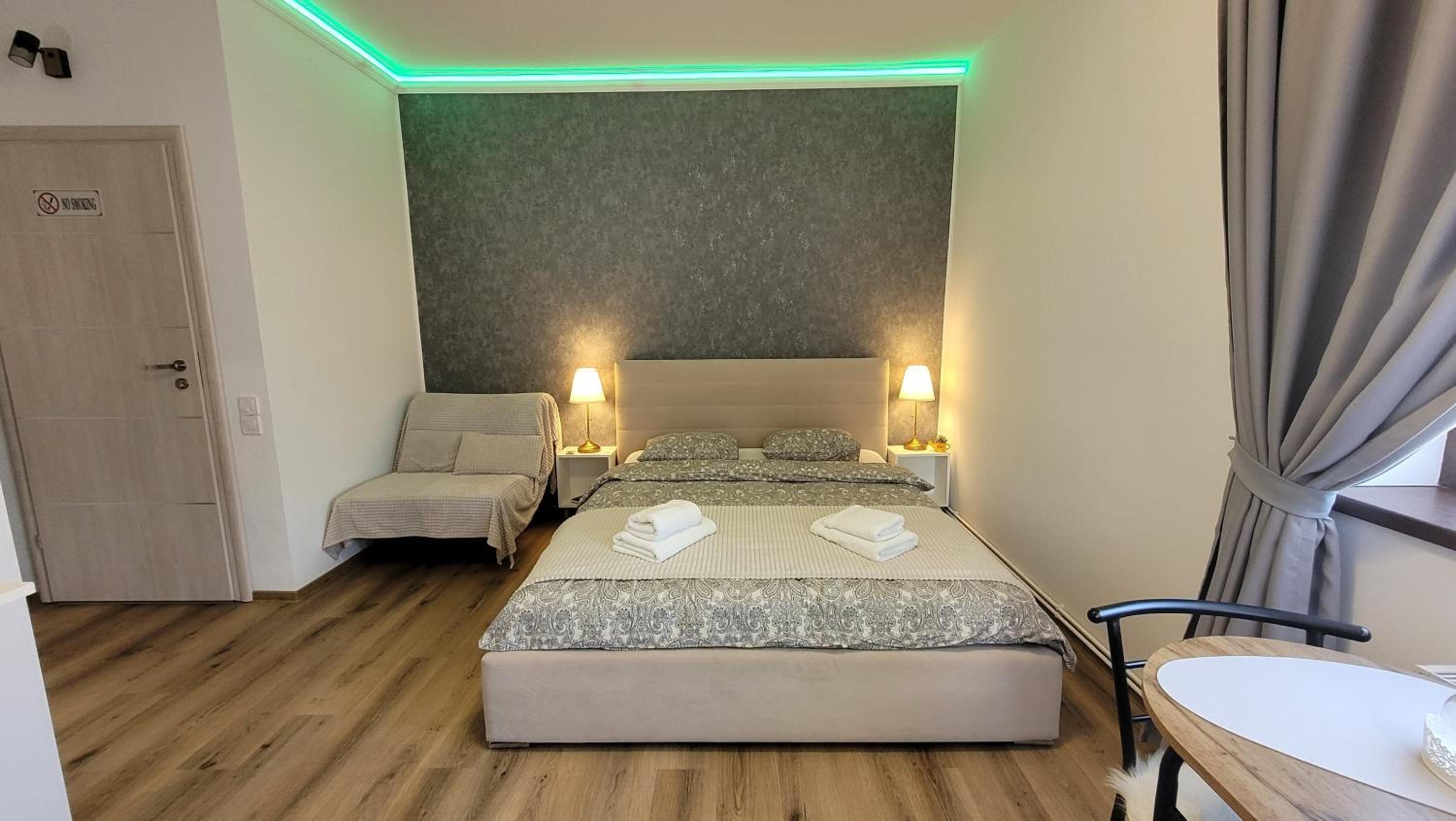 Deși camera este micuța, a fost dotata cu toate lucrurile de care am avut nevoie inclusiv pahare, aparat de cafea si cuptor cu microunde. În același timp, spațiul este decorat modern, foarte curat si inspira o atmosfera plăcută si romantica datorita led-urilor. Recomand cu încredere, vom reveni cu siguranta!