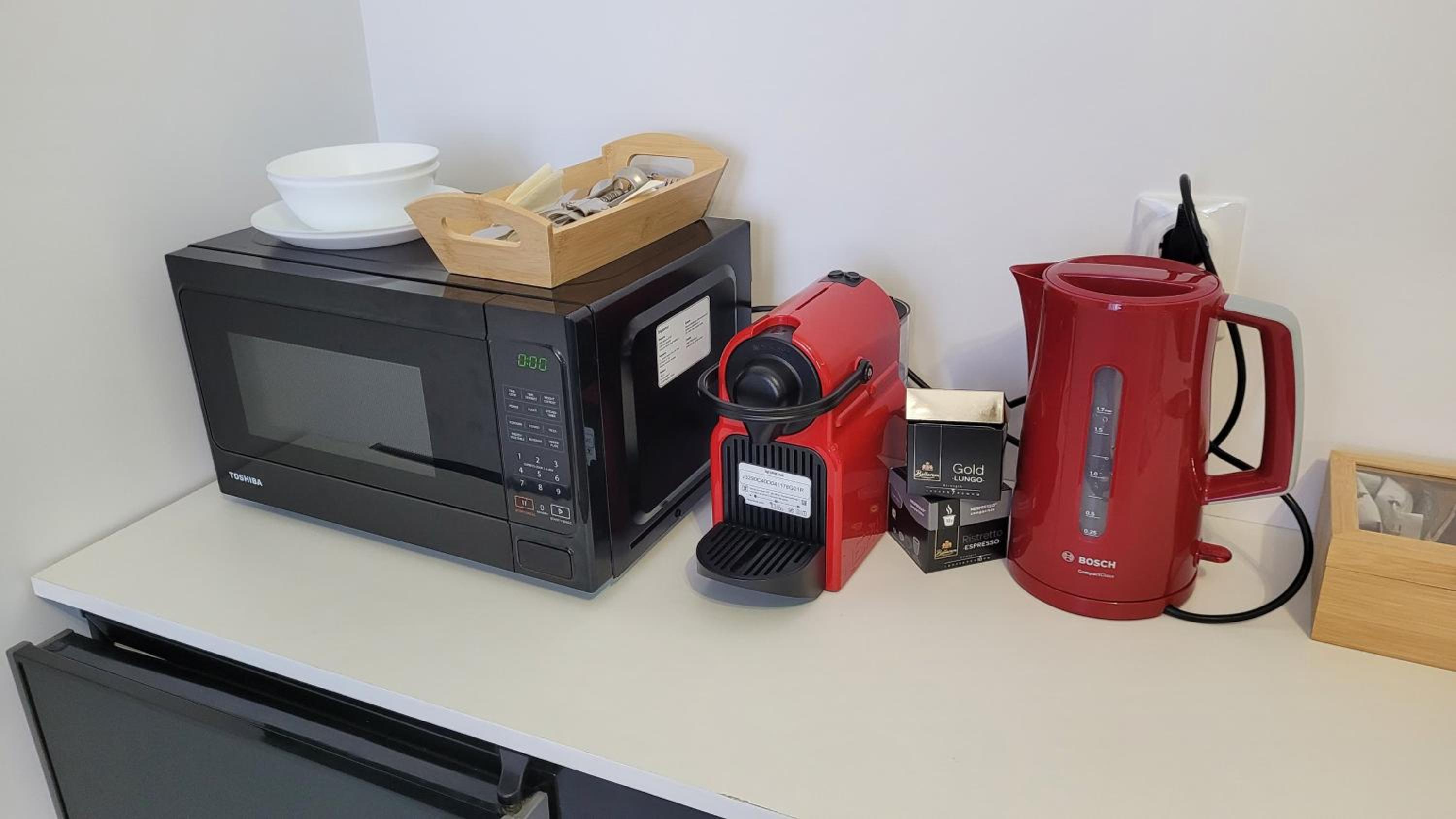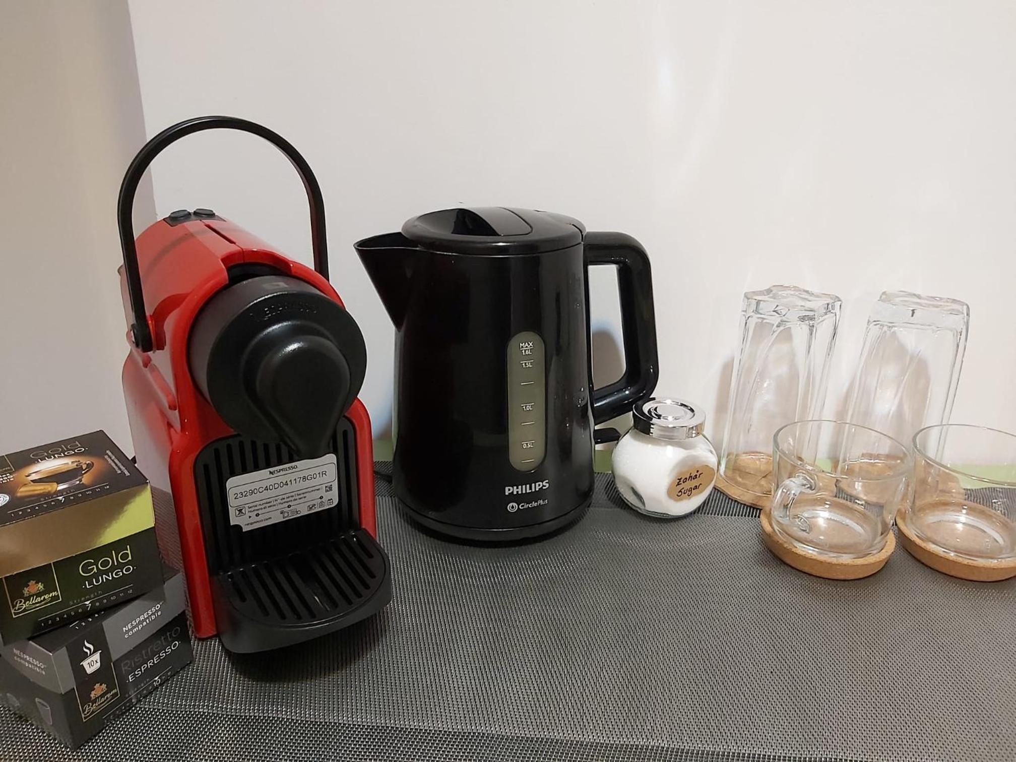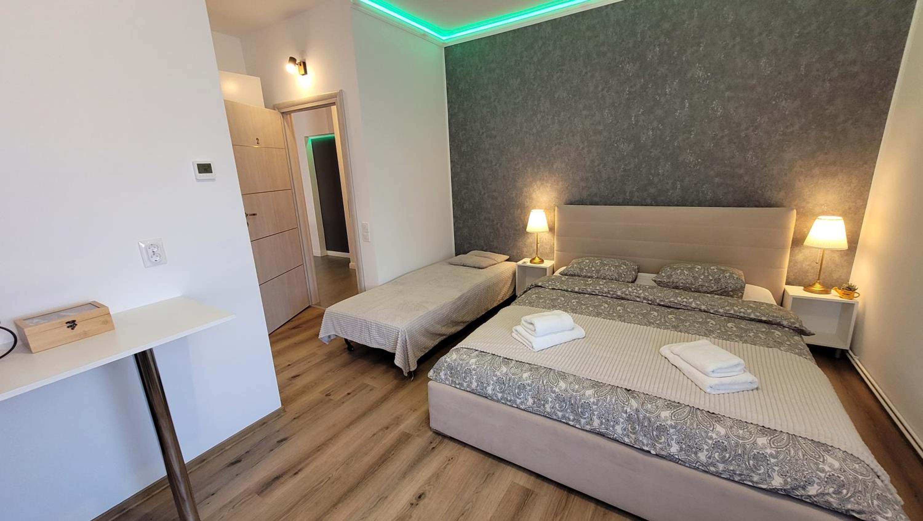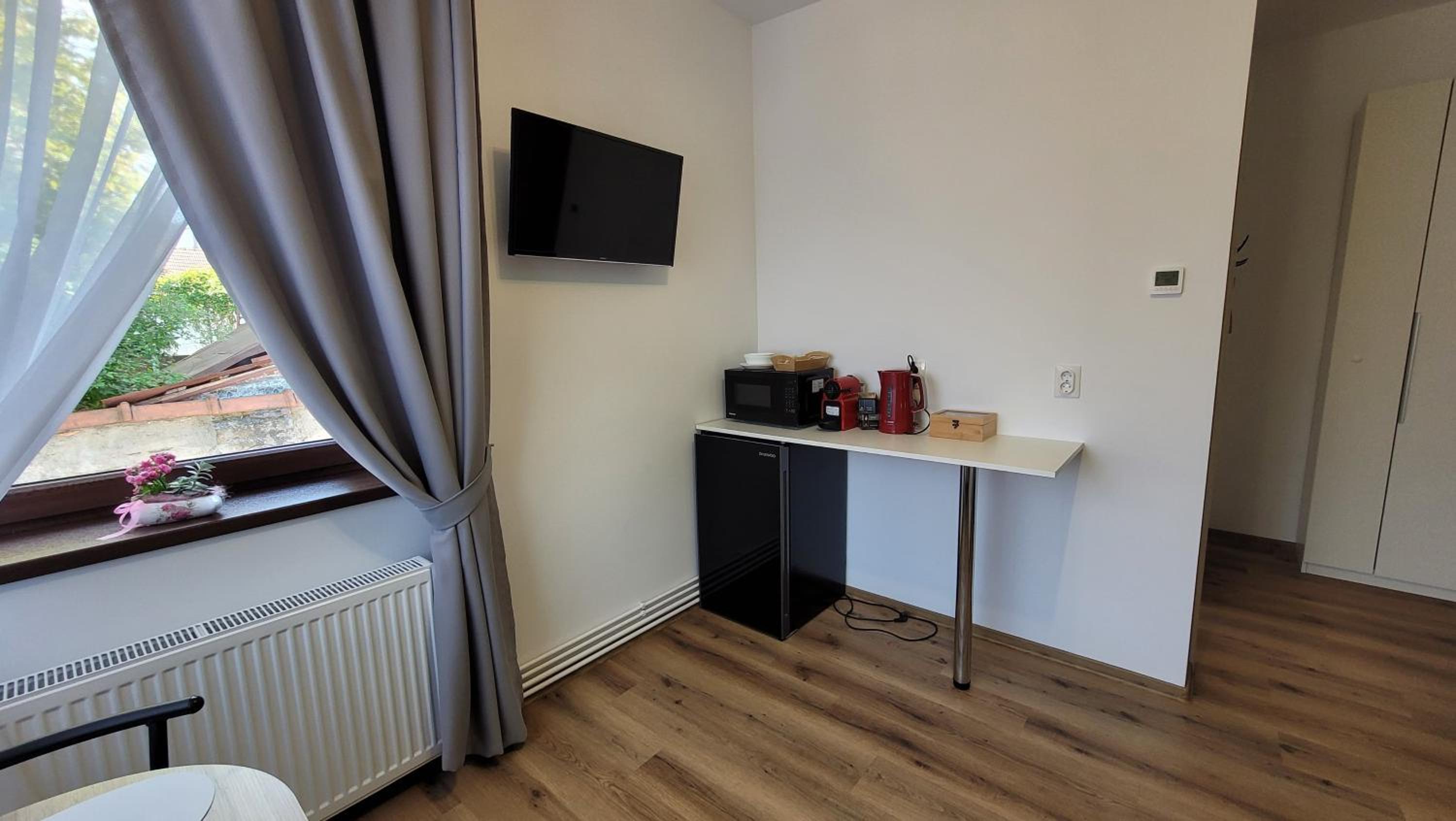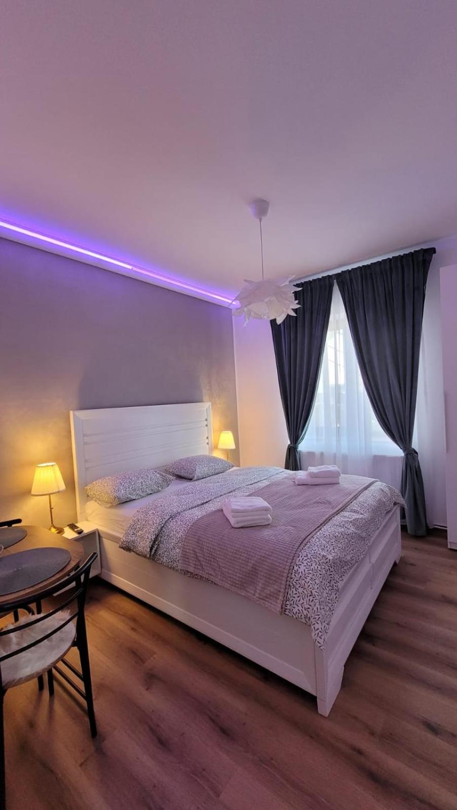 Deși camera este micuța, a fost dotata cu toate lucrurile de care am avut nevoie inclusiv pahare, aparat de cafea si cuptor cu microunde. În același timp, spațiul este decorat modern, foarte curat si inspira o atmosfera plăcută si romantica datorita led-urilor. Recomand cu încredere, vom reveni cu siguranta!