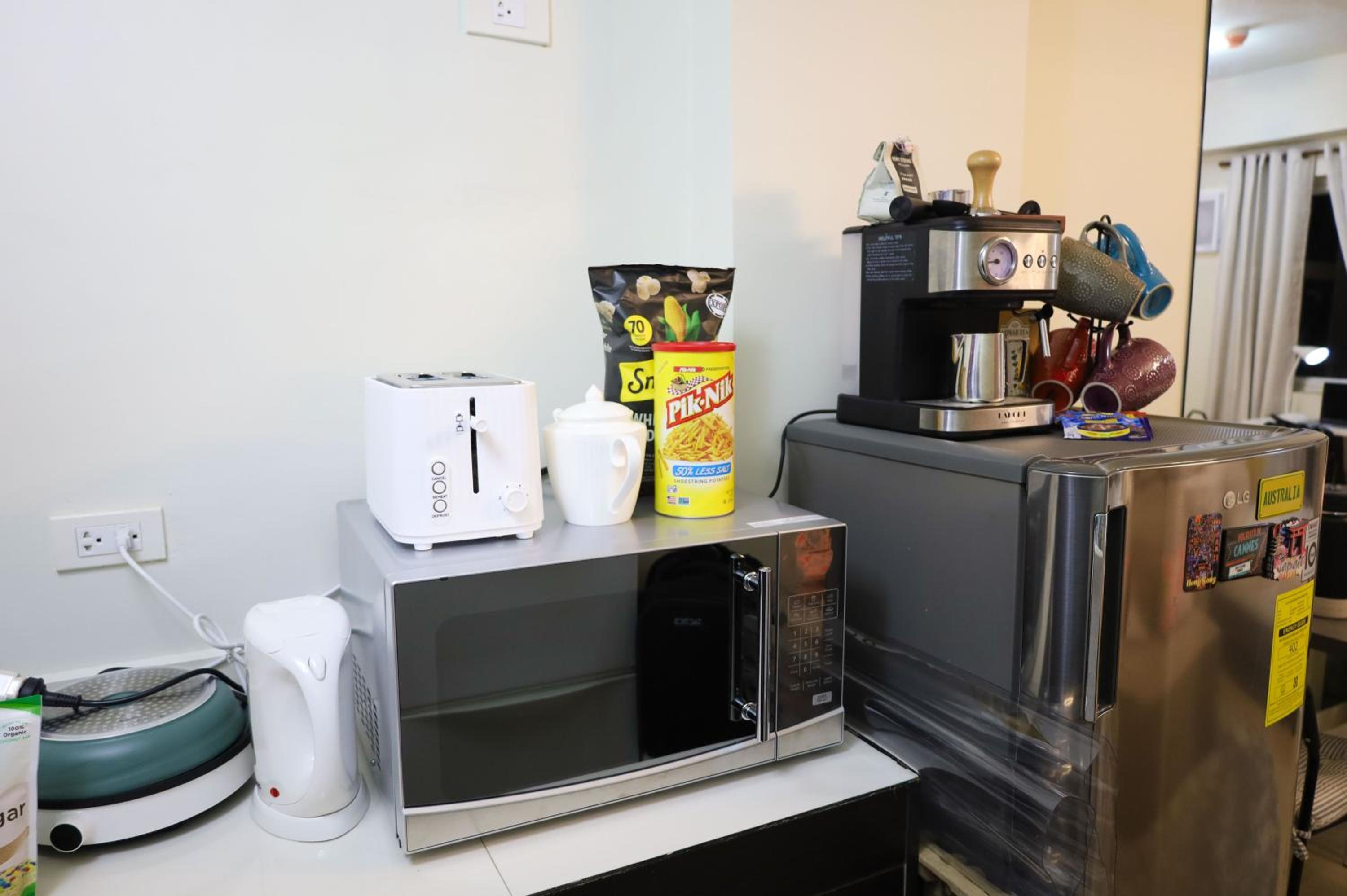 Relax in the well-equipped 1-bedroom suite featuring a flat-screen TV, kitchenette with a microwave, and a cozy living room, providing a comfortable retreat after a day of exploring Manila.