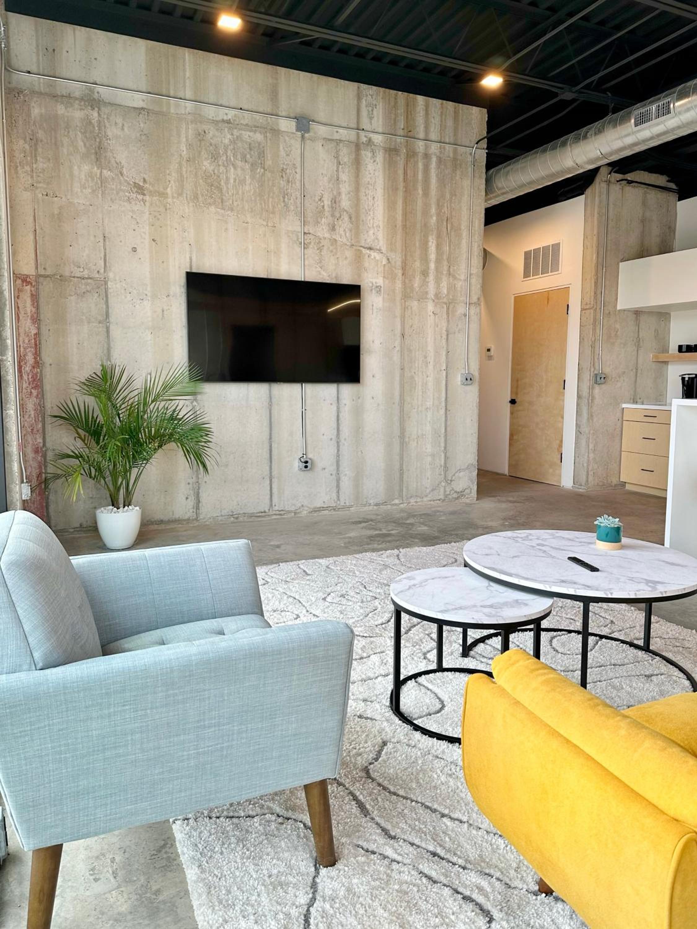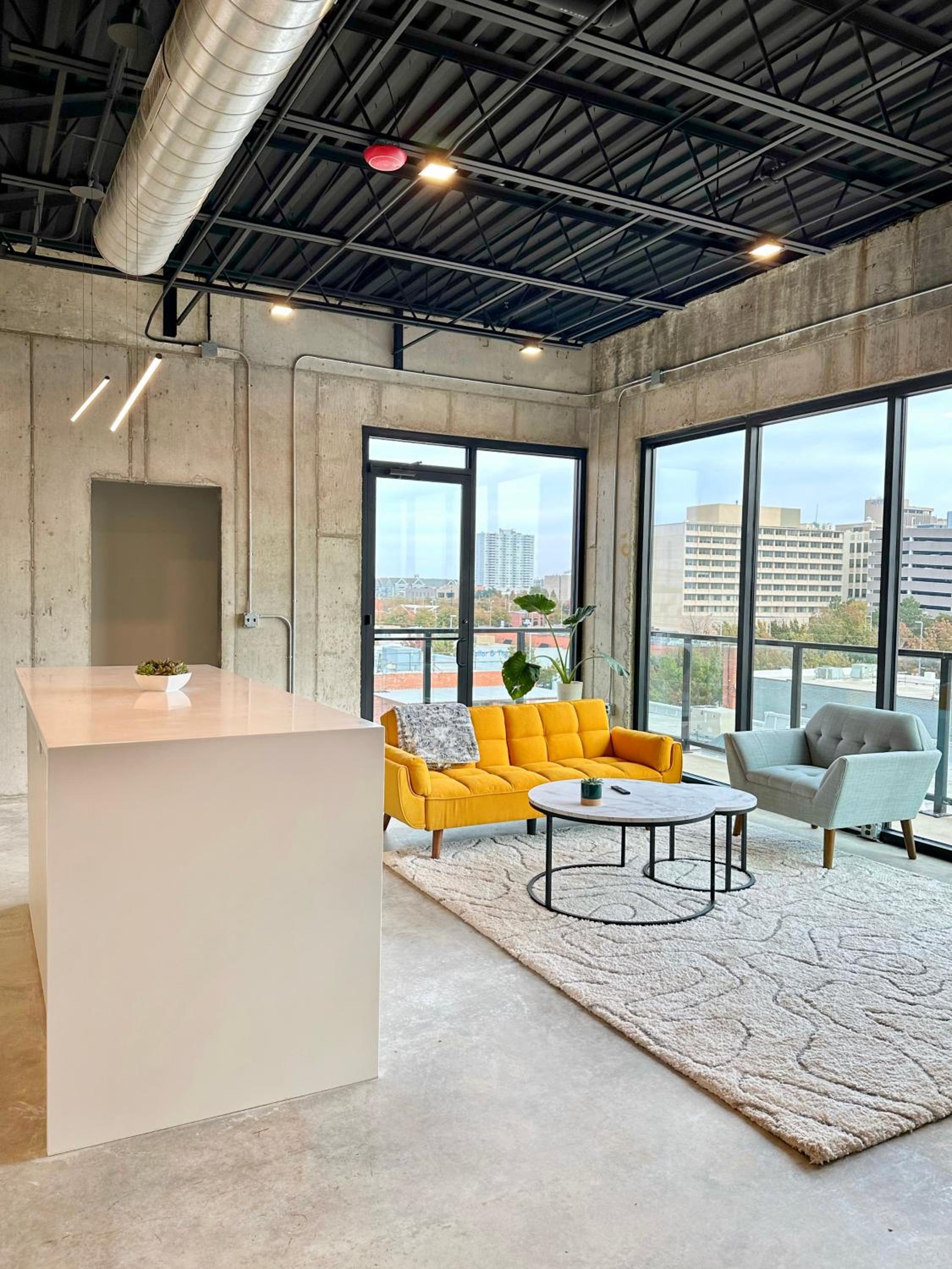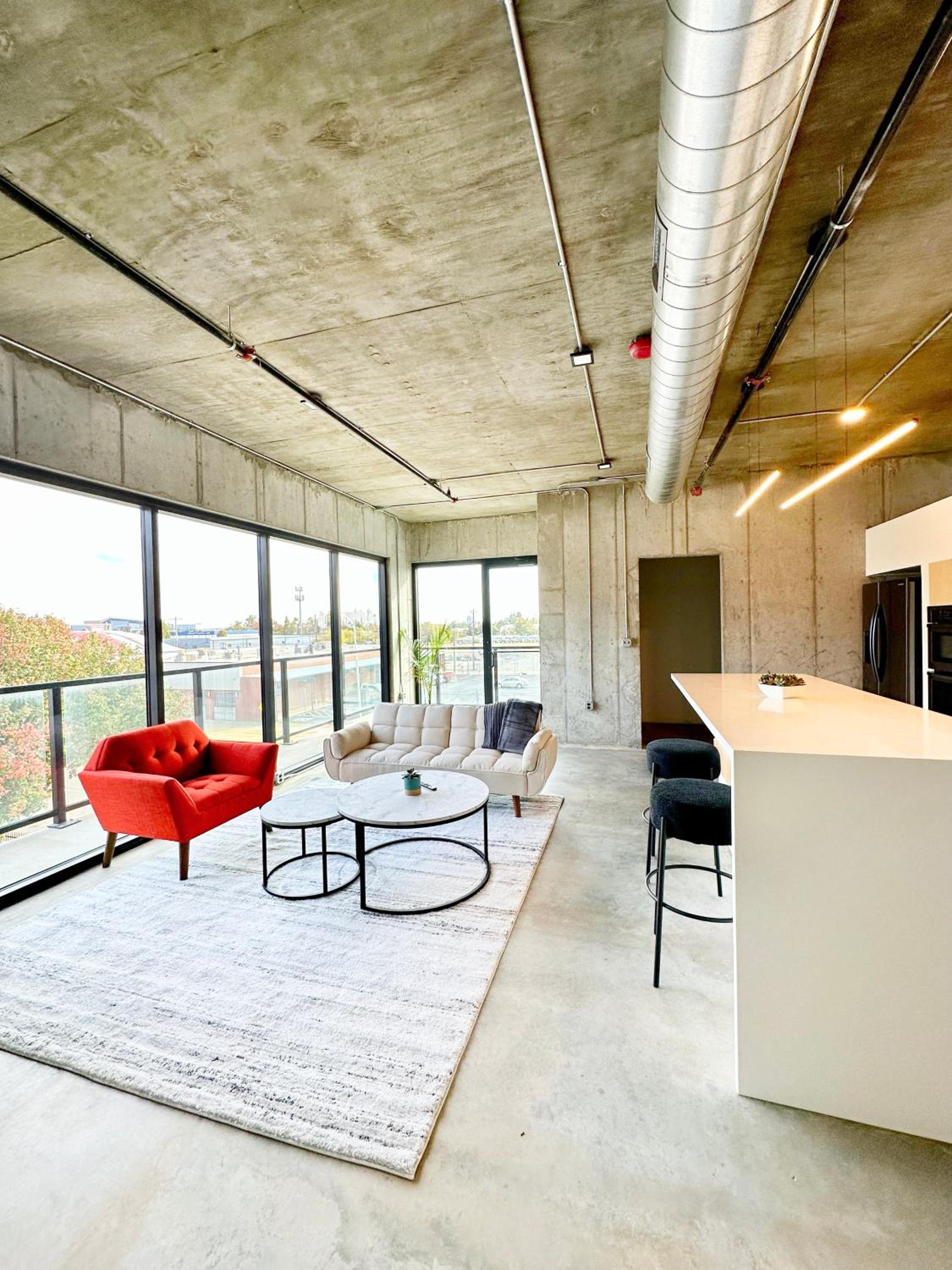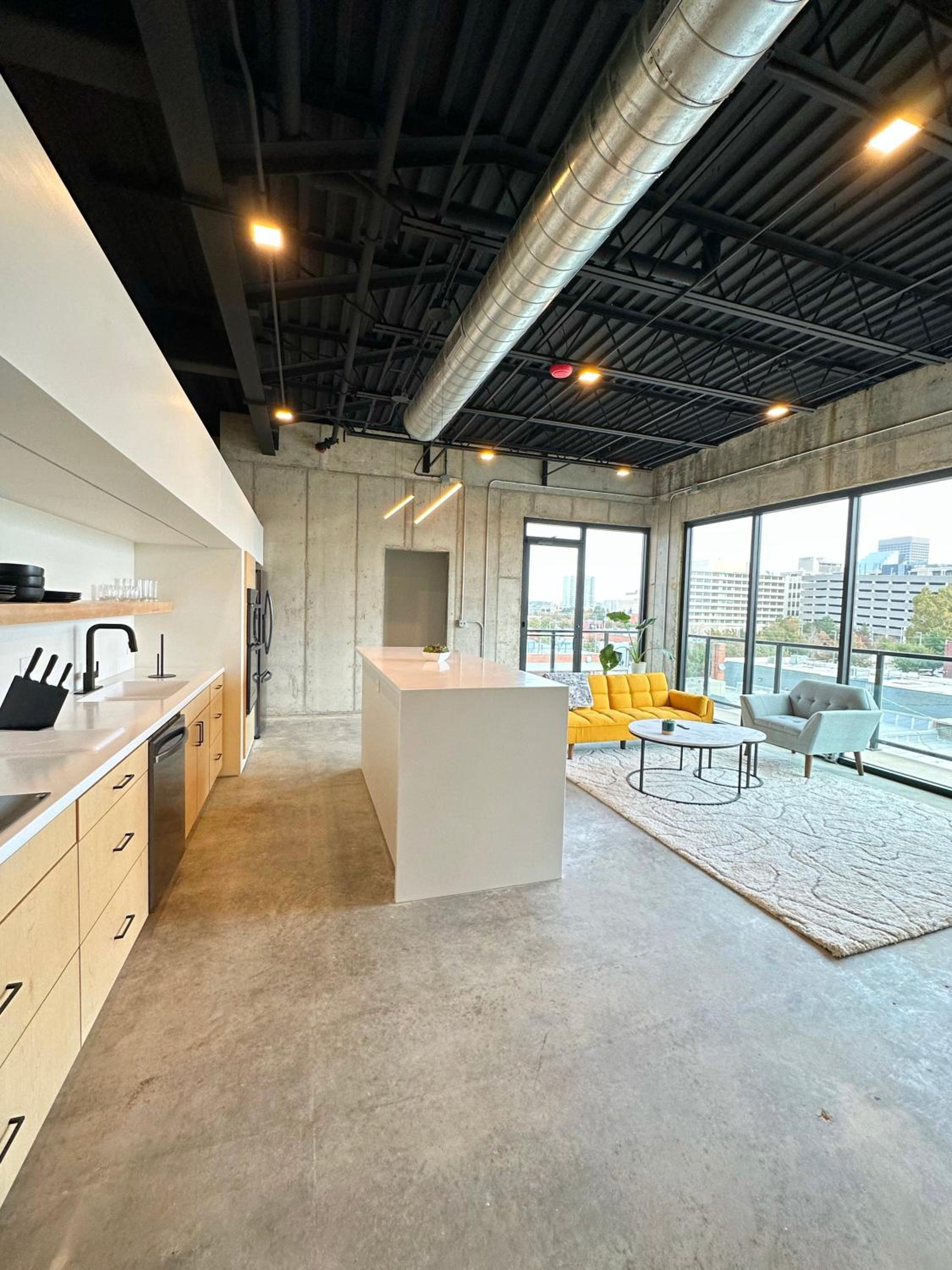 Experience luxury in the heart of Oklahoma City with 2 bedrooms, 2 bathrooms, a fully equipped kitchen, and a spacious living room with a flat-screen TV.