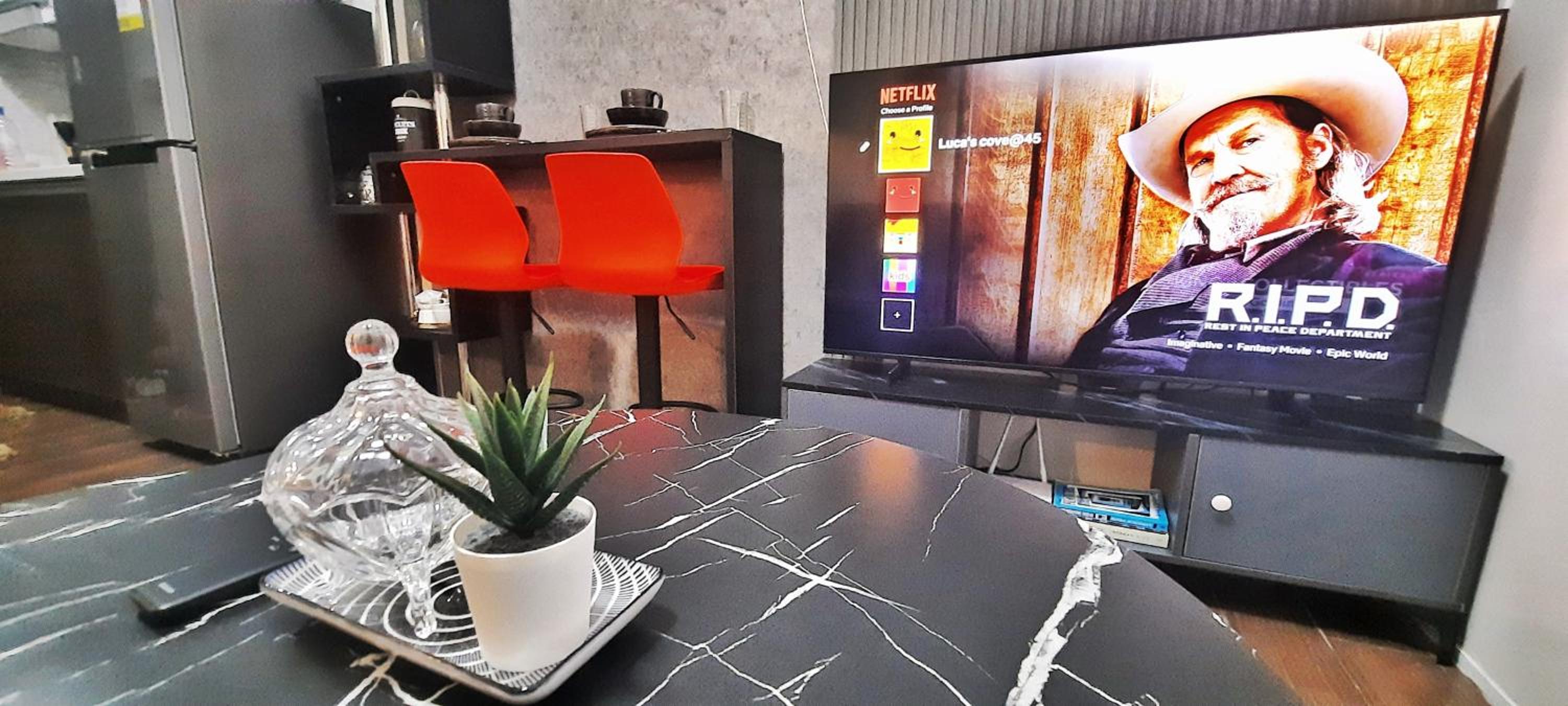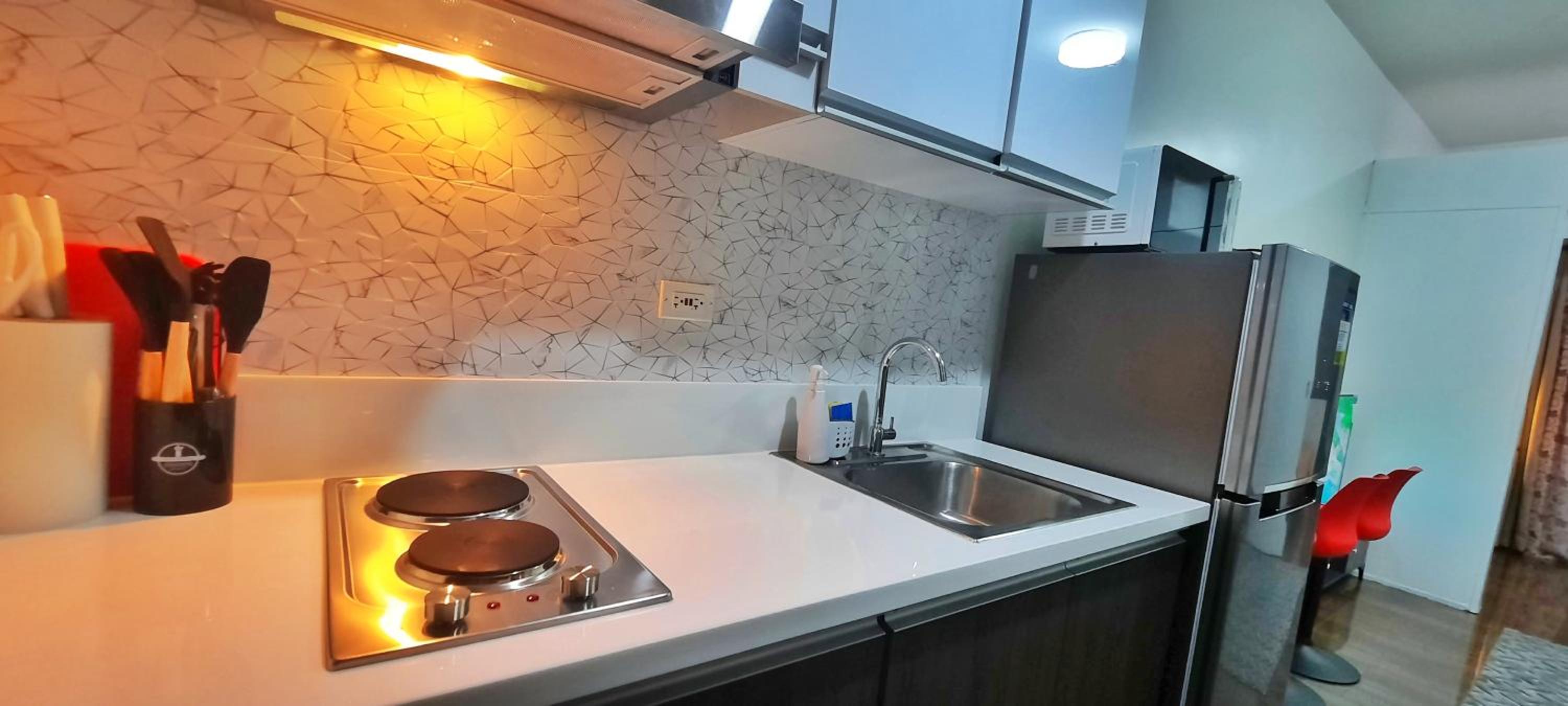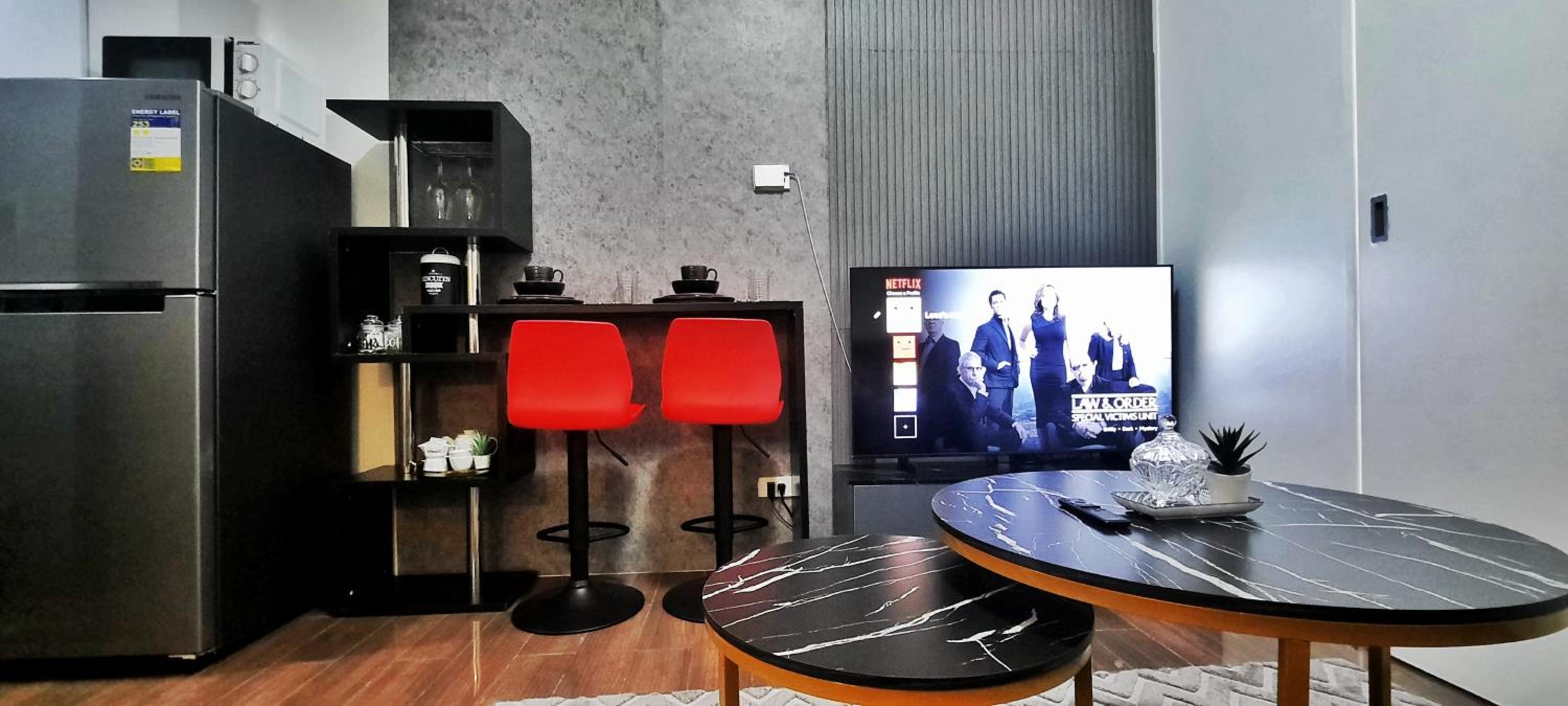 Modern Amenities: Relax in this air-conditioned 1BR apartment featuring a flat-screen TV with streaming services, a fully equipped kitchenette, and a comfortable dining area.