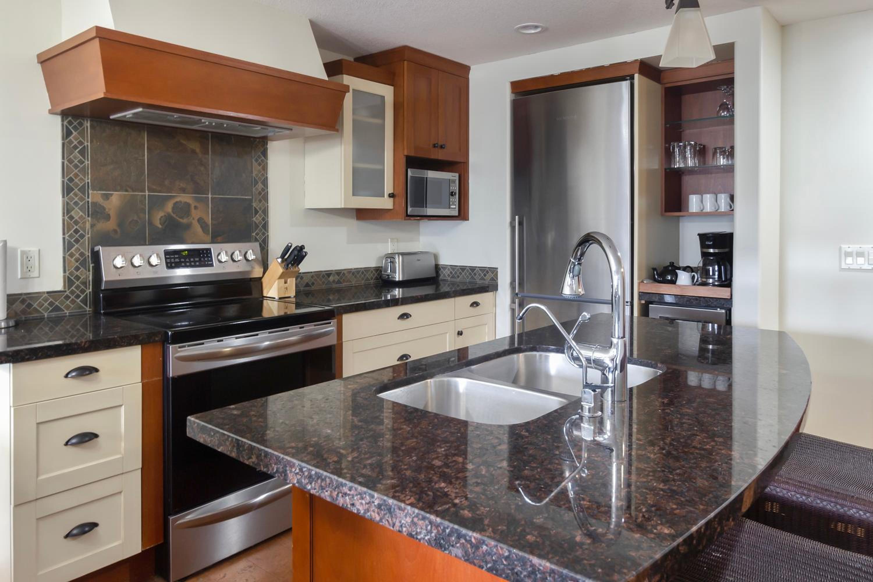 The condo offers a fully equipped kitchen, flat-screen TV, and air conditioning for a comfortable stay.