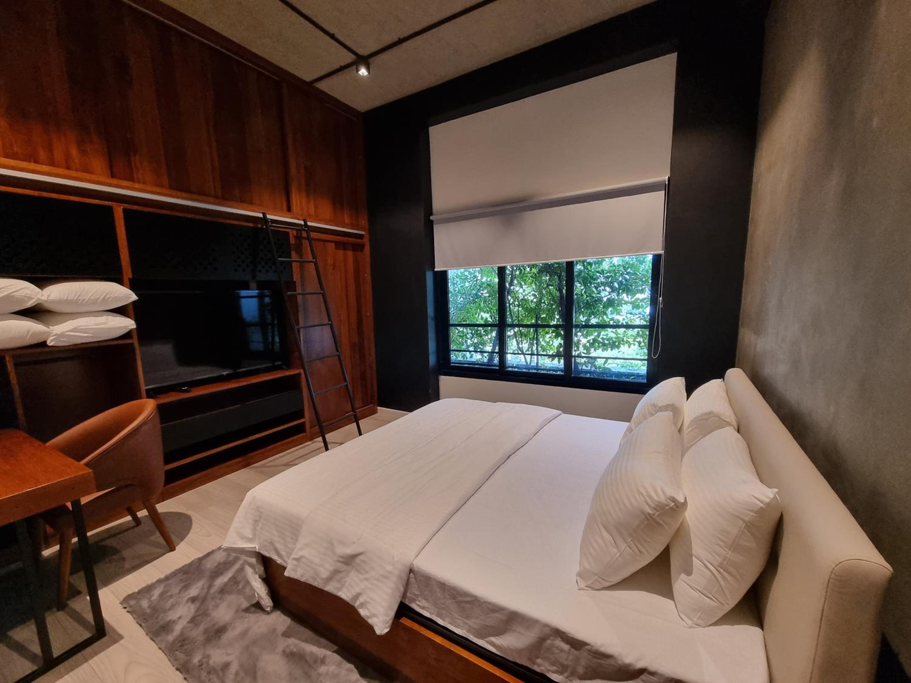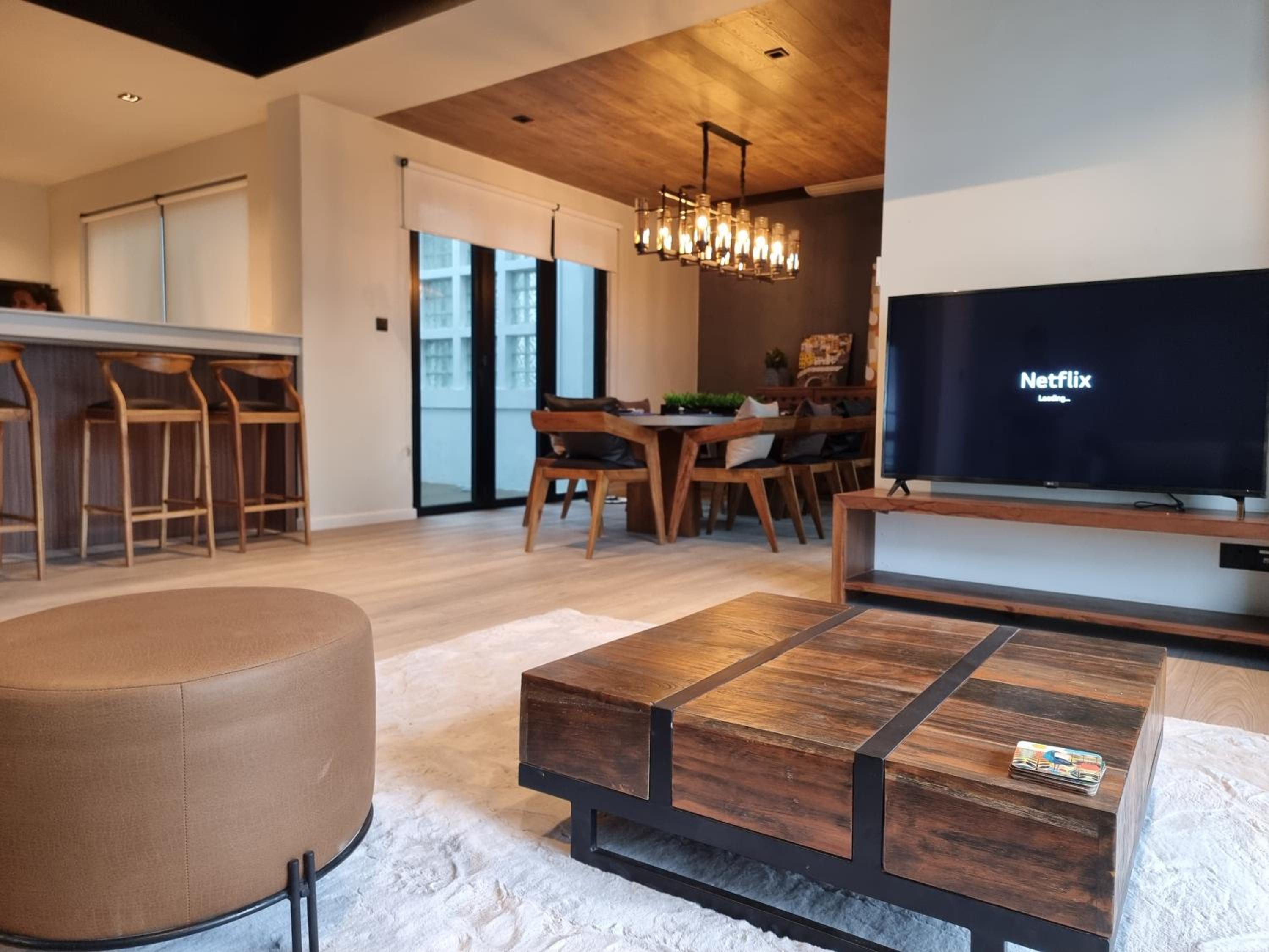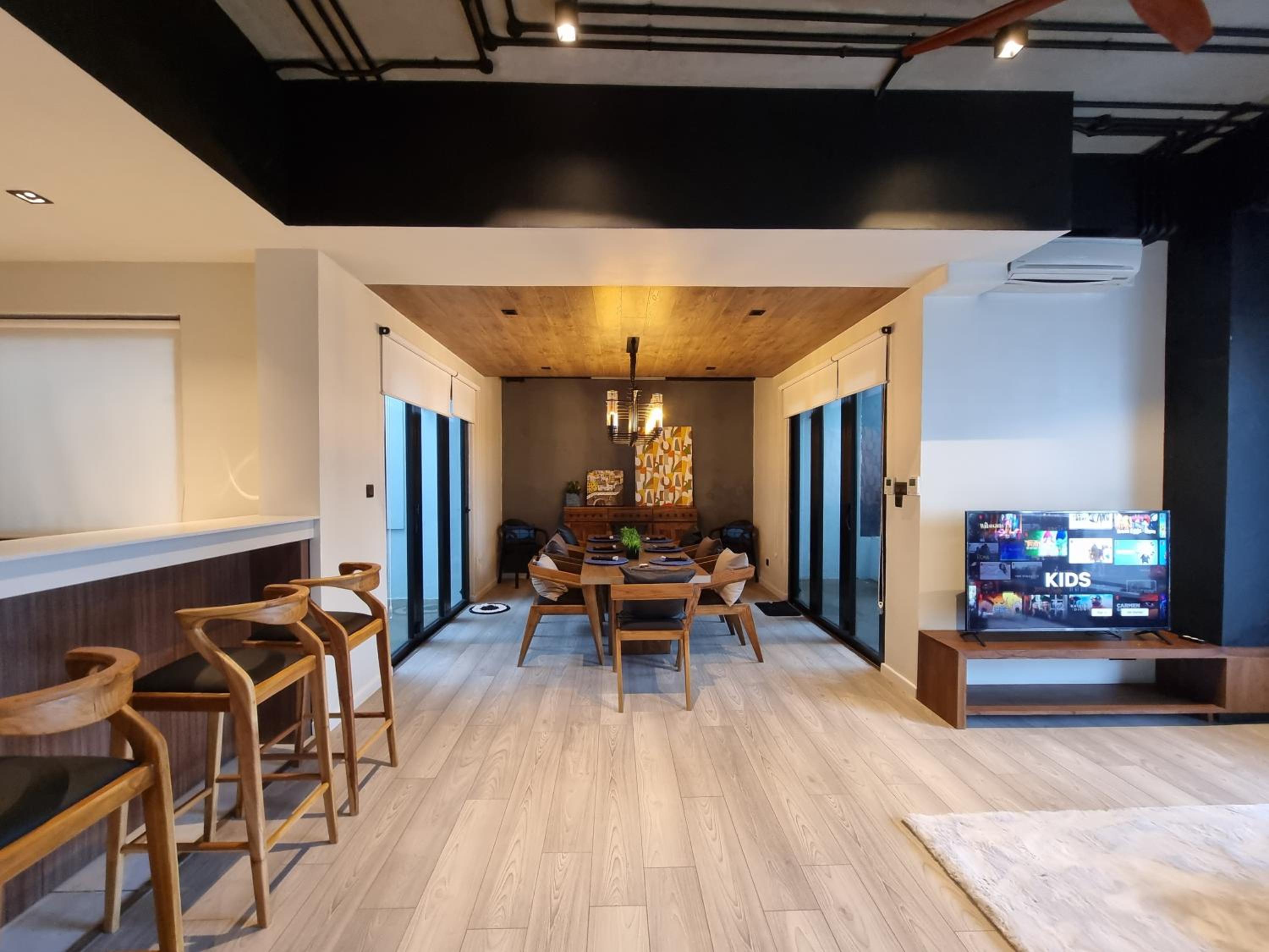 舒适度非常好,冰箱里准备了巧克力,吧台上有各种茶。看来老板很用心。房顶很高。楼顶还有游泳池。