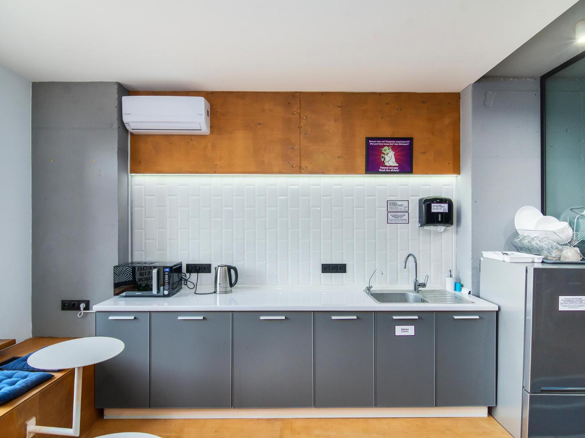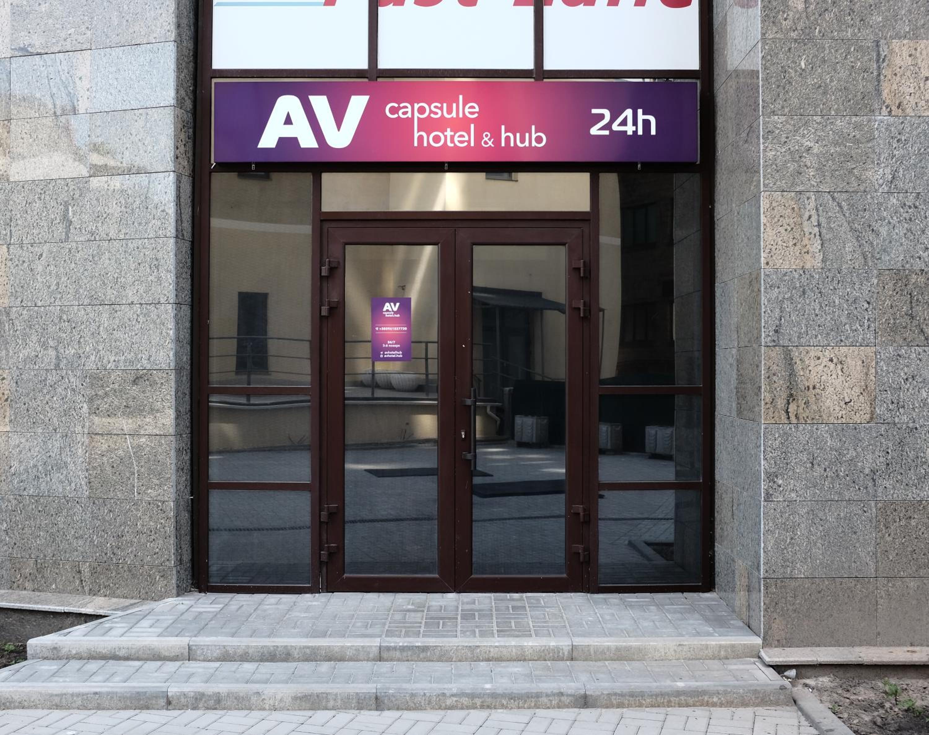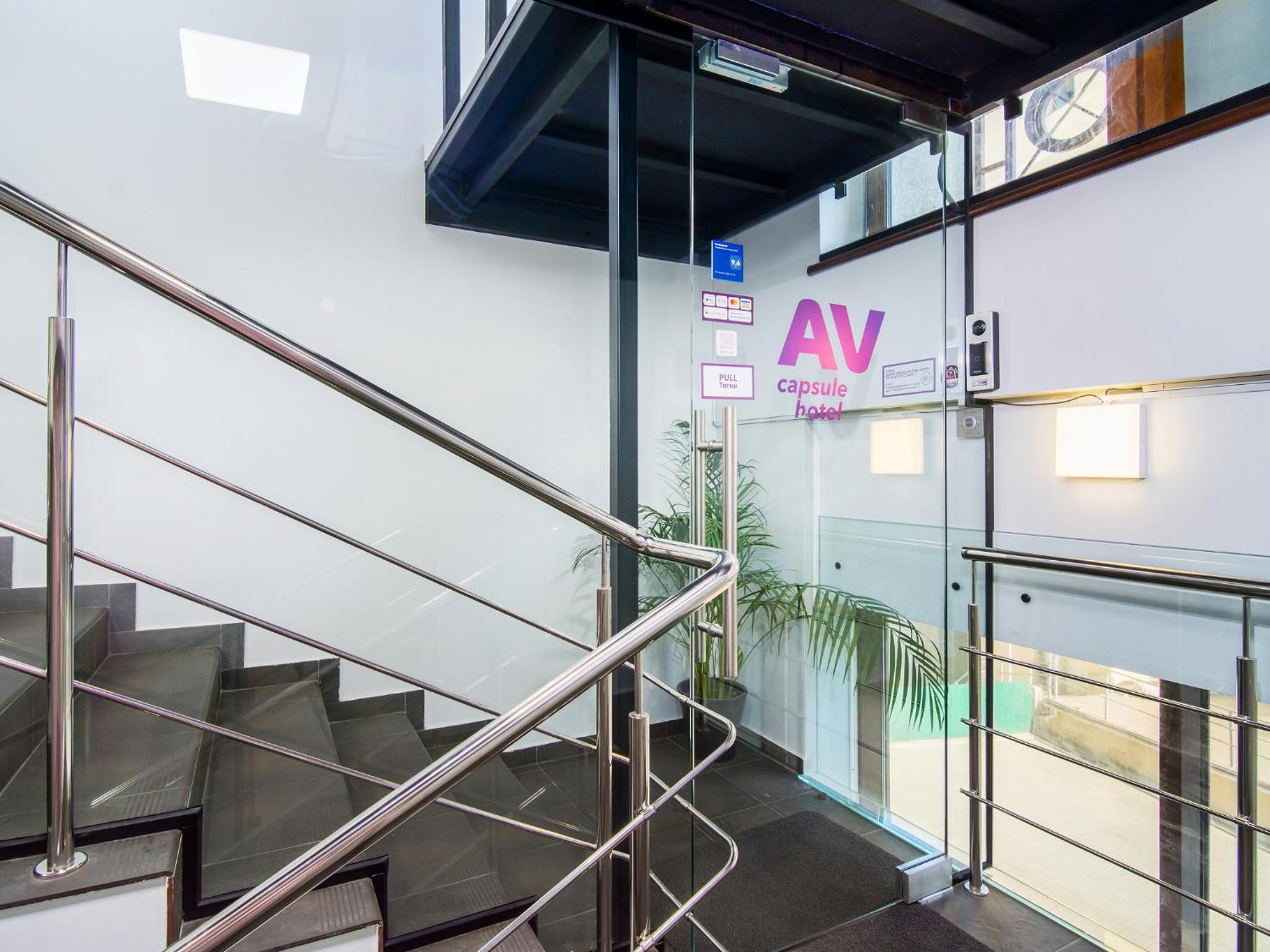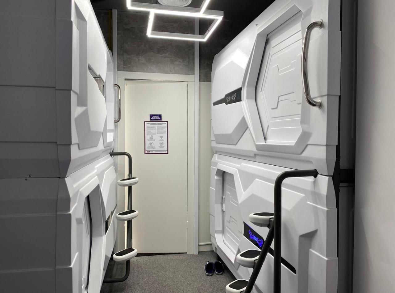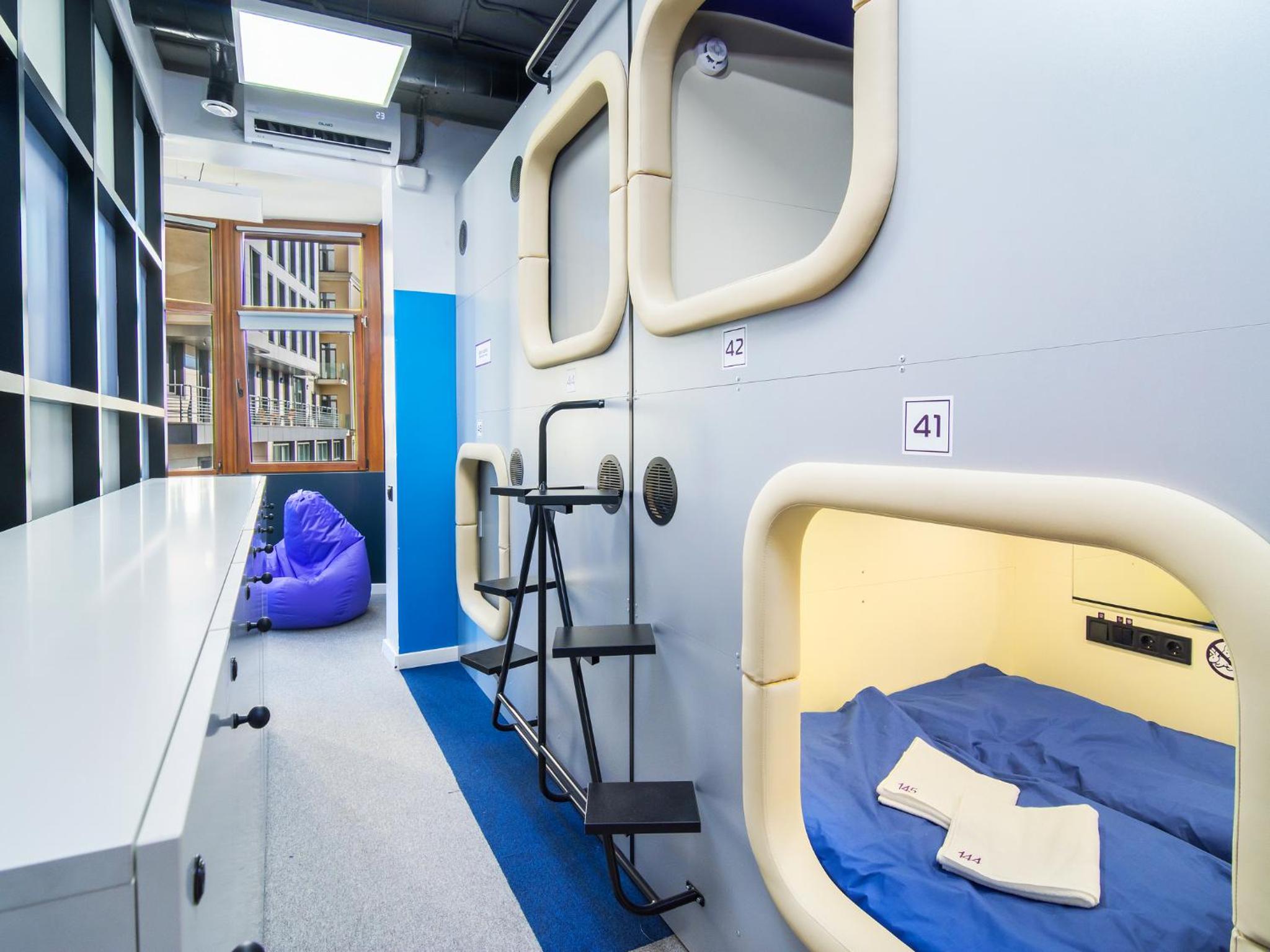 AV-1 Capsule Hotel in Kiev offers a unique accommodation experience with individual capsules equipped with TVs, lighting, and power sockets. Guests are provided with headsets for a peaceful stay, along with shared kitchen and bathrooms for convenience.