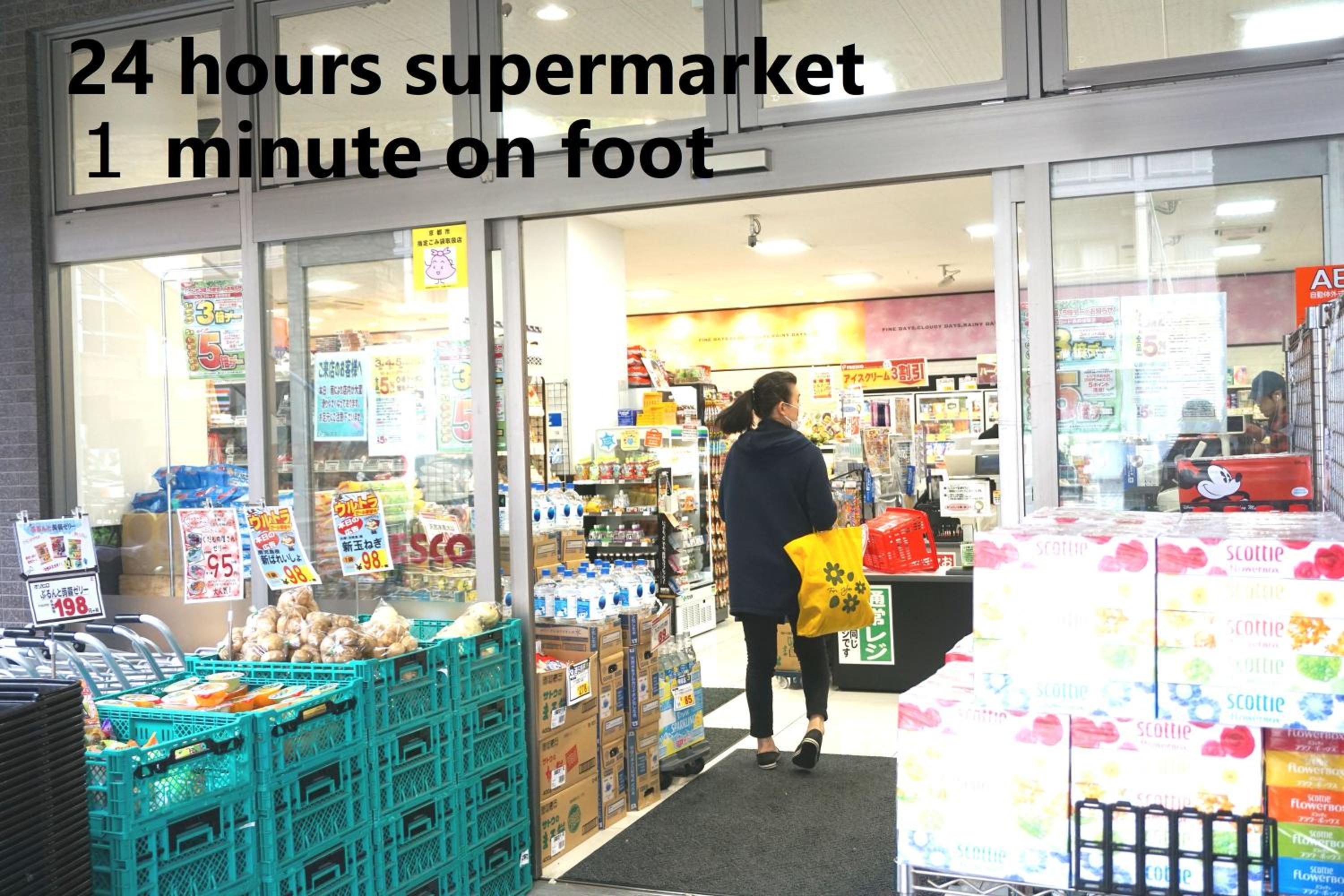A few minutes walk to supermarket, convenience stores, subway station and bus stop. Less than 10 minutes by train to Kyoto station.