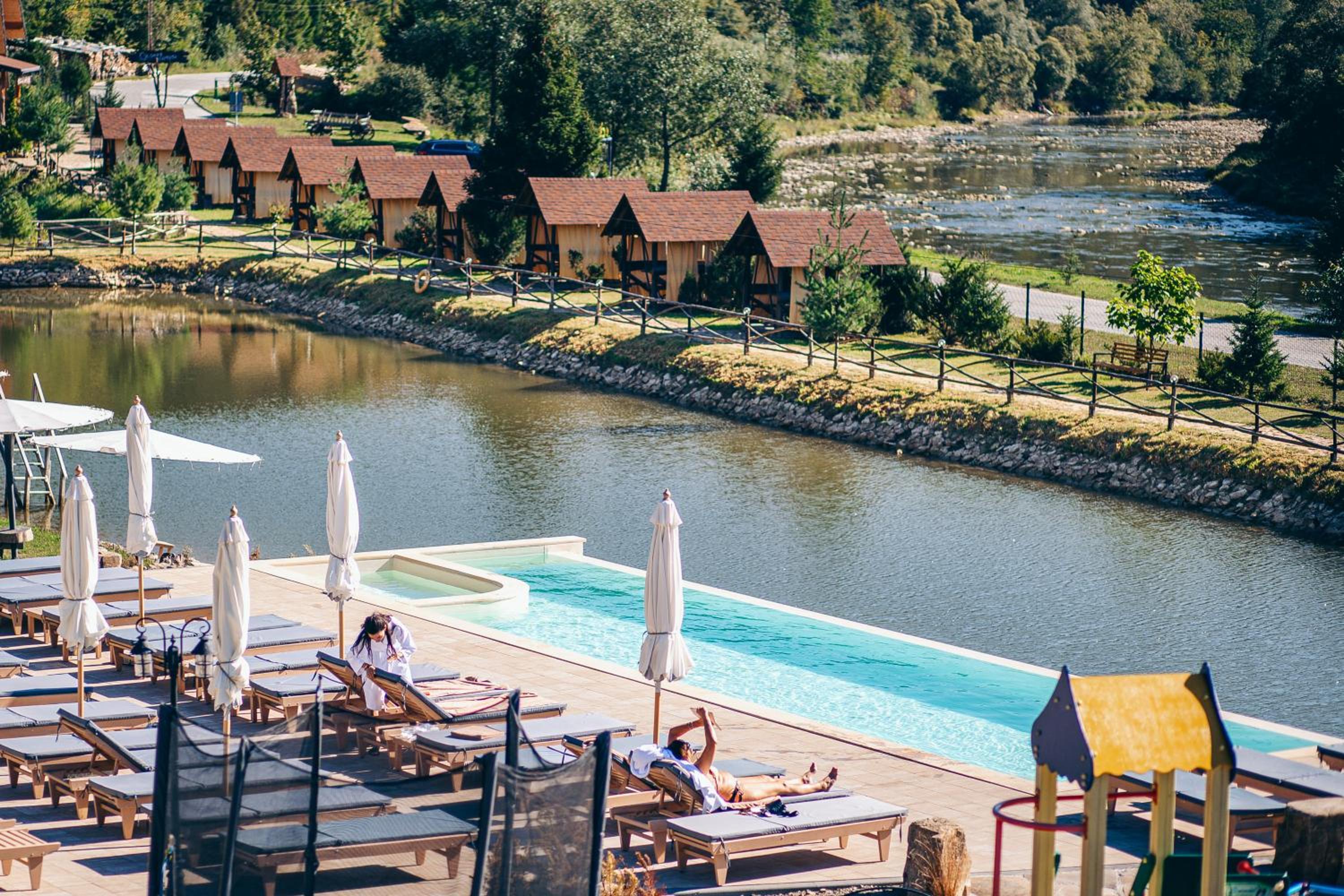 Гарна локація з мальовничим краєвидом. У нас був вид на річку, дуже красиво. Територія велика і доглянута, персонал привітний і готовий допомогти у вирішенні будь-яких питань.