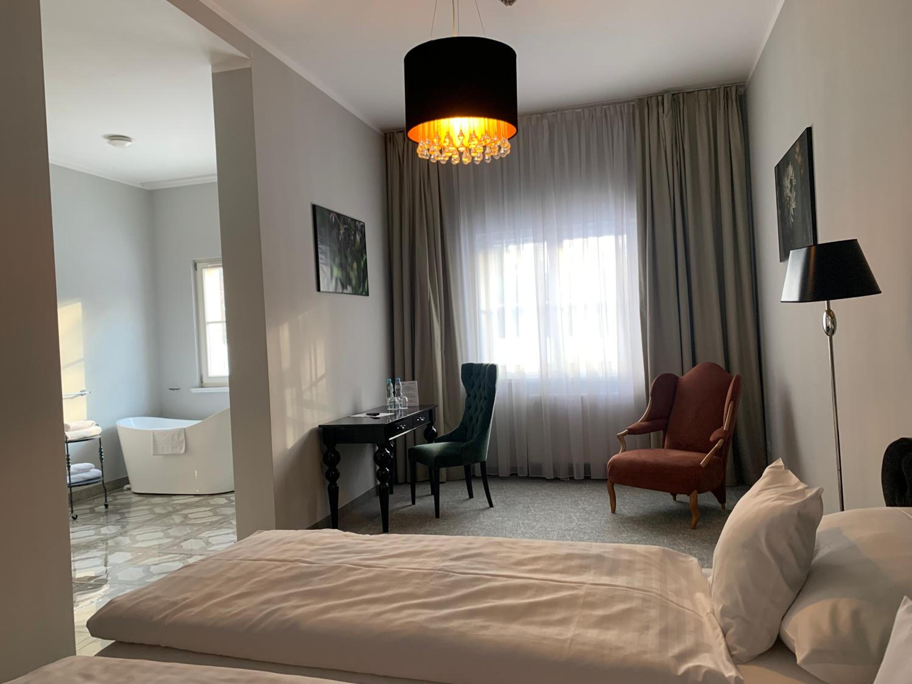 Przestronny,piękny pokój, czystość i otoczenie.Pyszne śniadanko w stylowej sali i do tego szampan dla chętnych co mnie jeszcze nie spotkało.