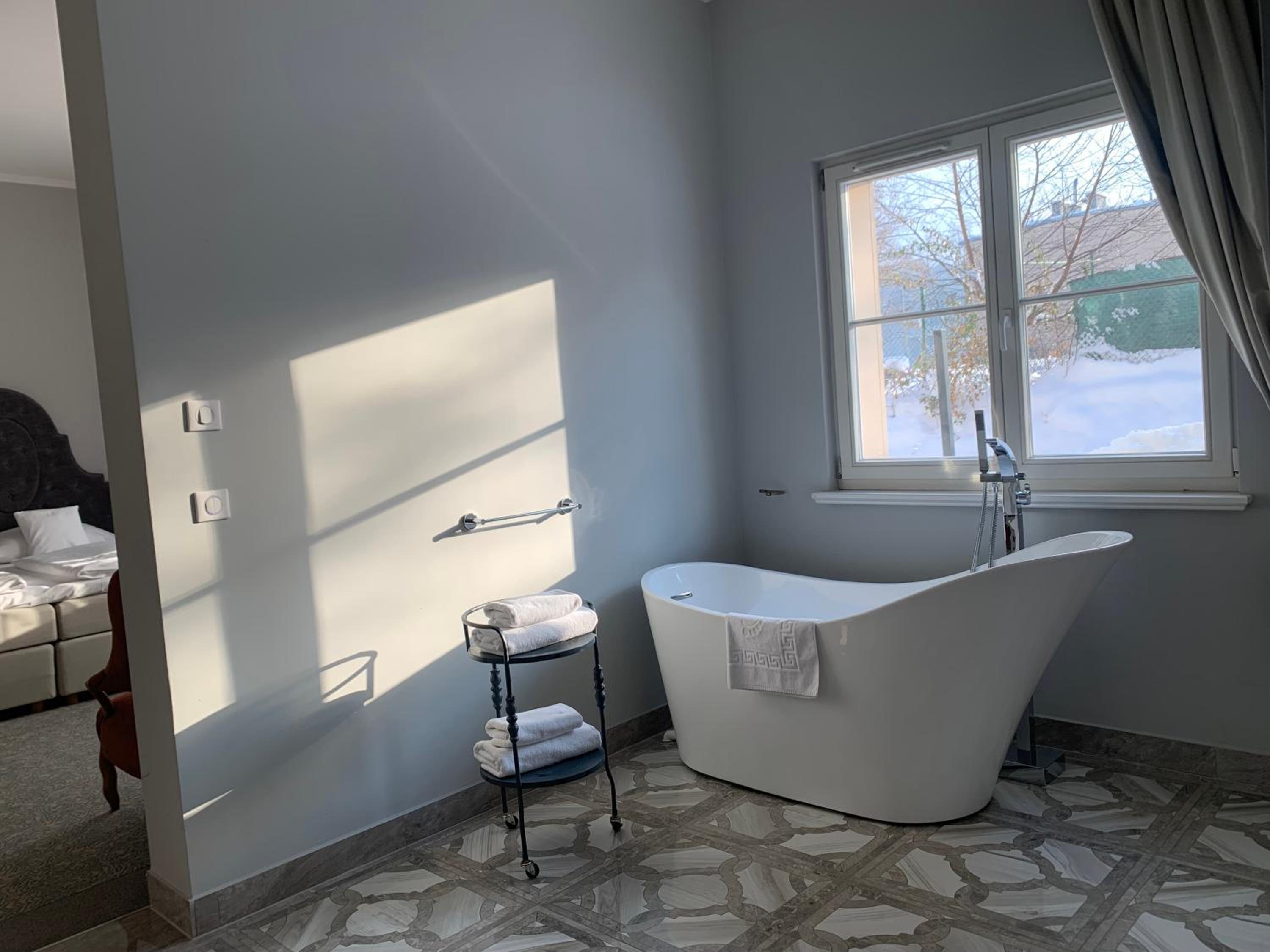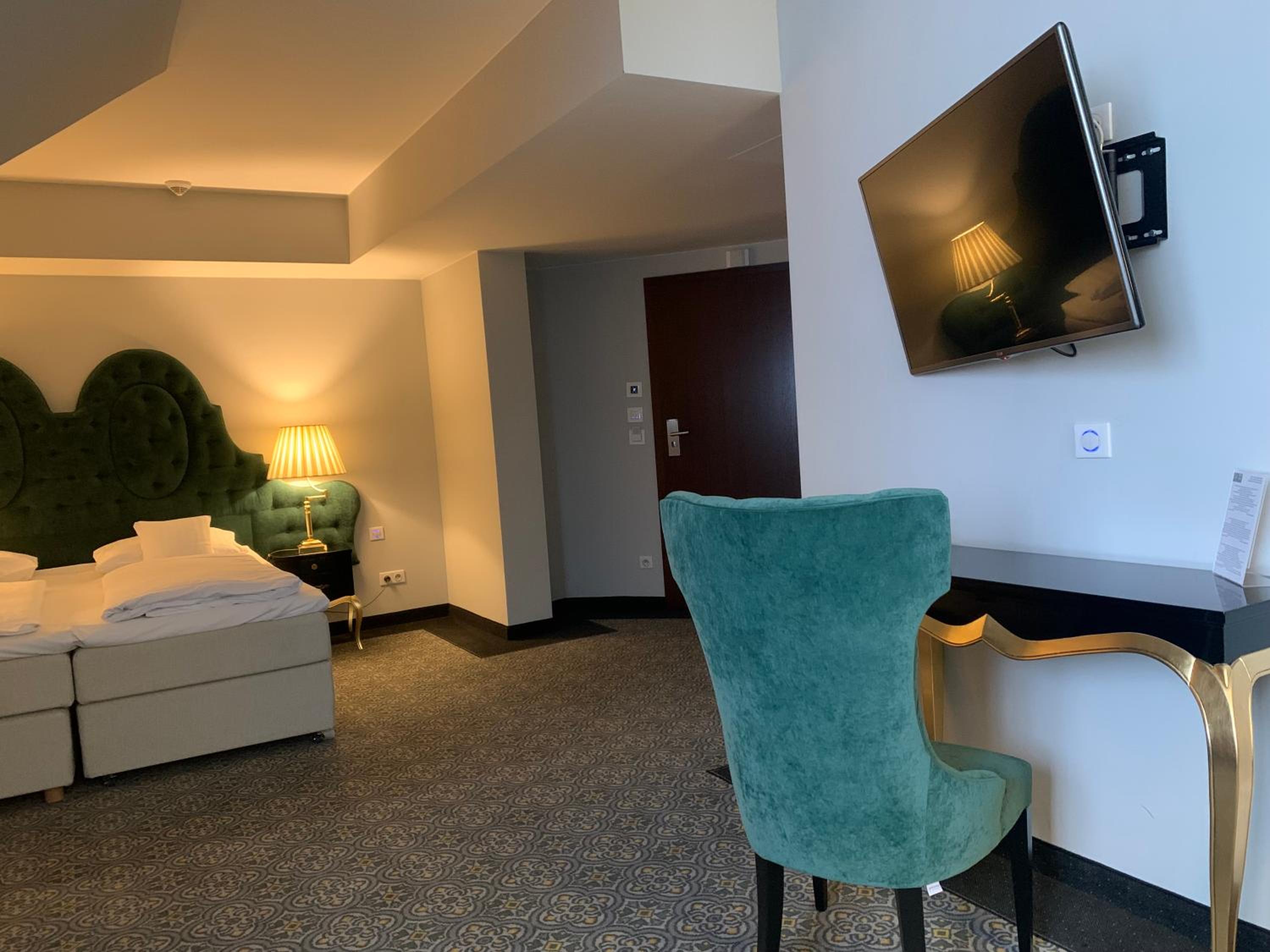 Pani w recepcji powinna przejść przeszkolenie z budowania właściwych relacji z Gośćmi hotelu. To pierwsze wrażenie pozostaje w pamięci. Szkoda. Pokój niby Deluxe - w przyziemiu. Zwykły, niezbyt duży pokój, bardzo przeciętnie zlokalizowany. Na korytarzu, przy pokoju (nr 20) wózki z brudną pościelą.. Trochę to amatorskie jak na PALAC... Może miałem pecha z tym pokojem i panią w recepcji. Czy będę chciał zawitać ponownie ? Nie wiem...