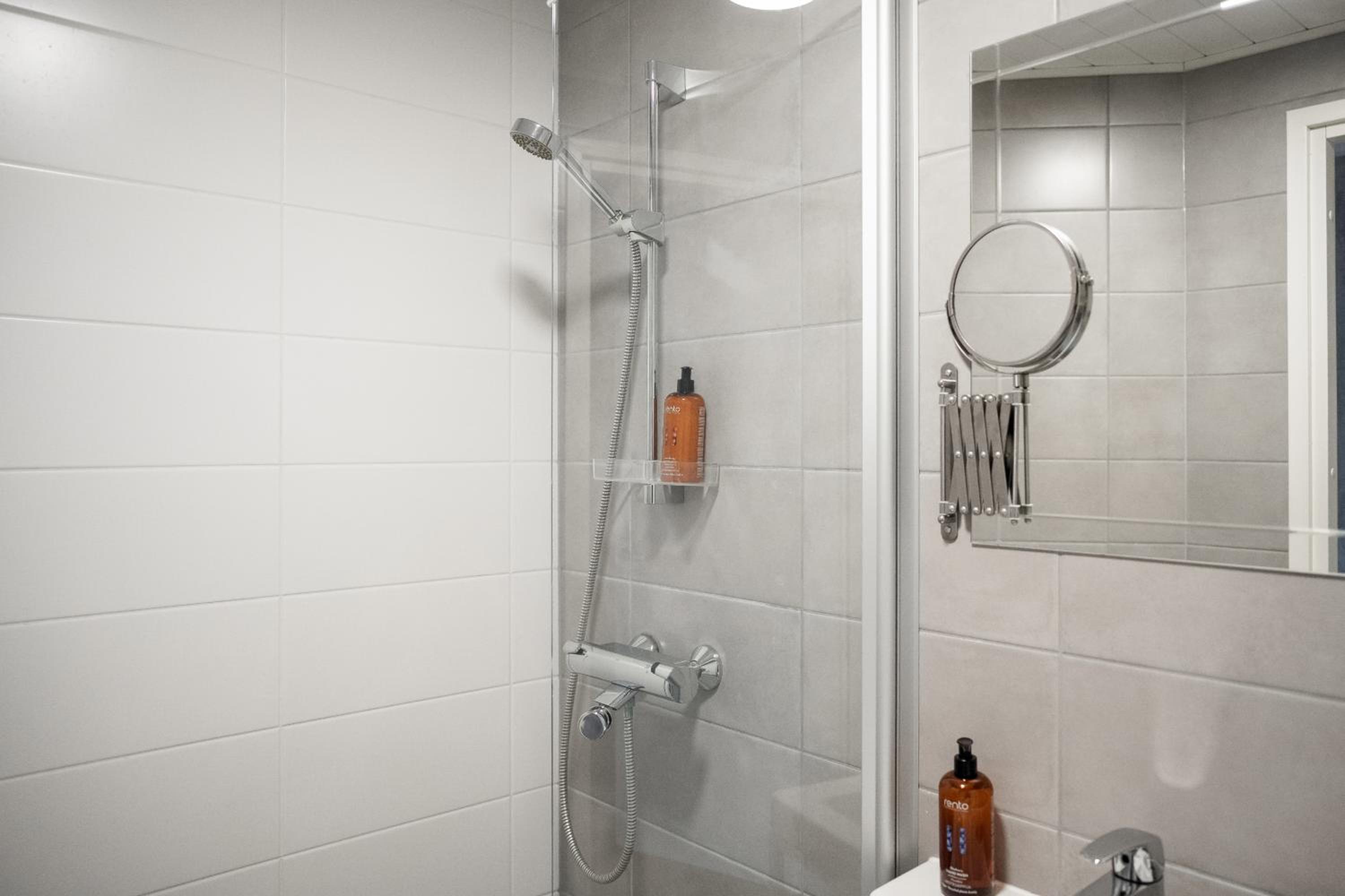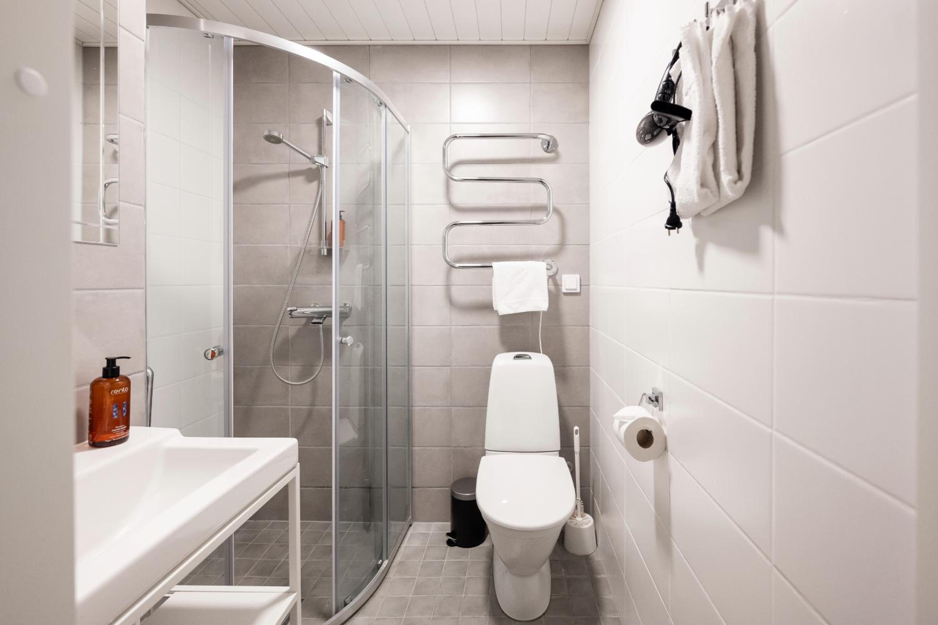 Kylpyhuoneessa ei lattia tms. lämmitystä ja tästä syystä pyyhkeet olivat kosteita koko ajan. Suihkuseinä voisi olla isompi ettei vesi roisku. Keittiölaitteille ei ollut ohjeita. Etsimme netistä, joka sekin oli hankalaa kun astianpesukoneen tyyppinumero ei ollut tiedossa. Mikäli huoneessa viipyisi pidempään tavaroiden/ pienvaatteiden säilytys hankalaa, koska ei ole mitään kalusteita joissa niitä voisi säilyttää. Yritin tilauksen jälkeen selvittää aamupalan saatavuutta, mutta en saanut vastausta.