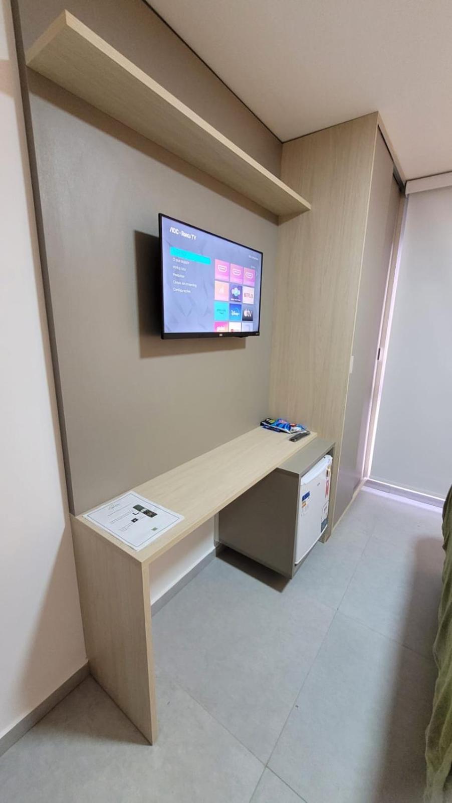 Deveria ter uma mesa bistrô para tomar uma bebida e uma tomada na mesa onde fica o frigobar, caso queira ligar um computador para trabalhar, também um local para desembarque, a rua tem muito tráfego de carros.