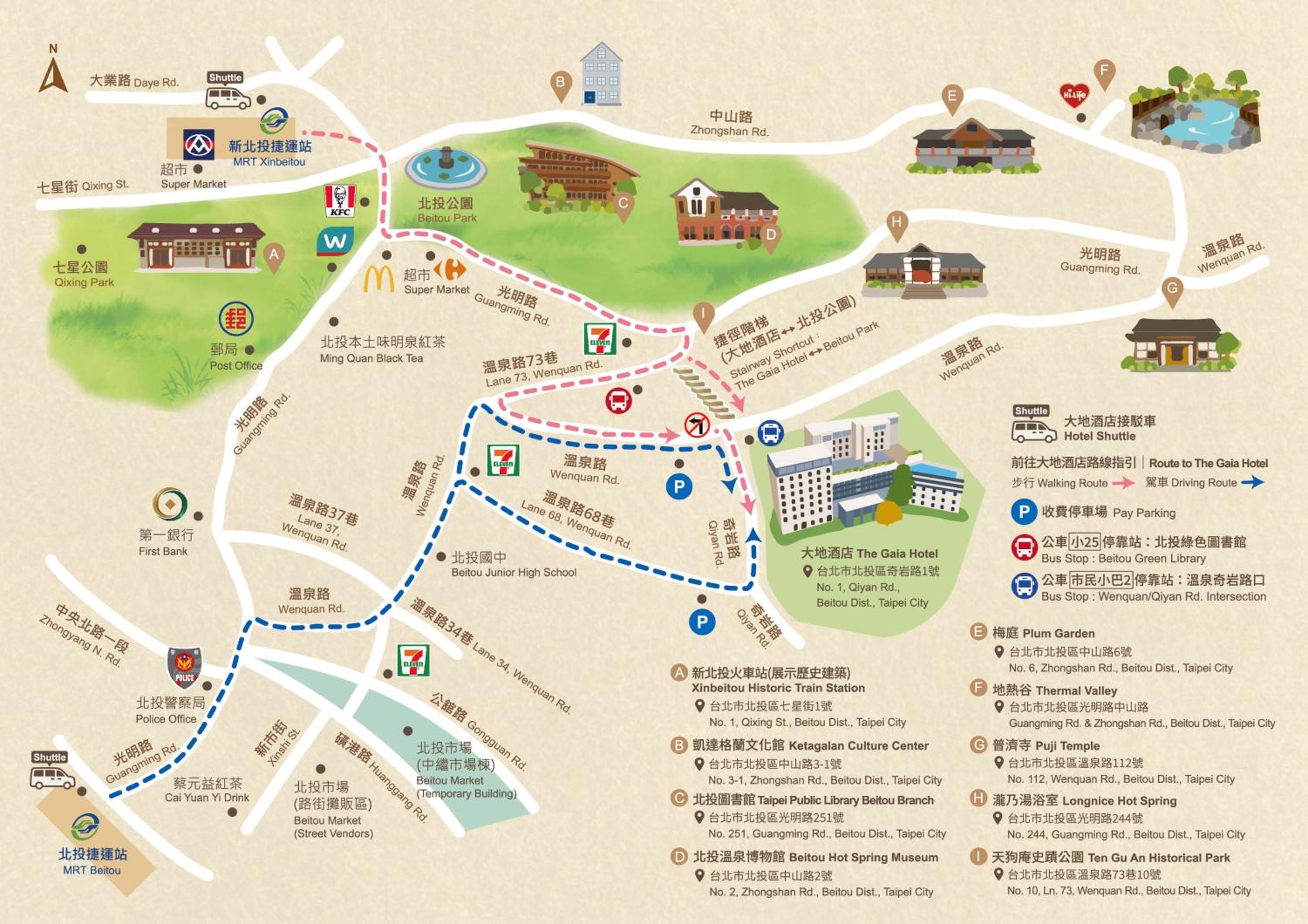 Situated close to Shilin Night Market and Taipei Railway Station, with Taoyuan Airport easily accessible, the hotel also offers a free shuttle service to the MRT station. Guests can unwind in the hot spring bath, avail business facilities, and benefit from services like currency exchange and concierge assistance.