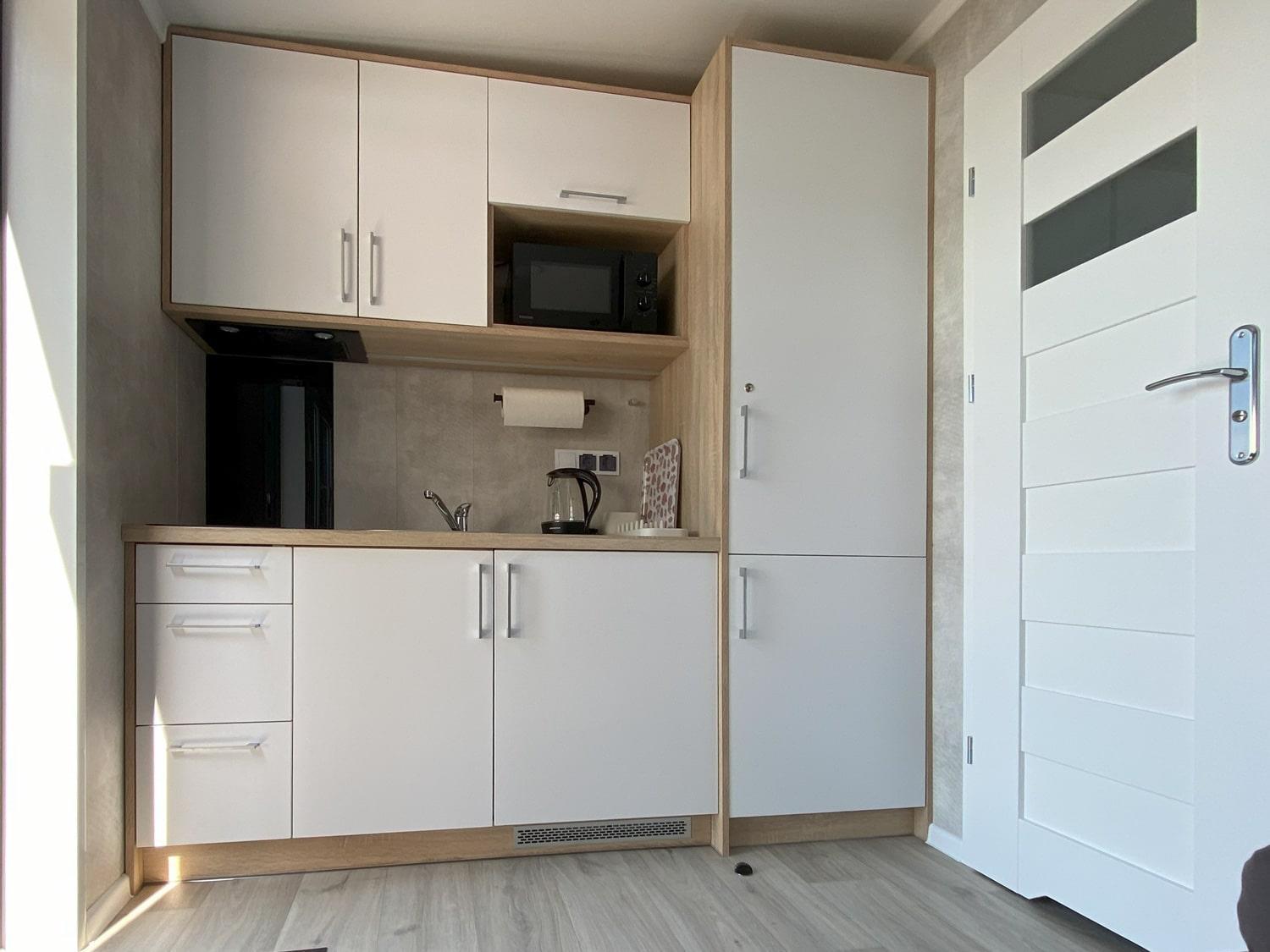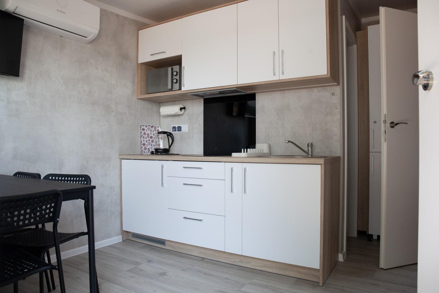 Im Mobilheim waren zwei Einzelbetten und ein Doppelbett. Das Doppelbett war aber für zwei Personen viel zu eng und auf Grund eines Regals direkt über dem Kopf, war man in der Bewegung sehr eingeschränkt.