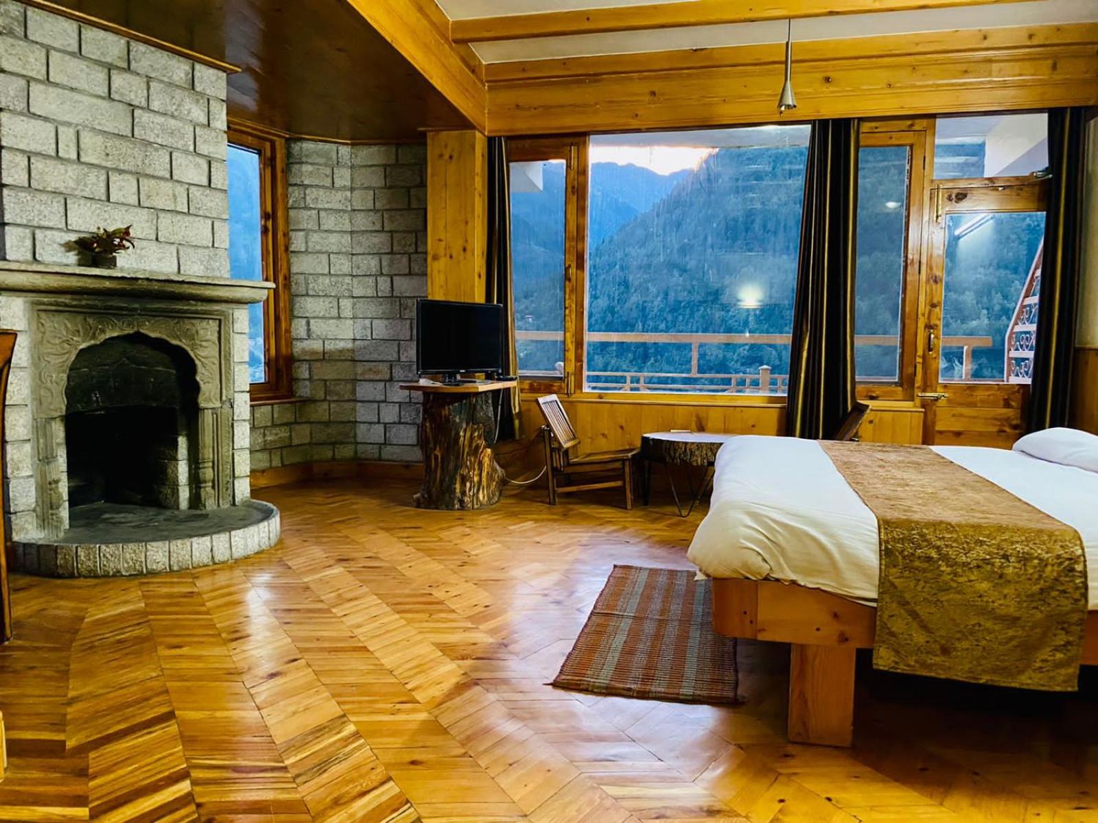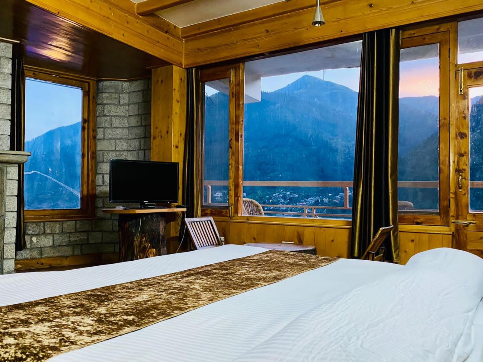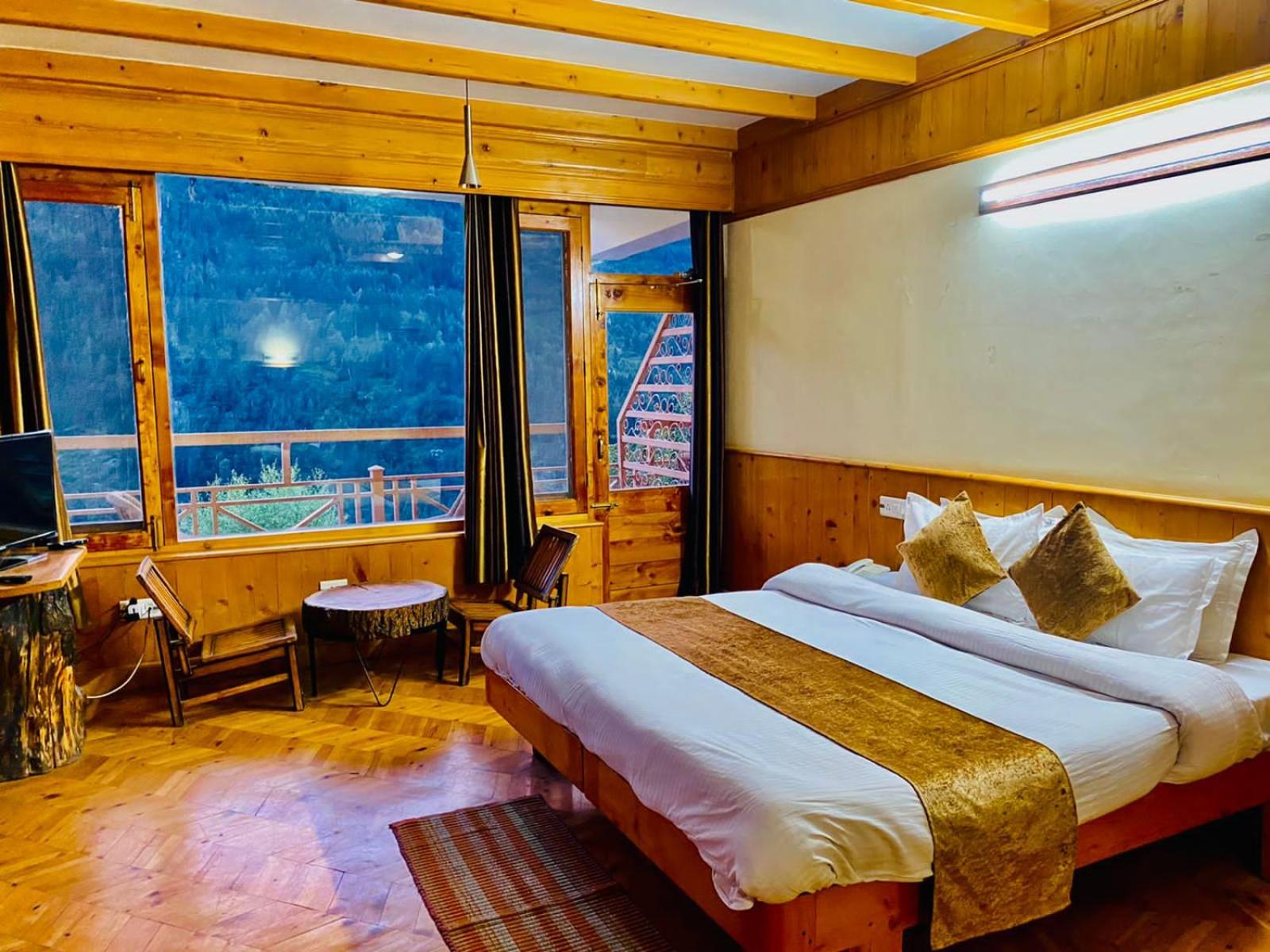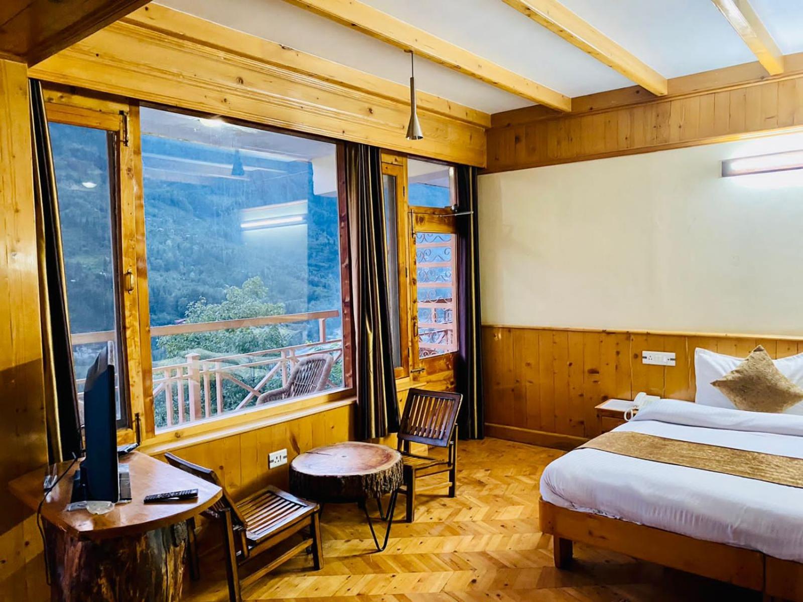 Experience a lavish stay at The Vashisht, Manali with rooms featuring balconies offering stunning city views. Relax in the cozy seating area and enjoy modern amenities like a flat-screen TV, kitchen, and private bathroom with complimentary slippers.