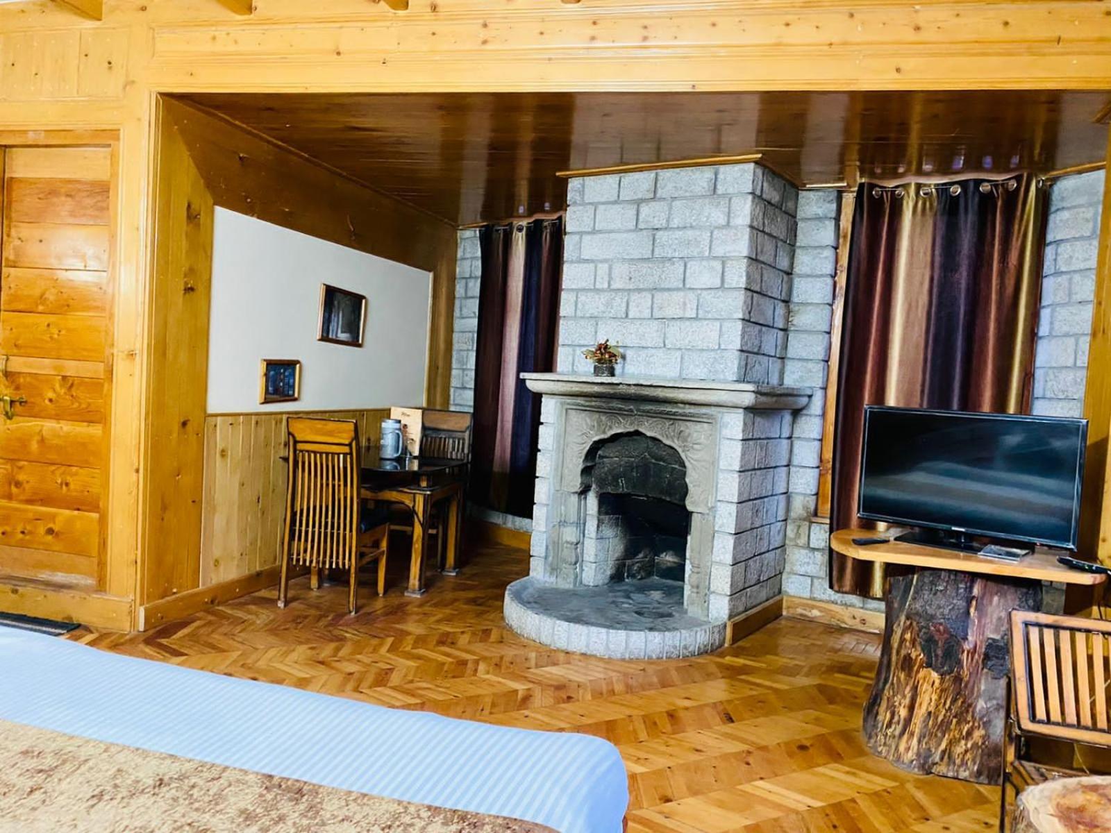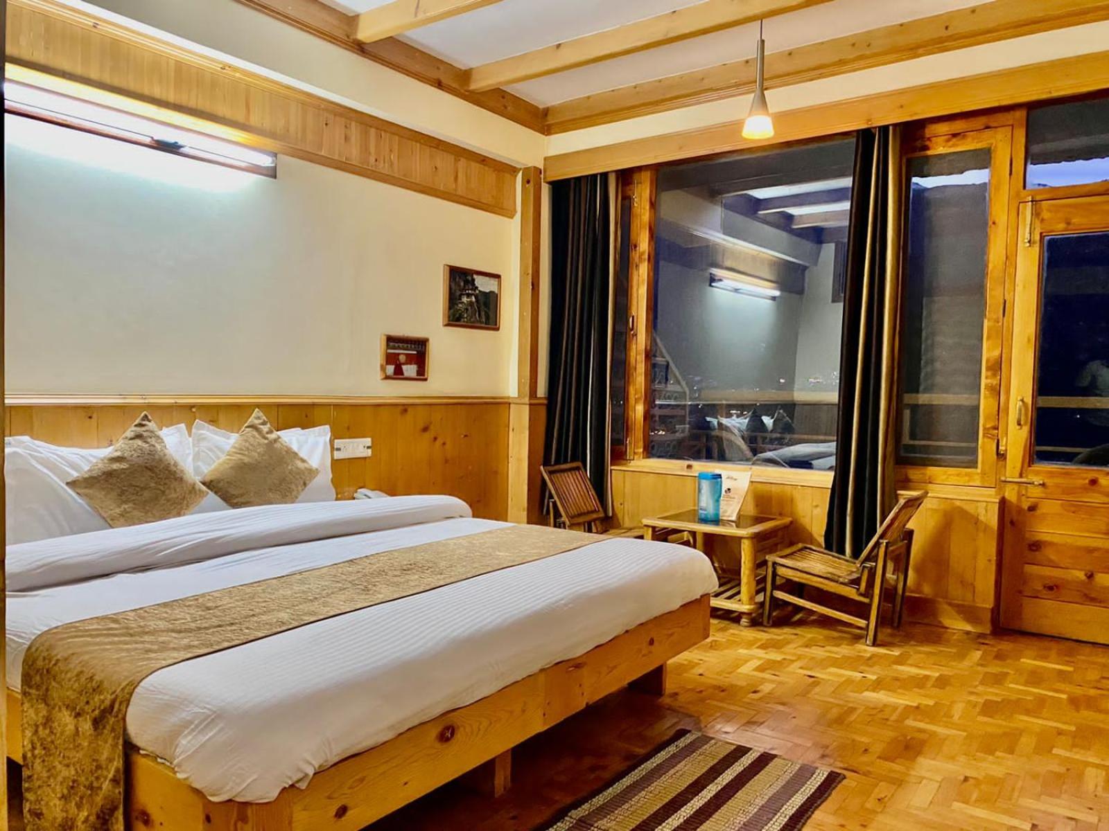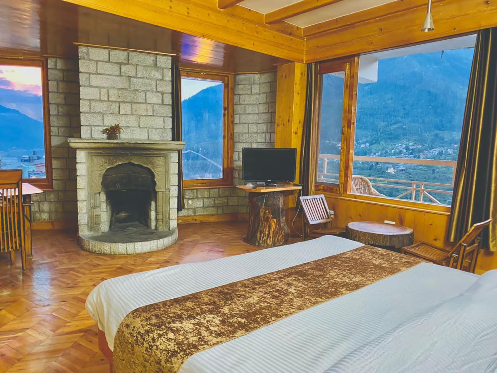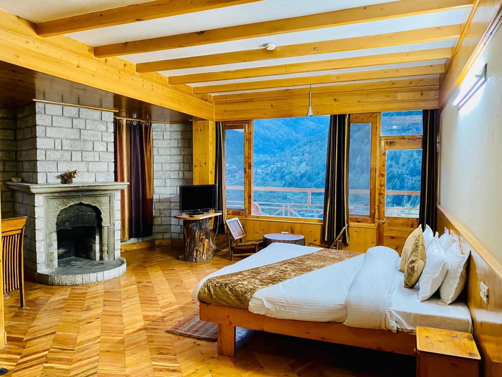 Experience a lavish stay at The Vashisht, Manali with rooms featuring balconies offering stunning city views. Relax in the cozy seating area and enjoy modern amenities like a flat-screen TV, kitchen, and private bathroom with complimentary slippers.
