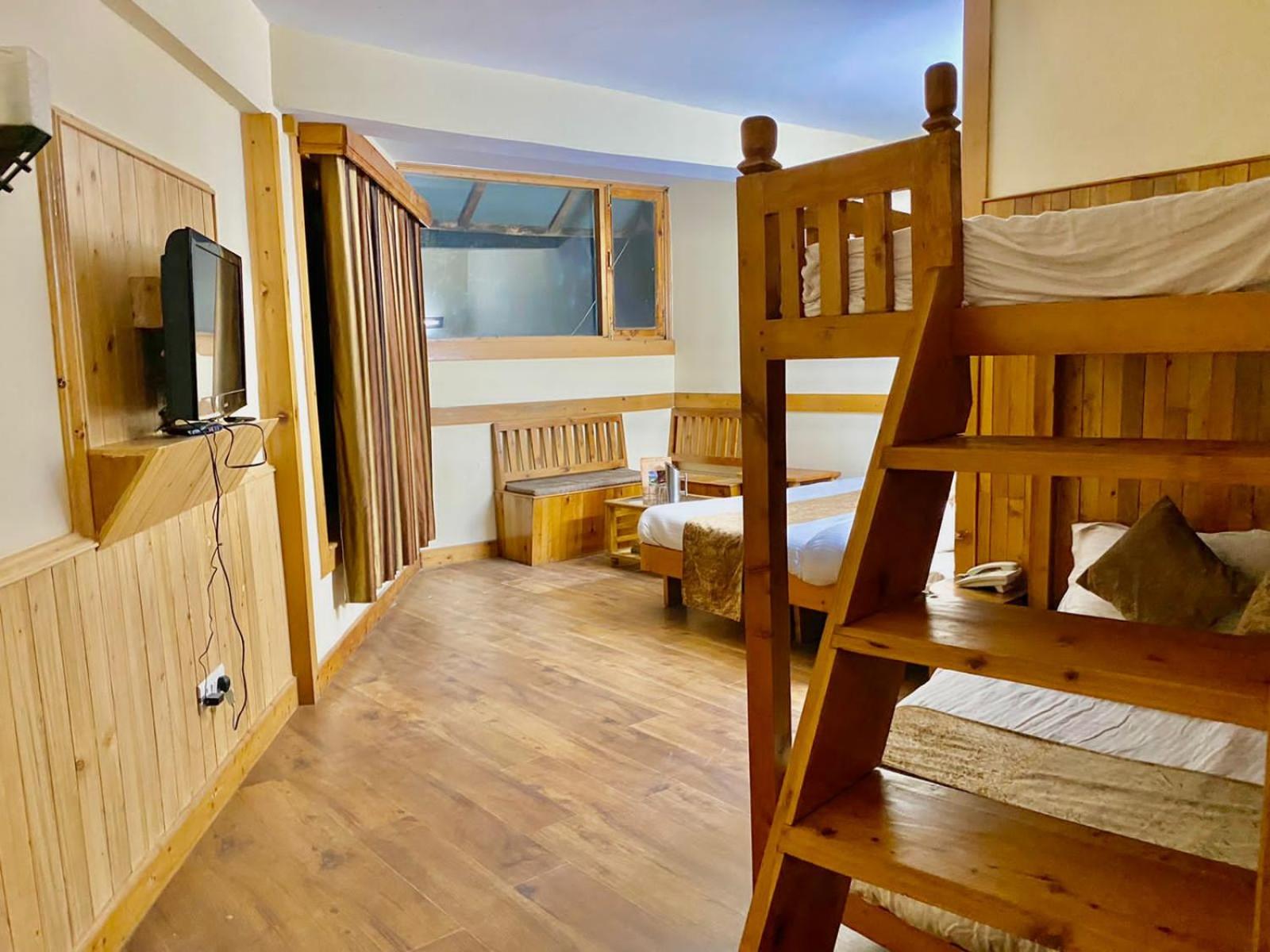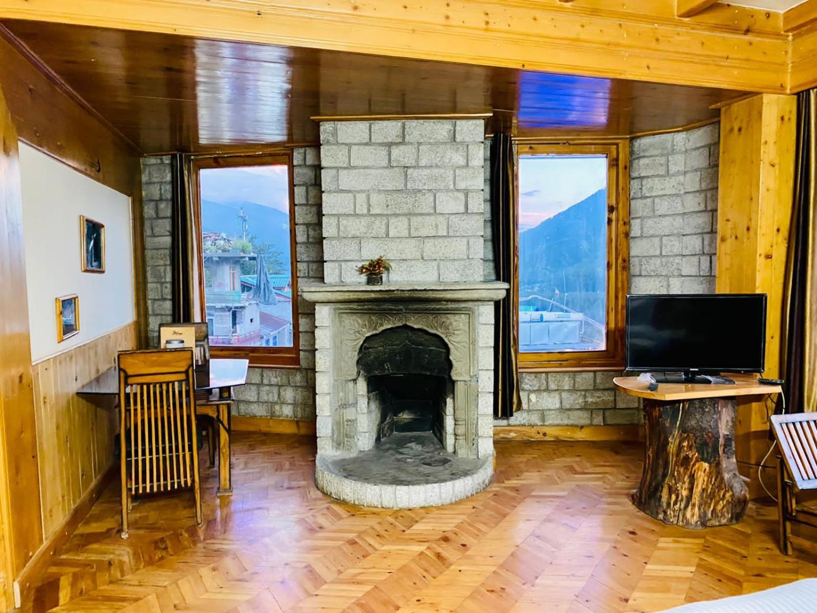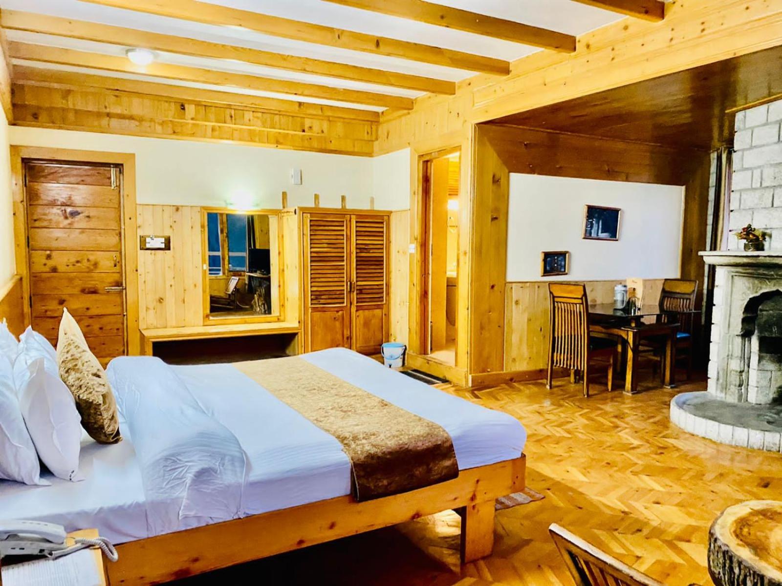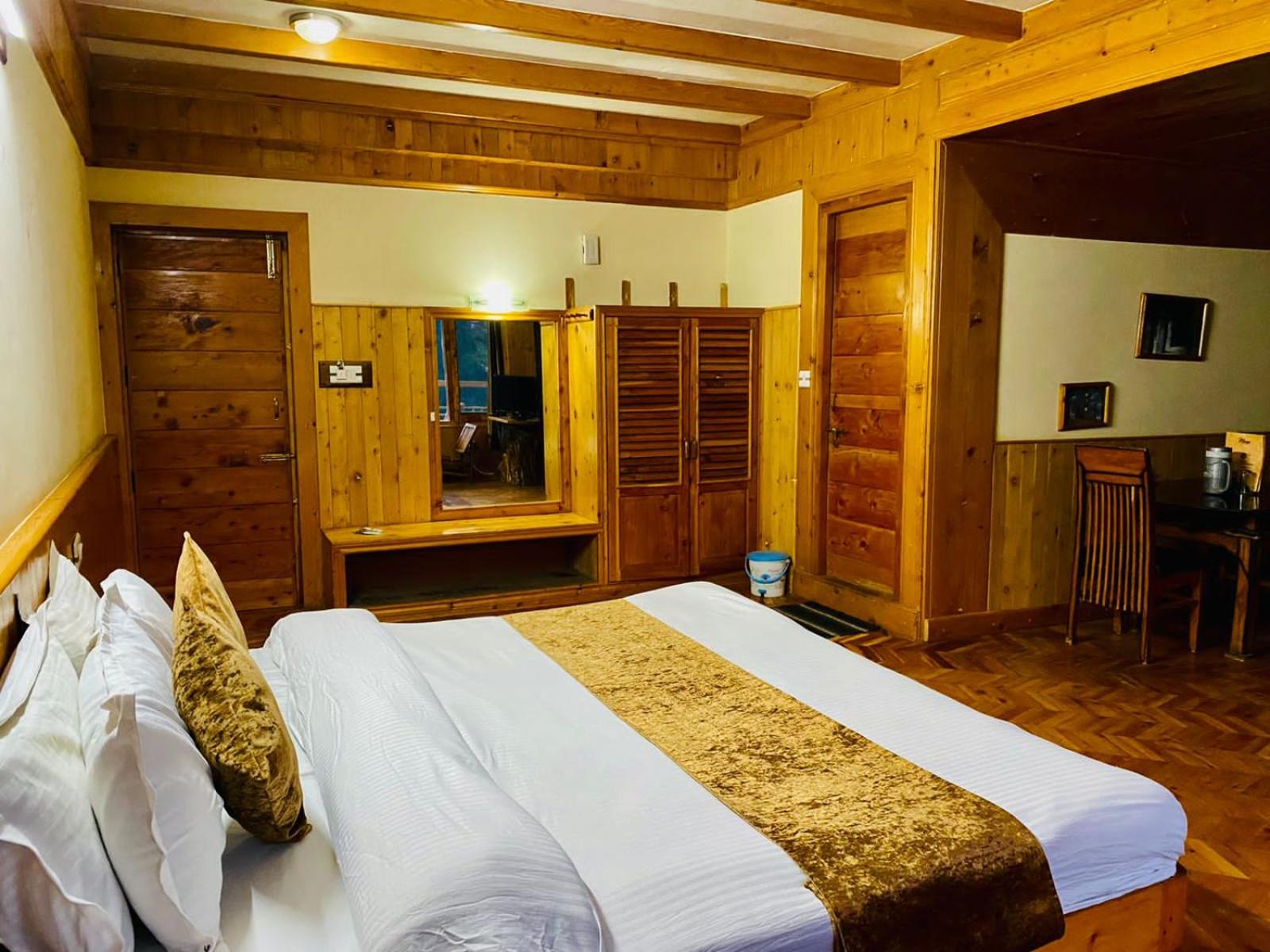 Experience a lavish stay at The Vashisht, Manali with rooms featuring balconies offering stunning city views. Relax in the cozy seating area and enjoy modern amenities like a flat-screen TV, kitchen, and private bathroom with complimentary slippers.