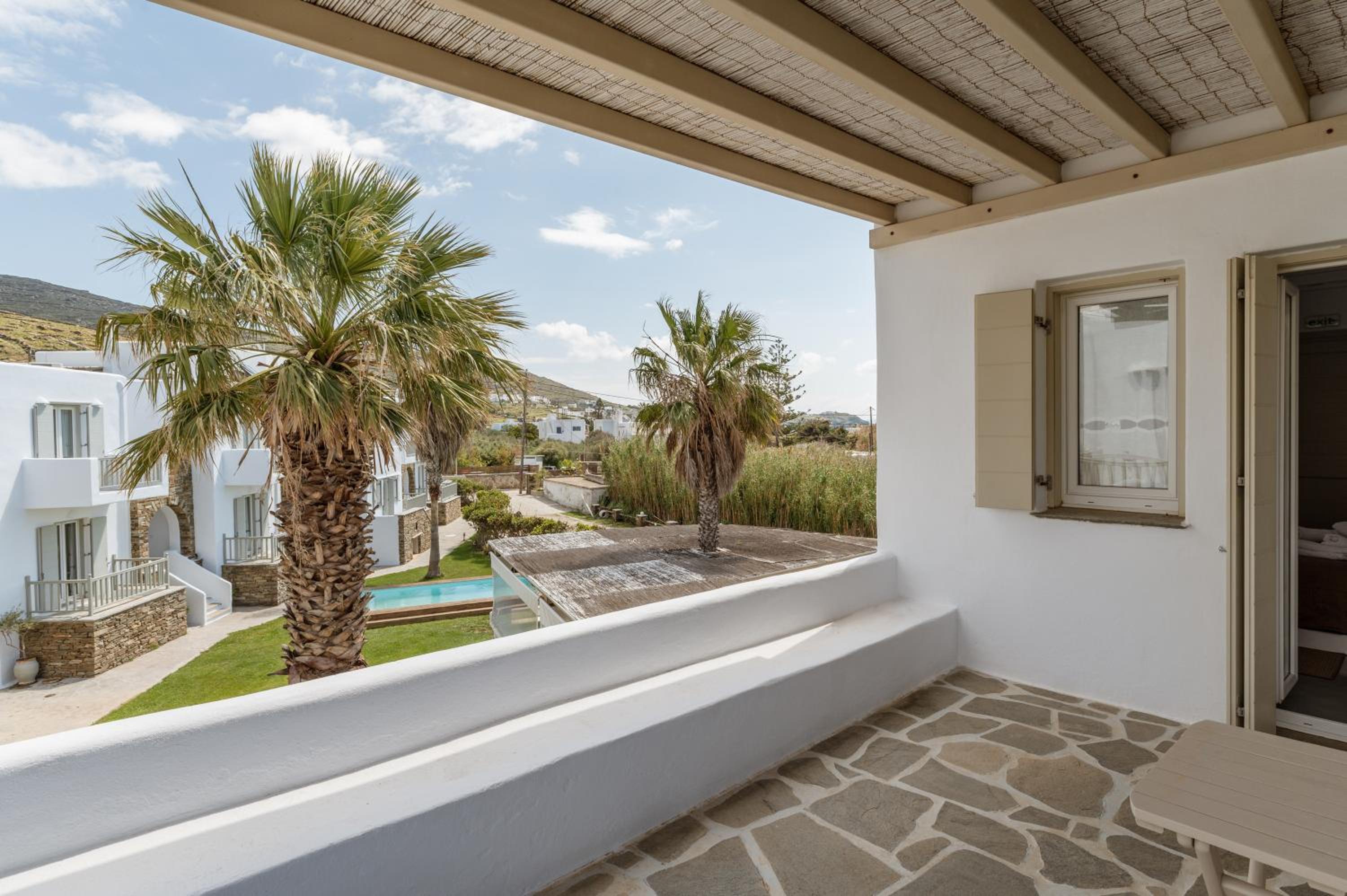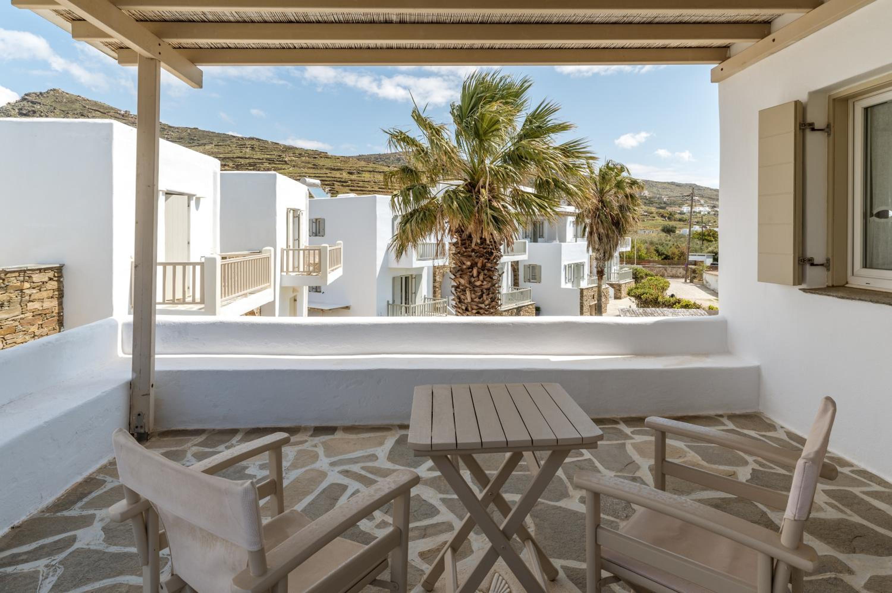 Indulge in breathtaking garden and mountain views from your patio at Ninemia Suites Tinos Superior 202.