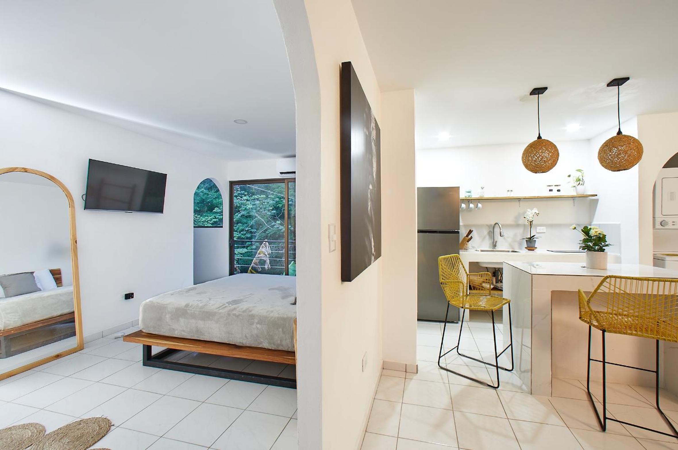 Experience ultimate relaxation at Deluxe Loft 1 BDR con linda vista in Puntarenas. Indulge in a private plunge pool and unwind on the balcony with free WiFi. The fully equipped kitchen and flat-screen TV ensure a comfortable stay.