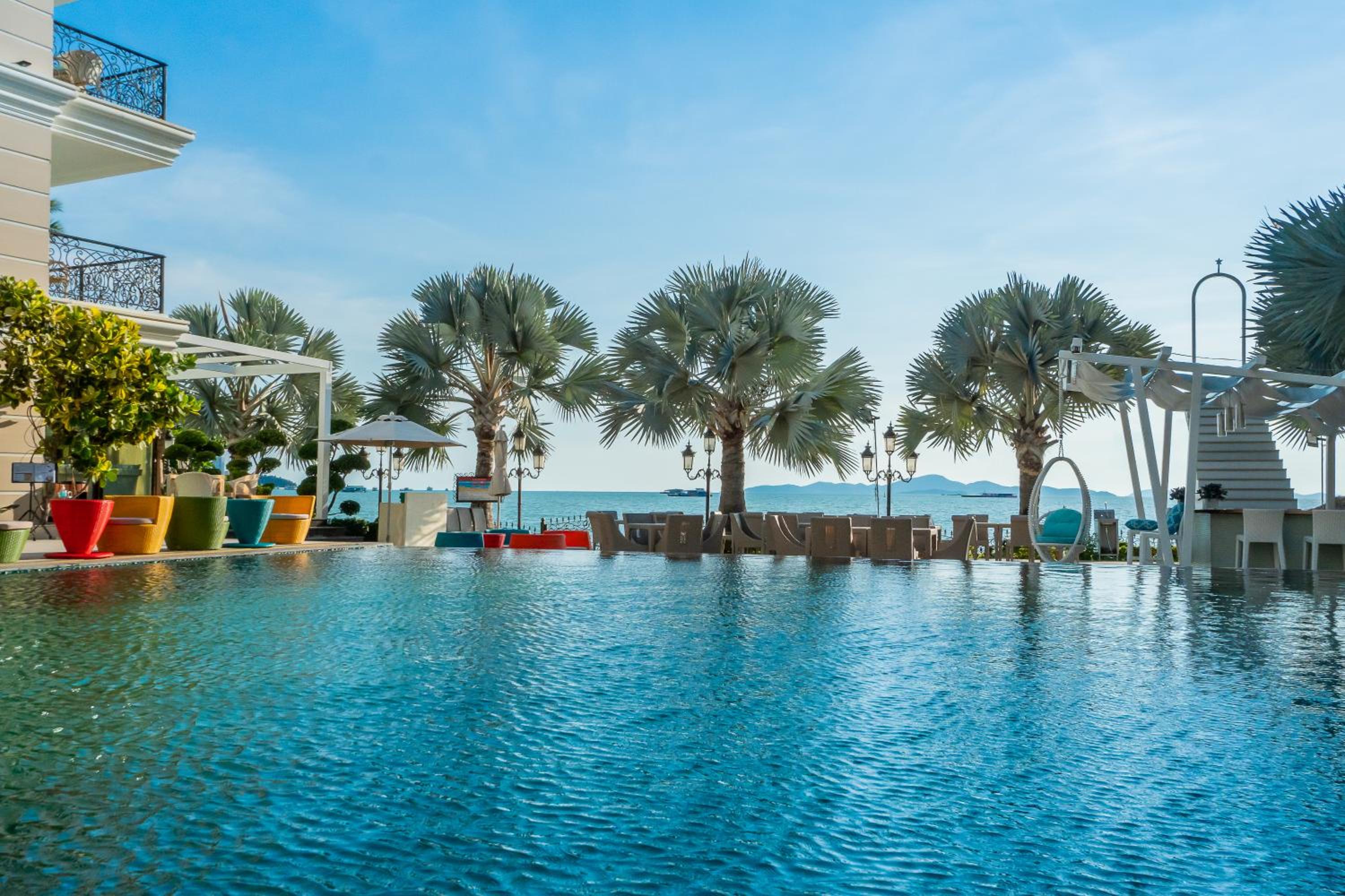 Eclectic, Beachfront hotel. A mini Versailles Palace. The rooms are spacious and well appointed. The views from were balconies are spectacular. Breakfast was an extensive buffet that had food to satisfy all nationalities. Fantastic pool. Extremely well located to some excellent restaurants and shops. Quite removed from the seedier side. The staff were friendly and helpful. If you are wanting a Spa experience I can recommend Let's Relax Onsen&SPA Pattaya. ATM on site and a shuttle van. There's deck chairs/umbrellas, cold drinks and food literally 1 minute from the Hotel and directly on the beach.
