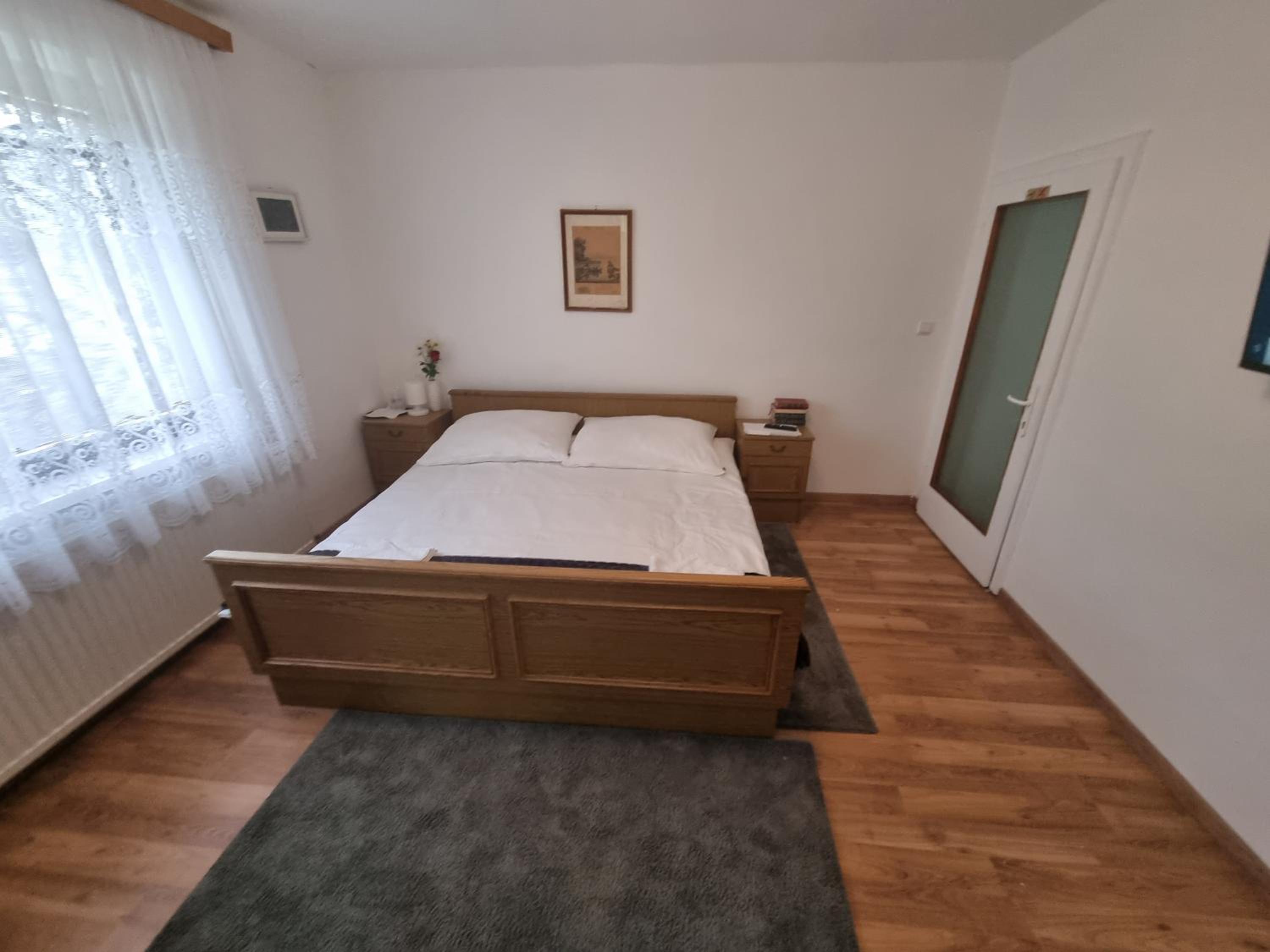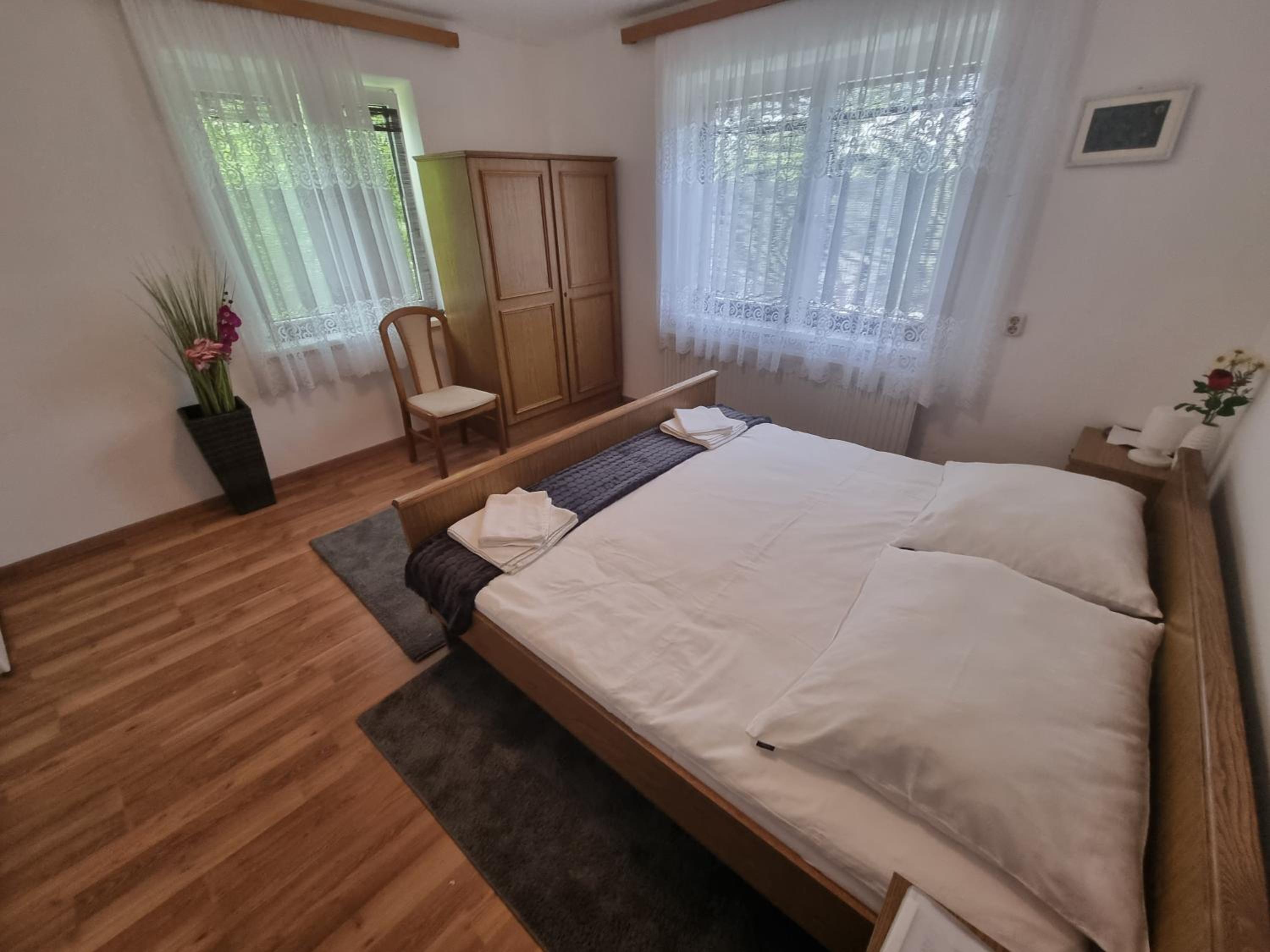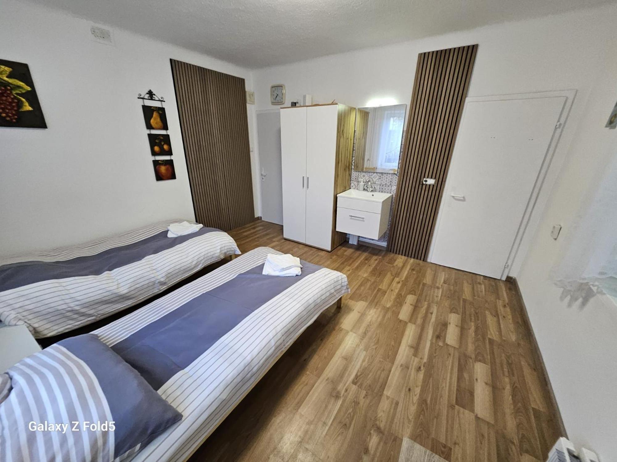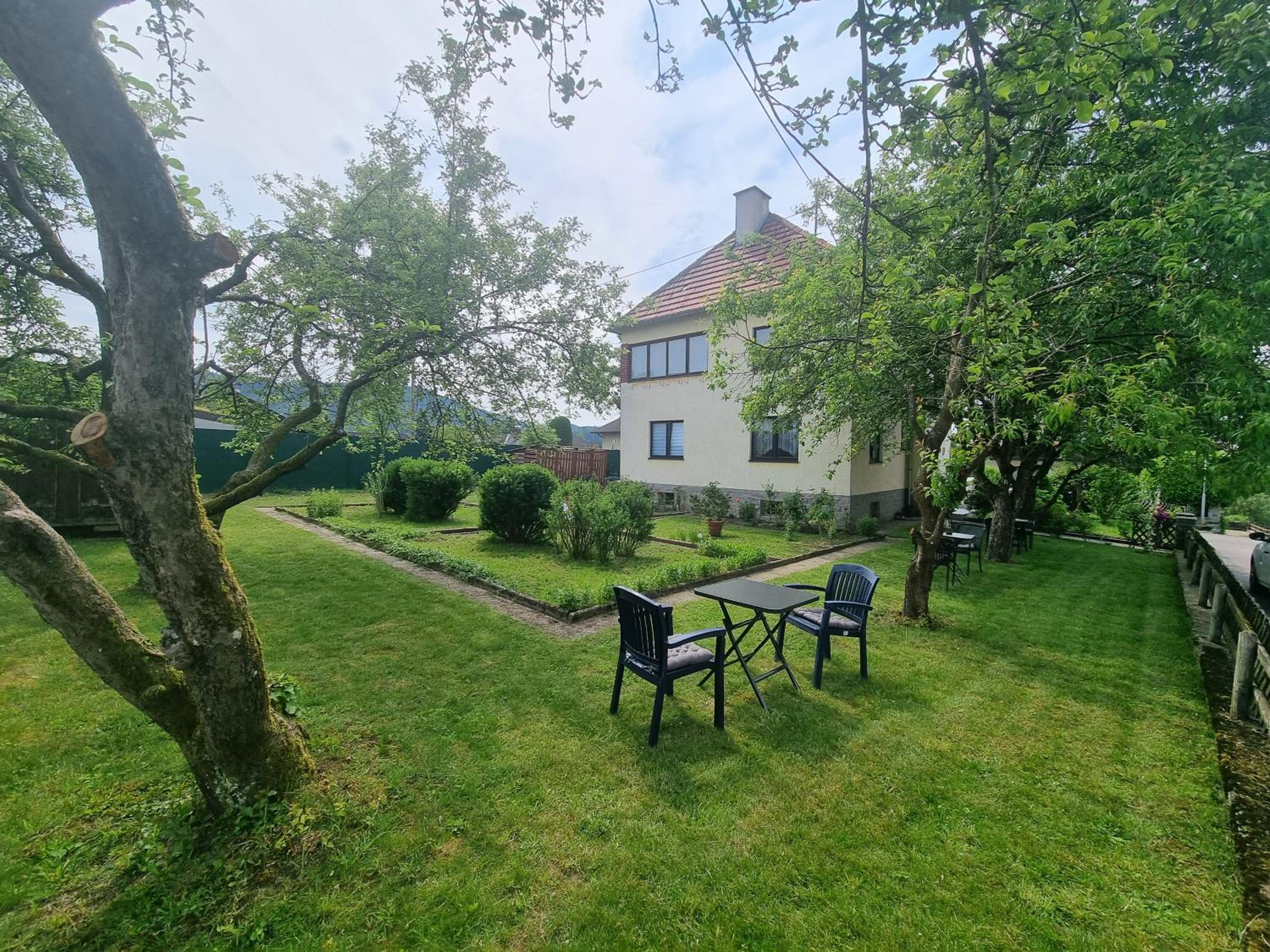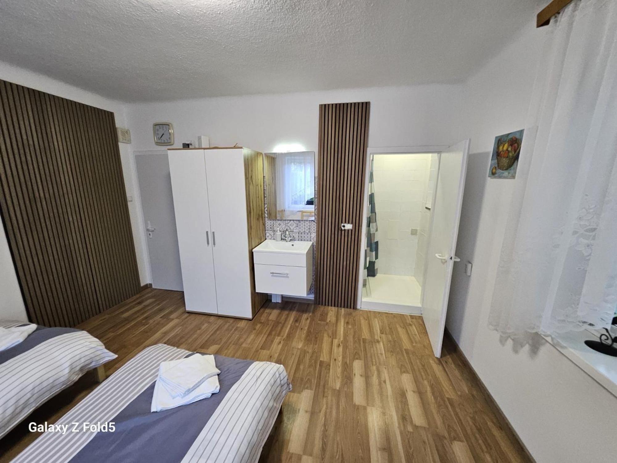 Ein altes Haus auf einem ungepflegt Grundstück, in der Garage ( Fahrrad- Abstellraum) liegt die Wäsche für die Zimmer offen rum, völlig unordentlich. Wir hatten ein DZ mit Dusche und WC. Die Fliesen wölbten, n sich von der Wand, bei Berührung fallen die runter. Duschwanne aussen schimmelig. Armaturen locker, , Putz bröckelt. Alte Möbel, das Bett quietscht und ist unbequem. Dieses Haus gehört grundsaniert, dort kann man nicht wohnen und schon gar nicht für 90 € pro Nacht, eine bodenlose Frechheit.