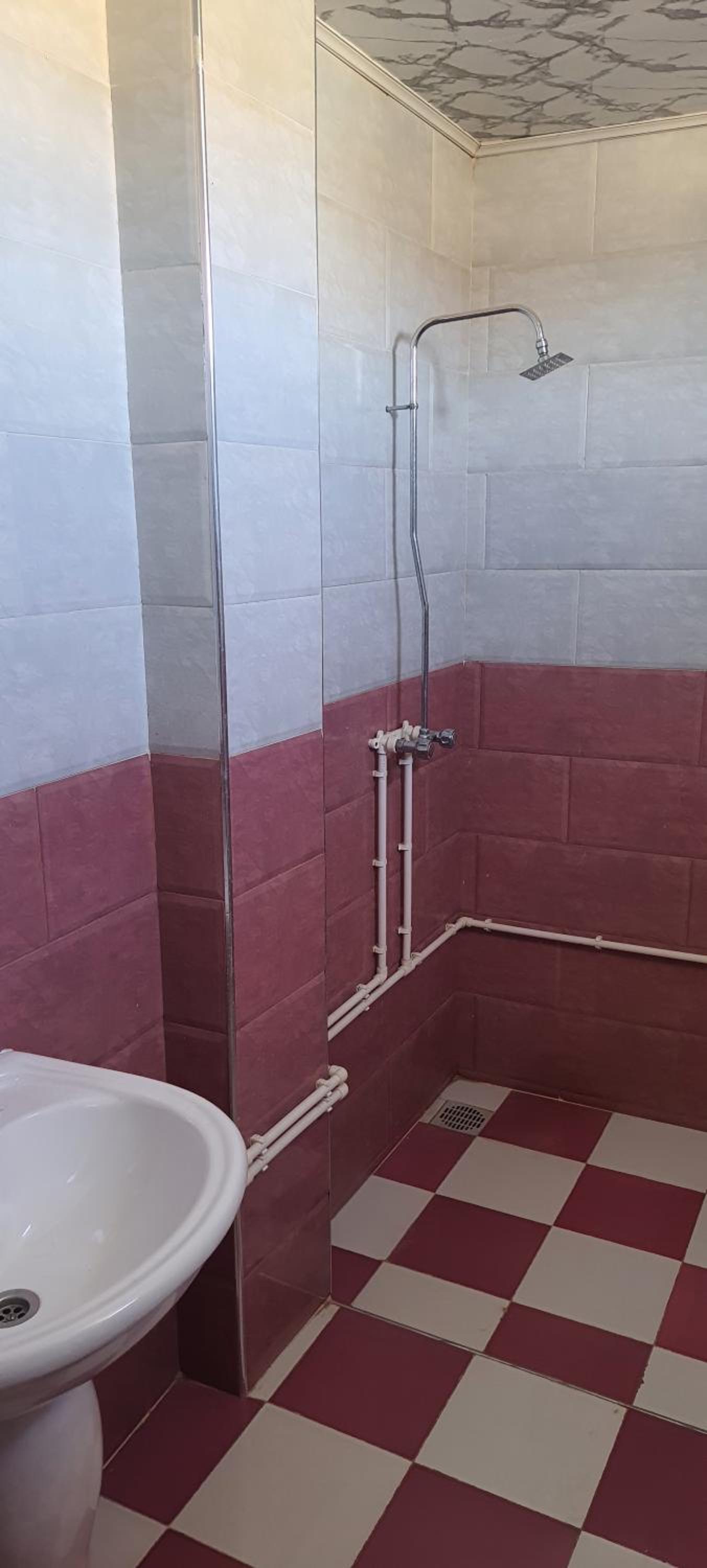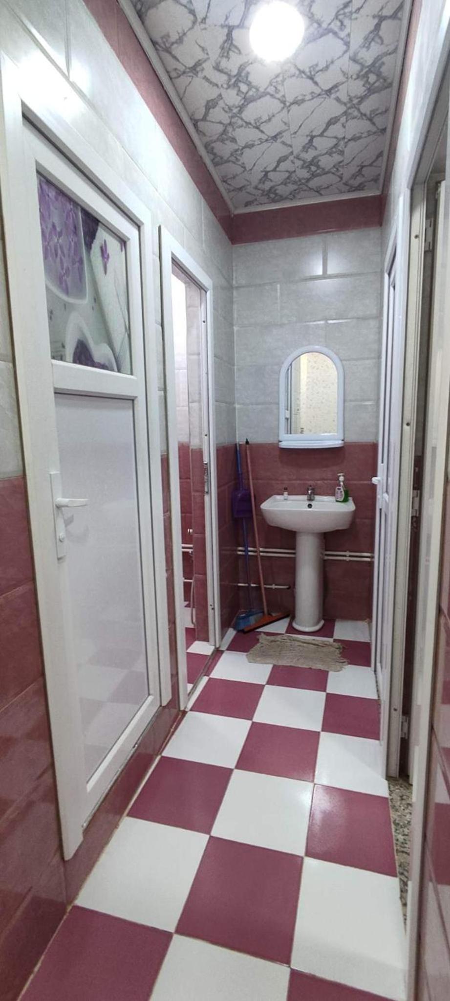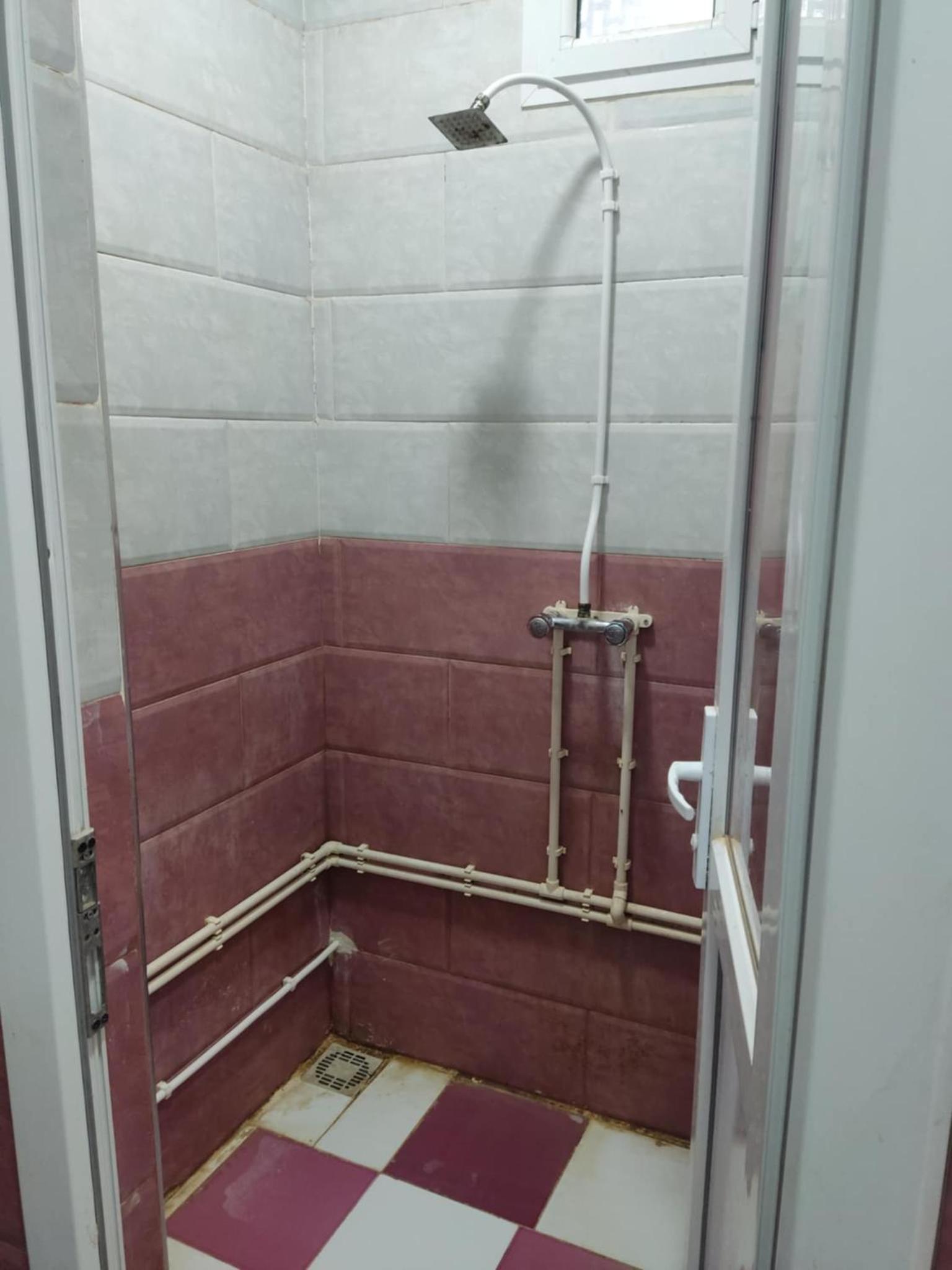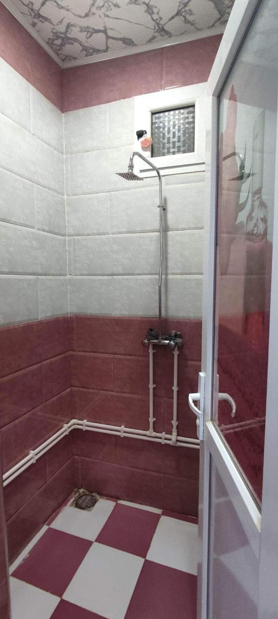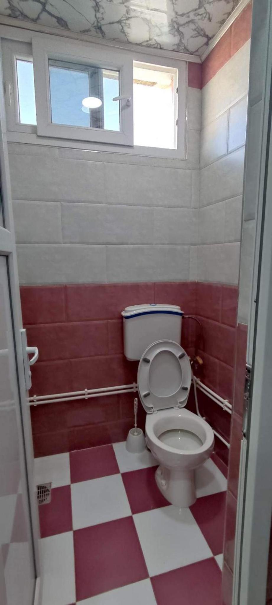 Ablaktalan helységek. 1 db női WC , tusoló, mosdó egy helységben. Melegvízigény (kávé, tea) esetén egy levágott müanyag flakonban tudtak csak vizet mikrózni. Vettem nekik egy bögrét.