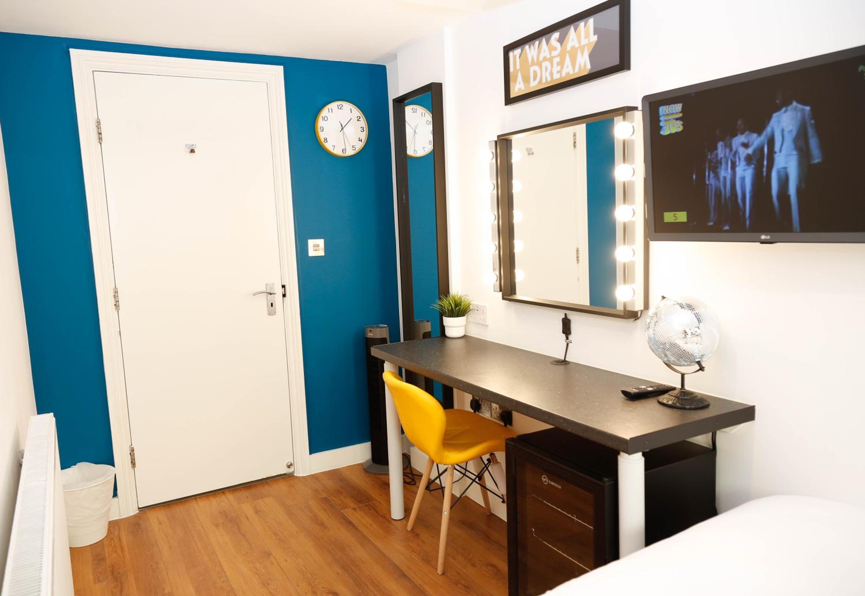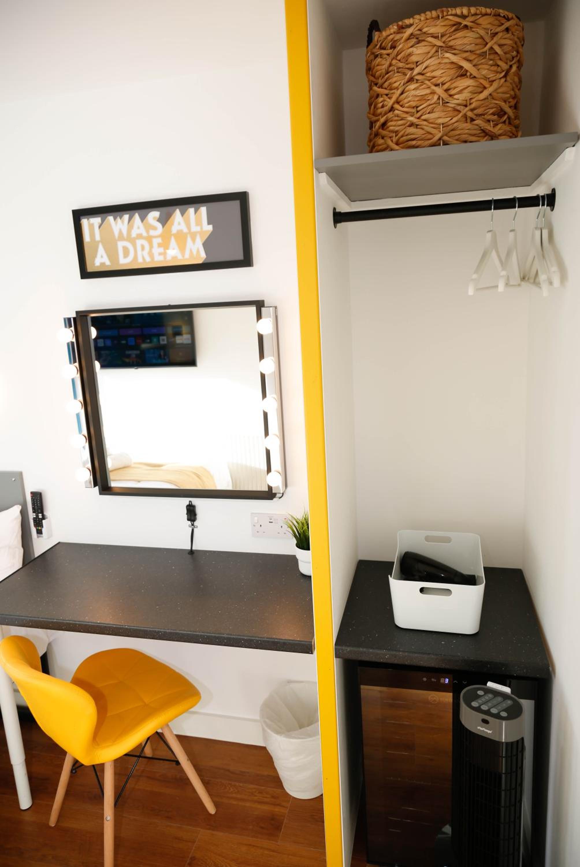 It was clean, stylish, the bed was comfy and the tv pulled out. We also loved the fabulous mirror with lights all around it. Very glamorous.