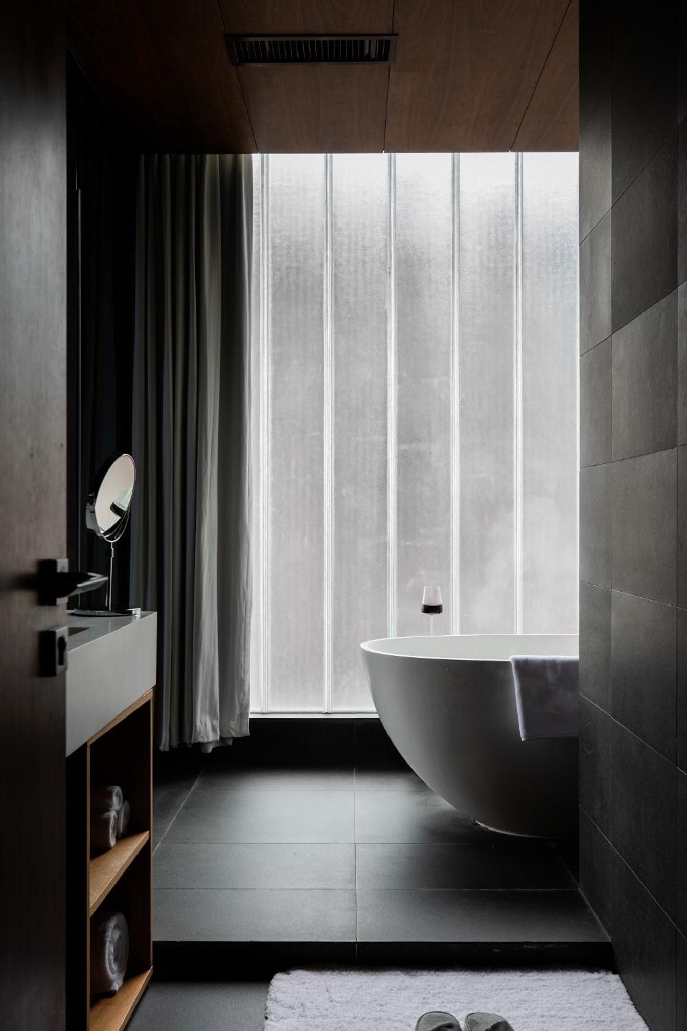 Das Hotel ist von Design her sehr dunkel. Das Bad ist zwar geräumig. Aber es gibt keine Möglichkeit, um Handtücher oder Kleidungen aufzuhängen.