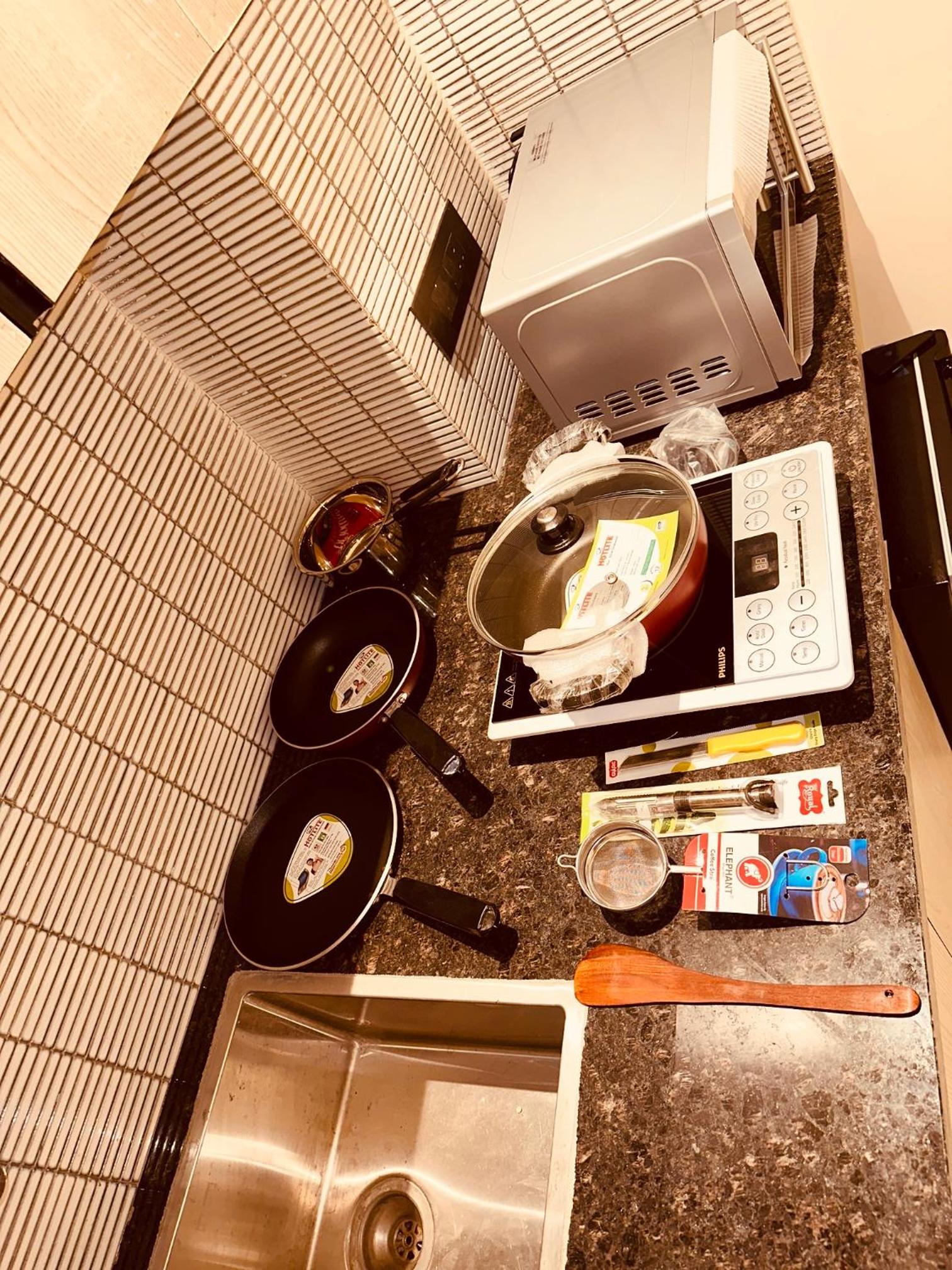 The kitchen is having every utensil you need to prepare any meals you want, like all the utensils, kettle, microwave, RO, hot water in kitchen, even all the basic spices:)