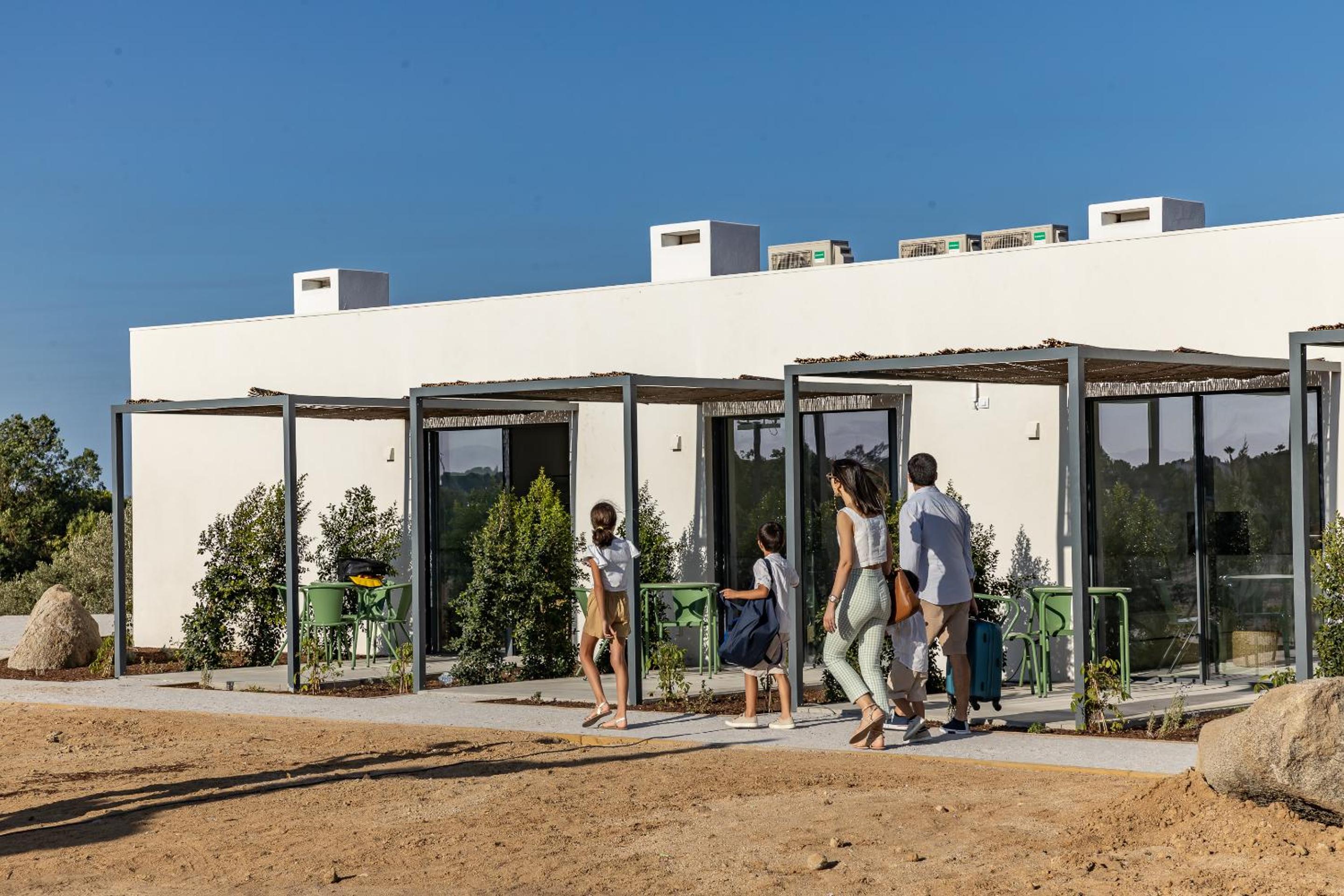 Each room features a terrace, pool views, a fully equipped kitchen, and a private bathroom with modern amenities like a walk-in shower and hair dryer.