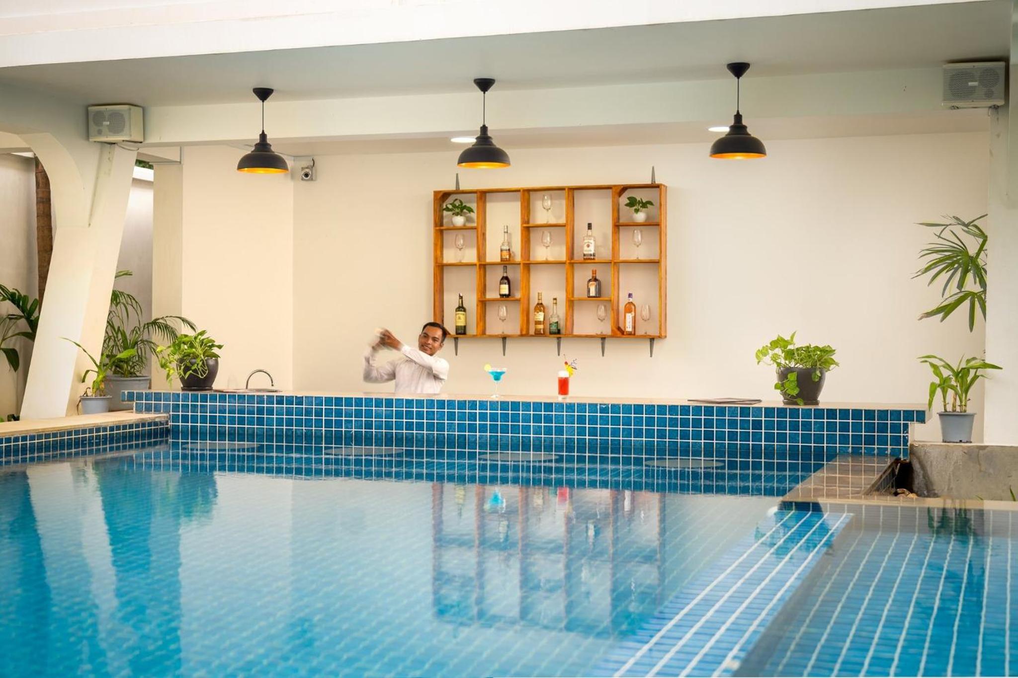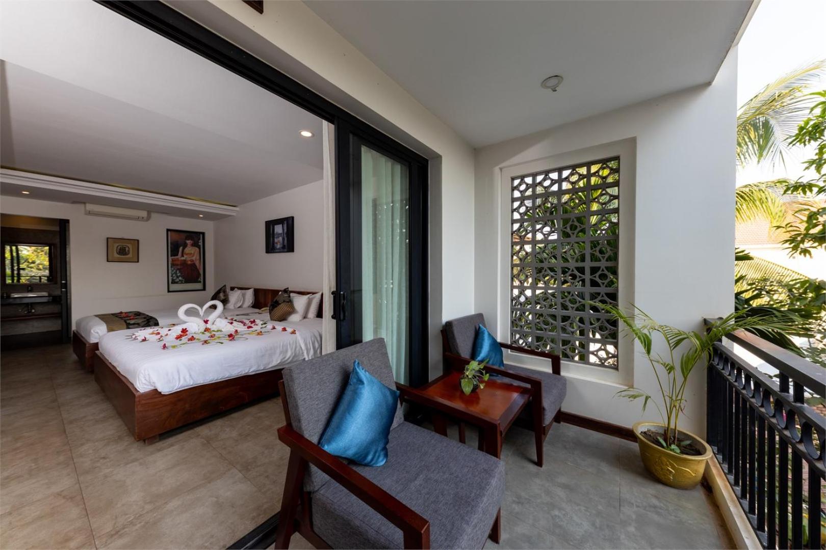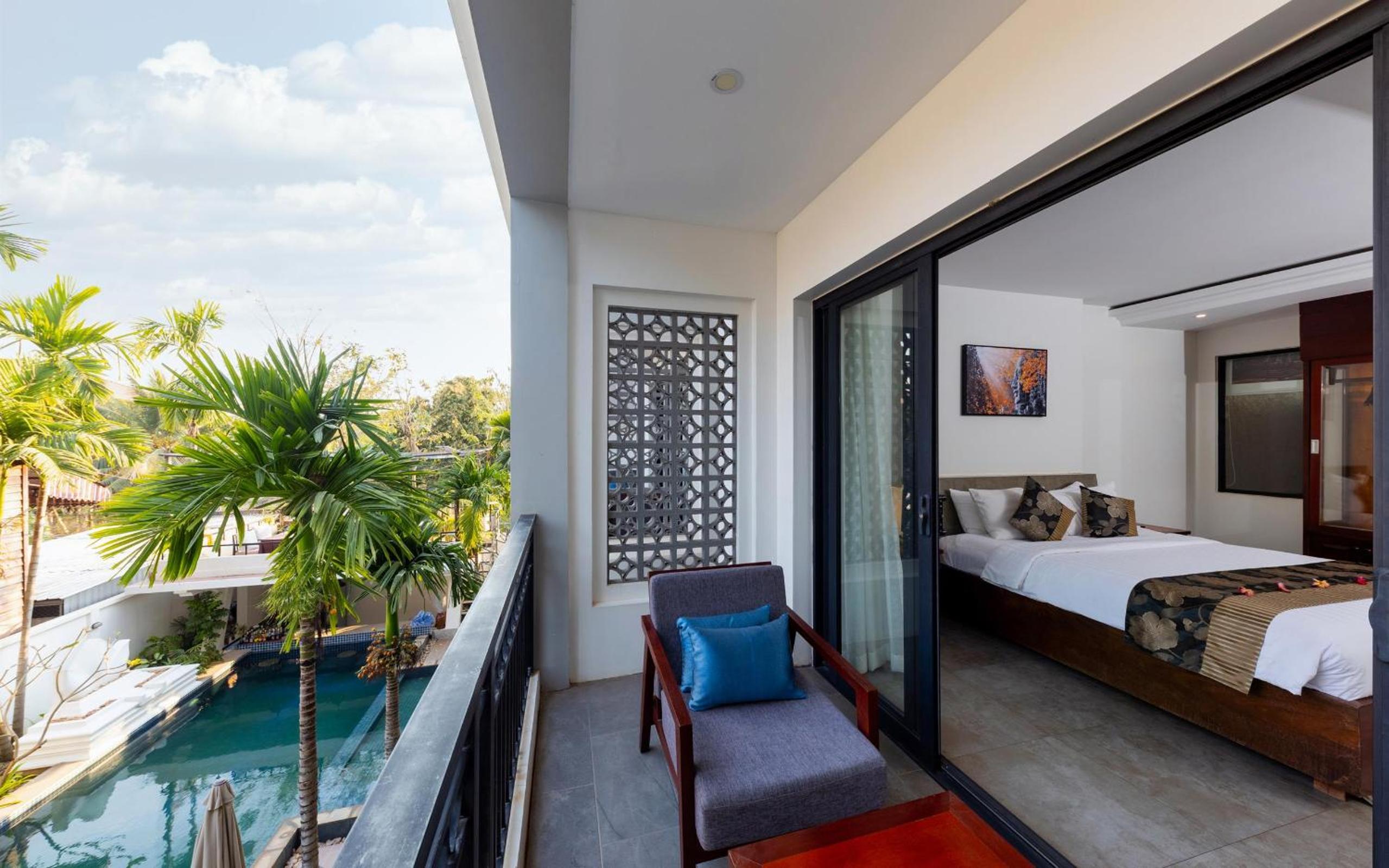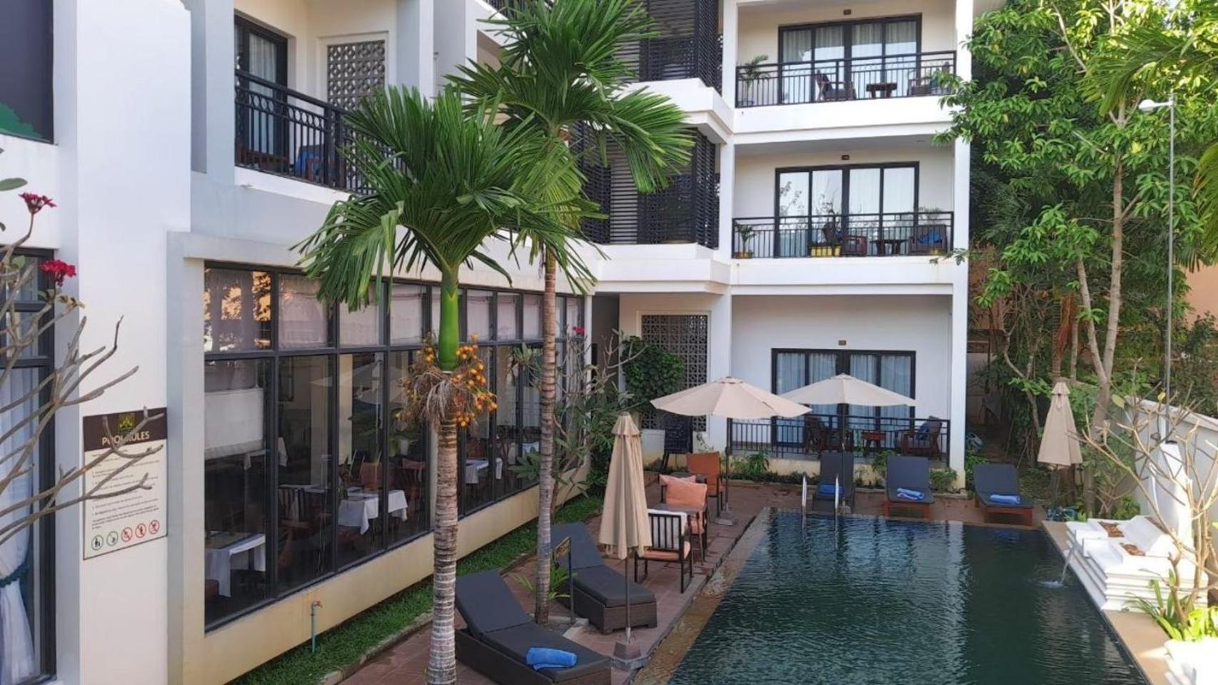 We really enjoyed our stay here and found it to be an exceptionally good value. Our ground floor room was a beautifully designed room with modern details, high ceilings, and lots of space with a small patio. The pool area was a very nice place to spend time. This is a small hotel located on a street that doesn’t have much activity and needs resurfacing. It may feel out of the way at first, since it’s not in the middle of town but we always felt safe, we really enjoyed our time here and would definitley stay here again. It’s a short tuktuk ride to many nearby restaurants and to downtown, which the hotel can arrange. We walked home from downtown several nights. There is a larger hotel around the corner that conveniently has a restaurant and a tuktuk stand when needed.