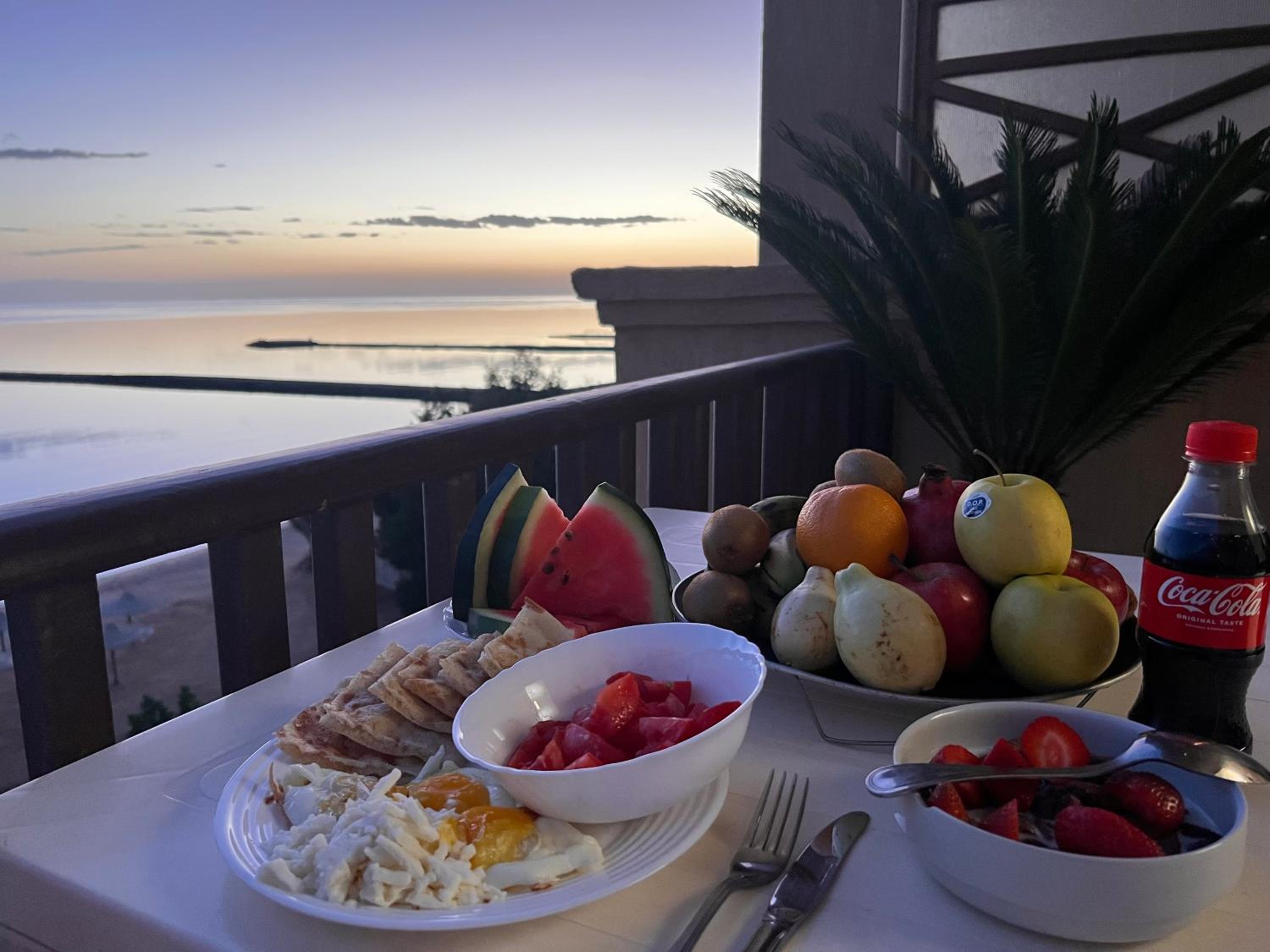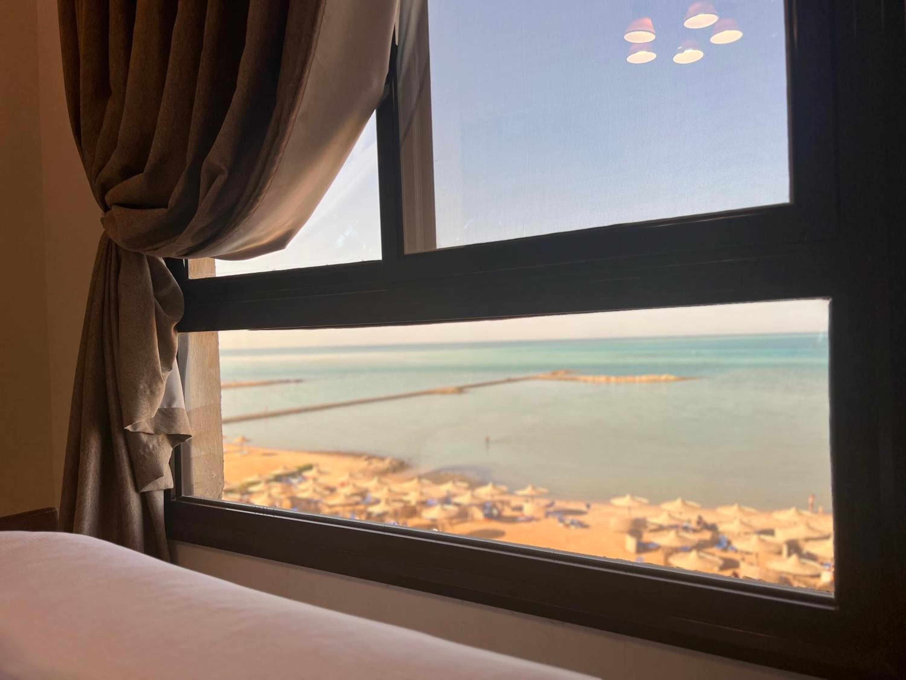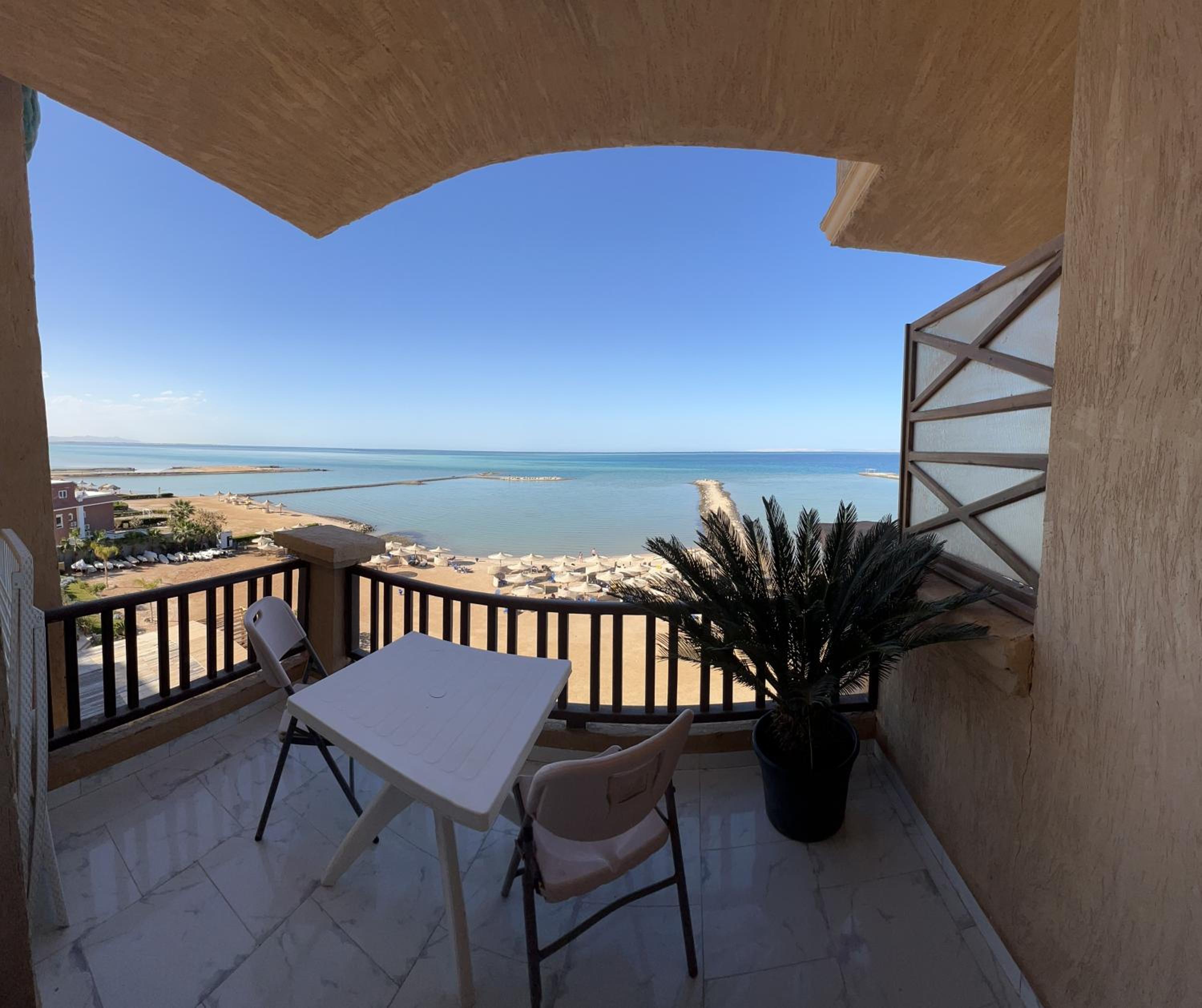VIEW, VIEW, VIEW. Location a relaxing bit just north of Hurghada. Lots of beach umbrellas and chairs. Wash machine in apartment is a bonus. Great for longer stays: full size refrigerator, stove, microwave, cooking supplies, completely furnished. Shower is separate from toilet area. Balcony has drying rack and outdoor dining furniture. Owner is extremely responsive. Working elevator in the building! Small on site beach cafe WITH real lattes, cappuccinos etc no instant Nespresso. Walking distance to both small and larger grocery stores, restaurants and pharmacy’s.