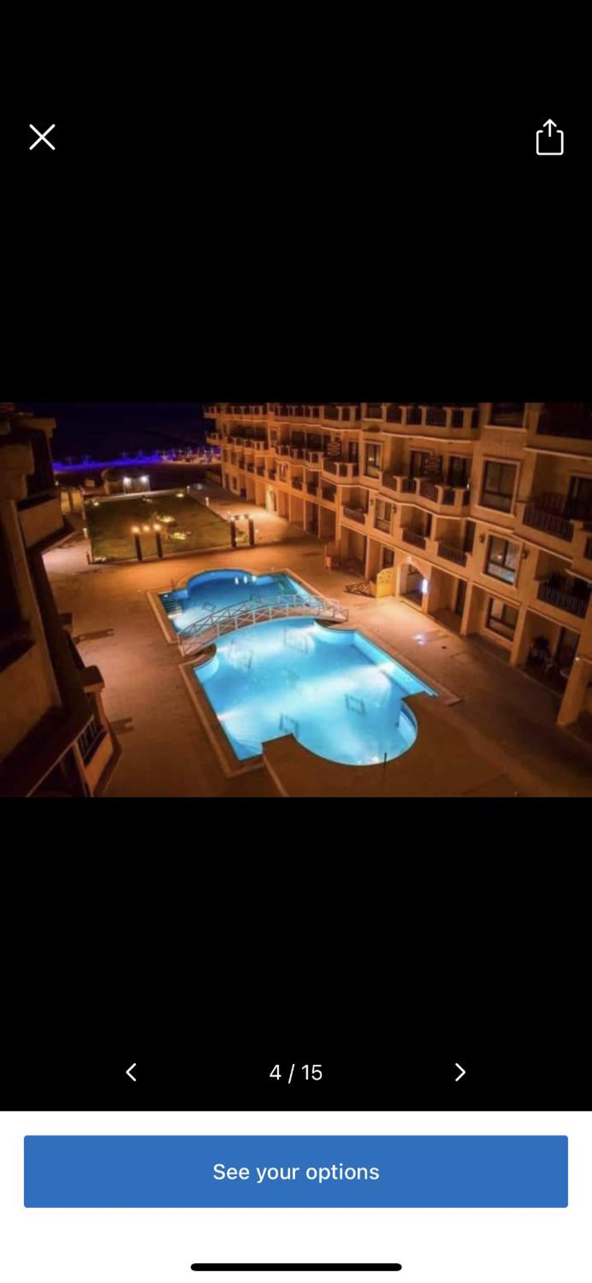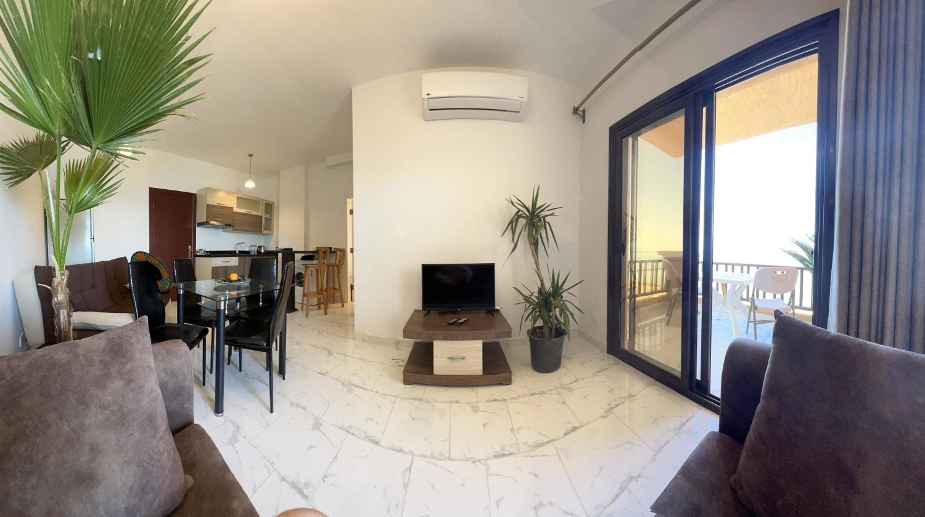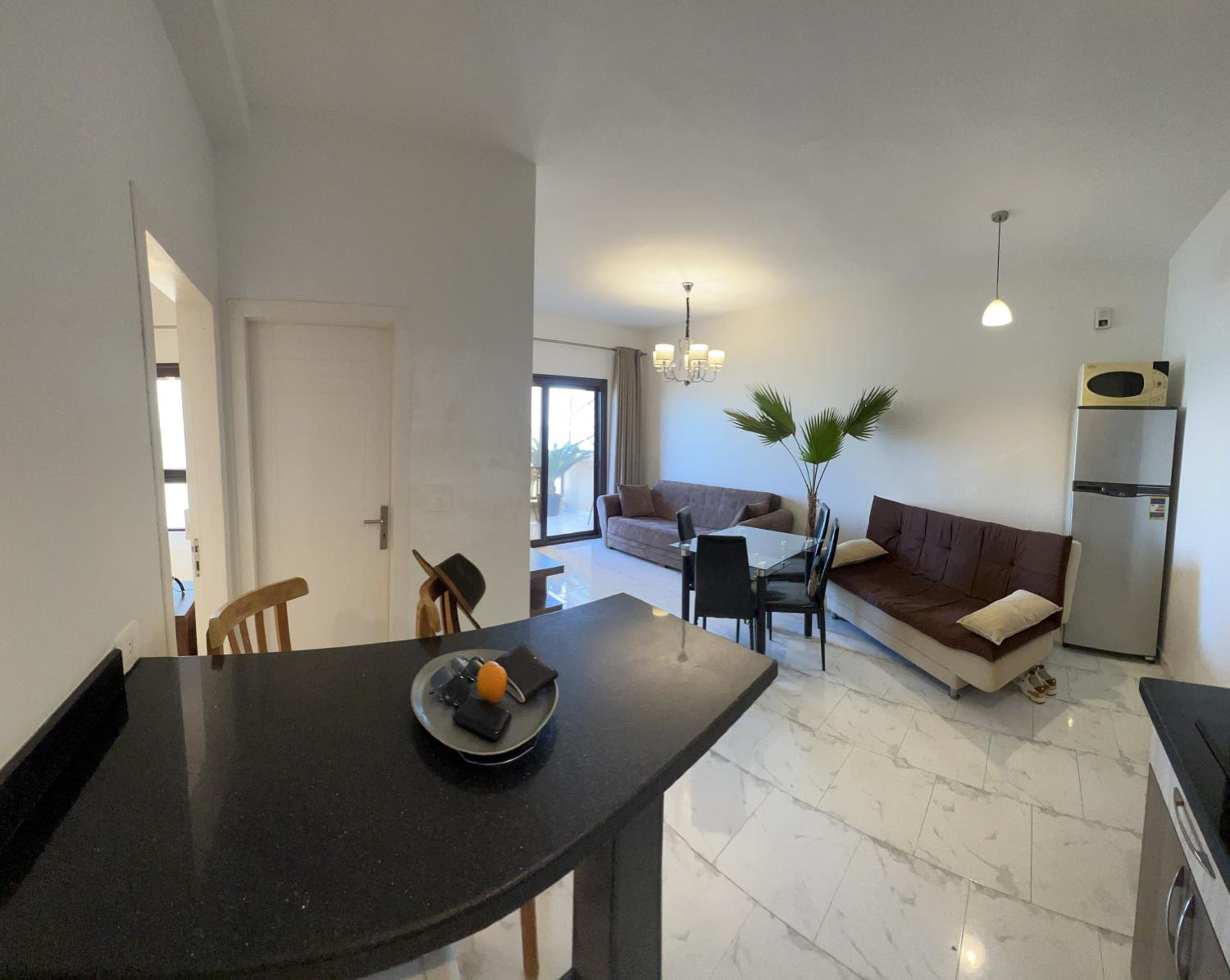The apartment was lovely, just as the pictures. Looks out to the sea. Netflix on the bedroom tv. We brought our amazon fire stick with us and used it on the TV in the living room. The complex and the pools are clean and tidy. There is a bar/restaurant which offers food and beer at a very reasonable price. It's a 25-minute cab ride to Hurghada Marina, which is worth a visit. Taxi's are very cheap, only a couple of pounds!