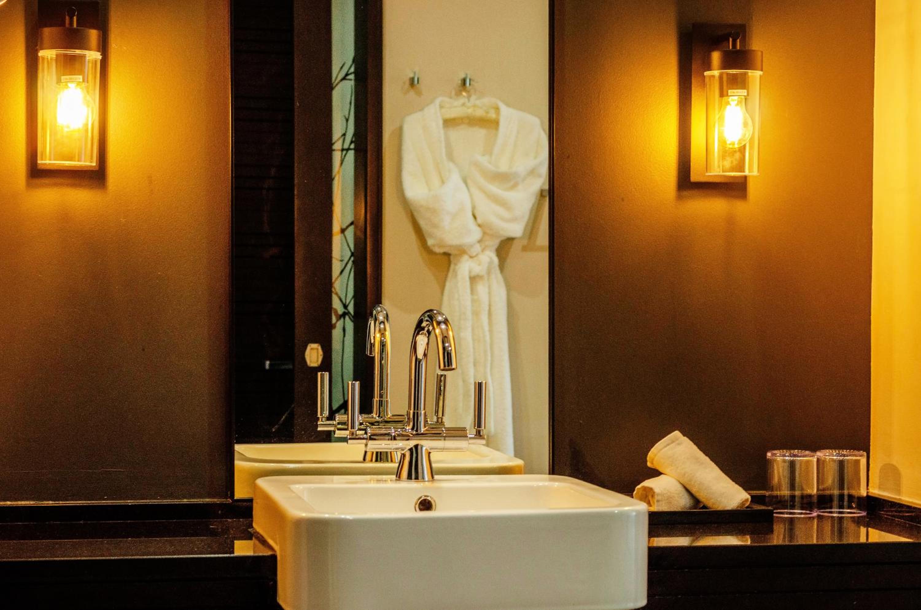 Private bathroom with bathrobes and hair dryer
