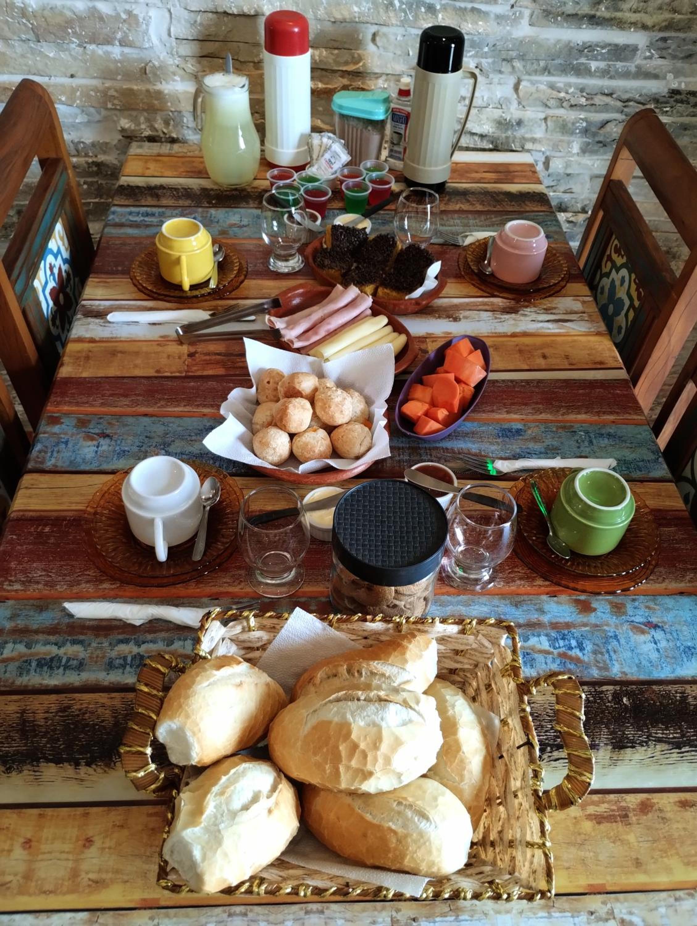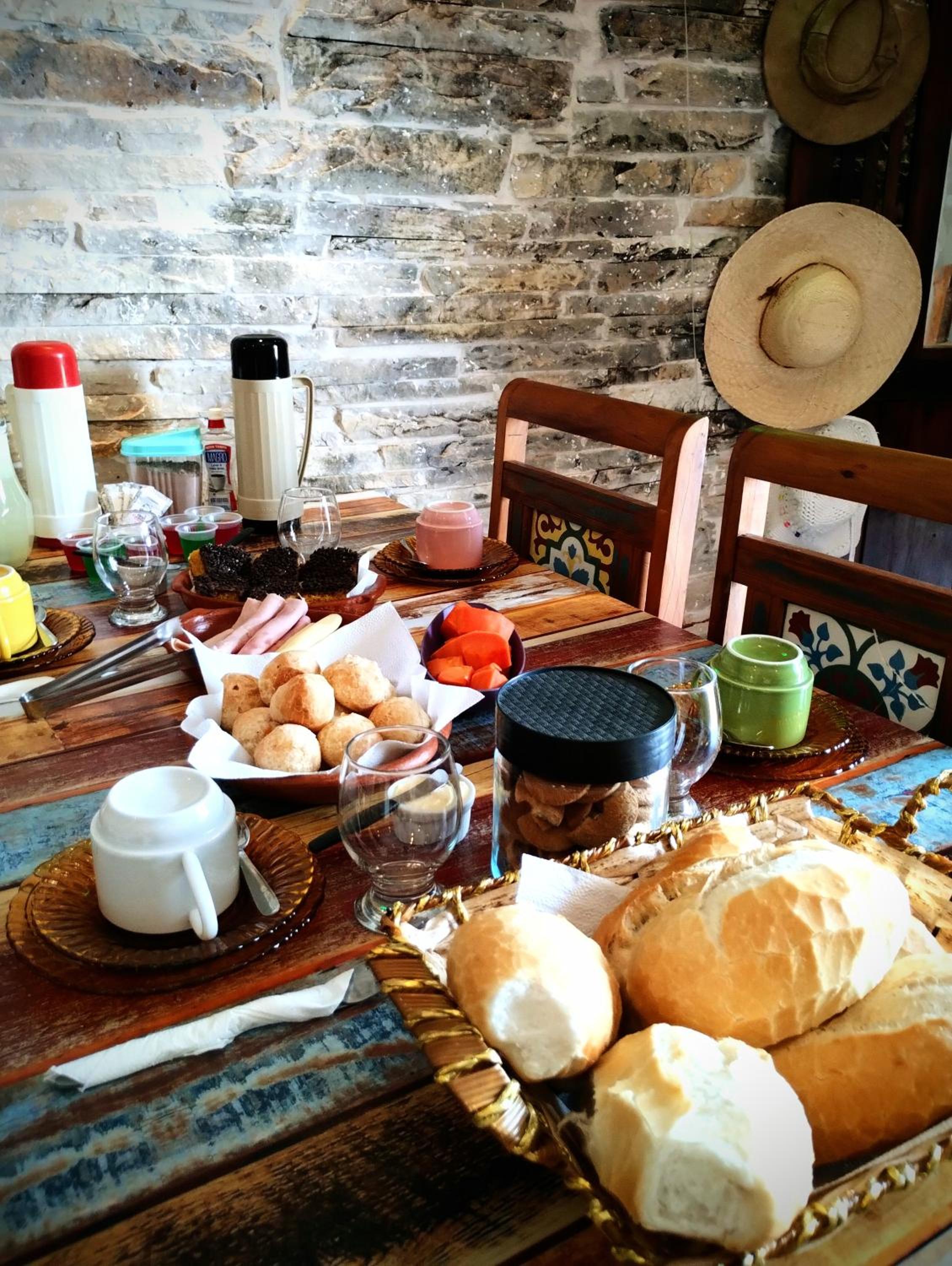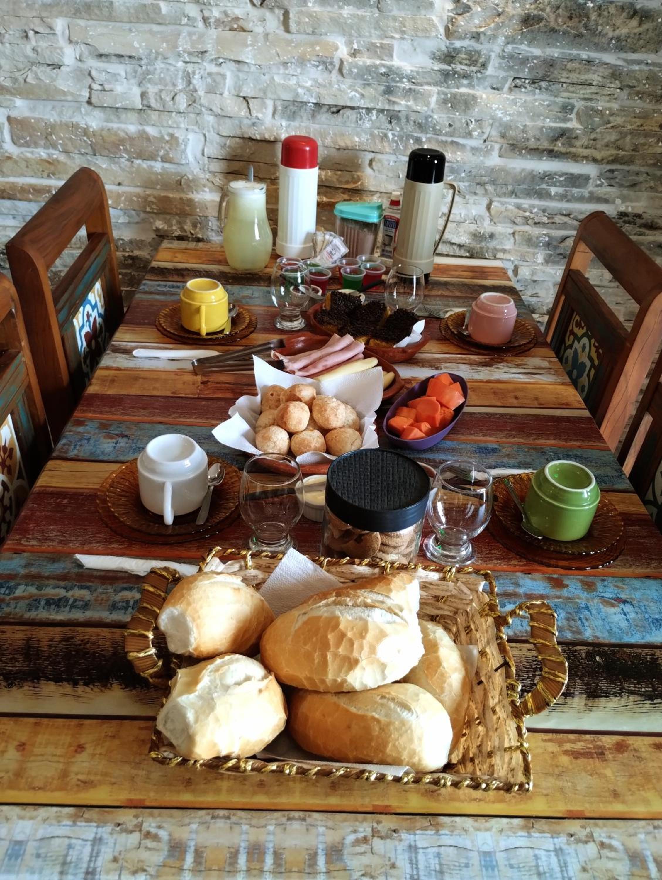 Café da Manhã gostoso, completo: frutas, granola, yogurte, pães diversos (senti falta de opção integral), broas mineiras e pão de queijo, queijo mineiro, frios, bolos. Sucos, leite/café, chás. A presença hospitaleira do anfitrião Maxwel fez toda diferença! O local limpo e iluminado, a decoração agradável.