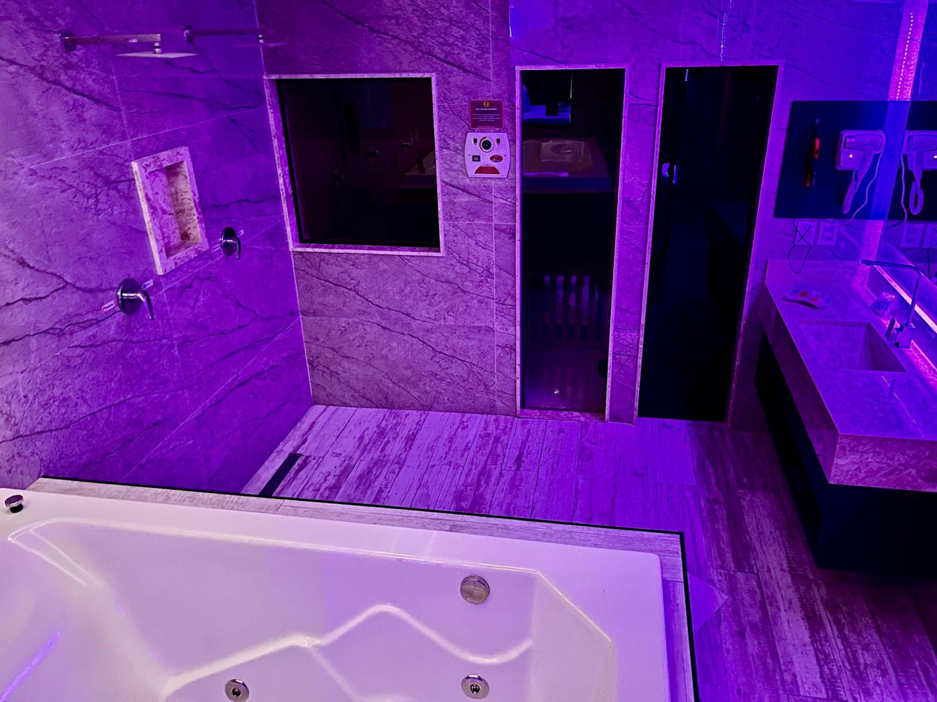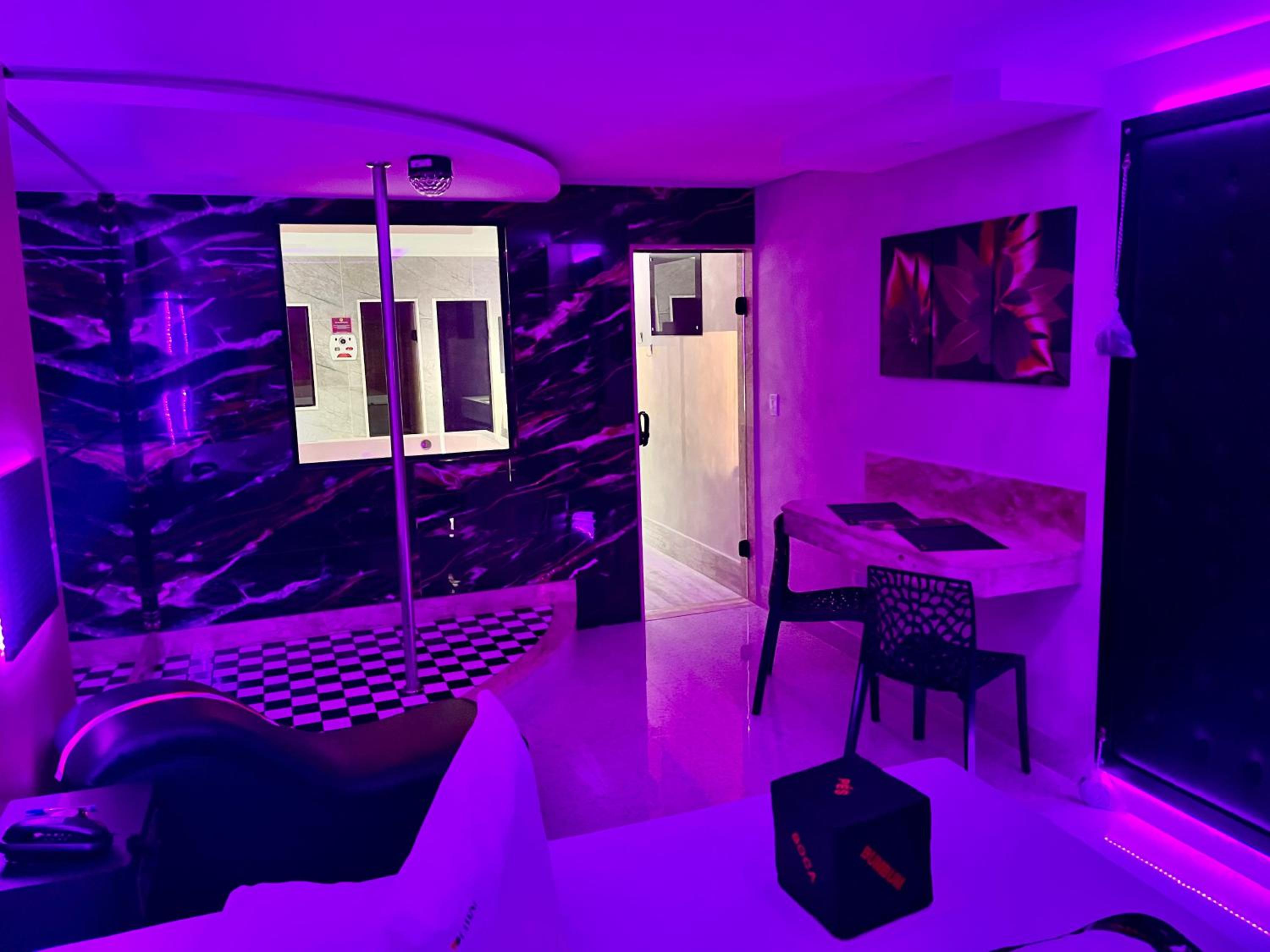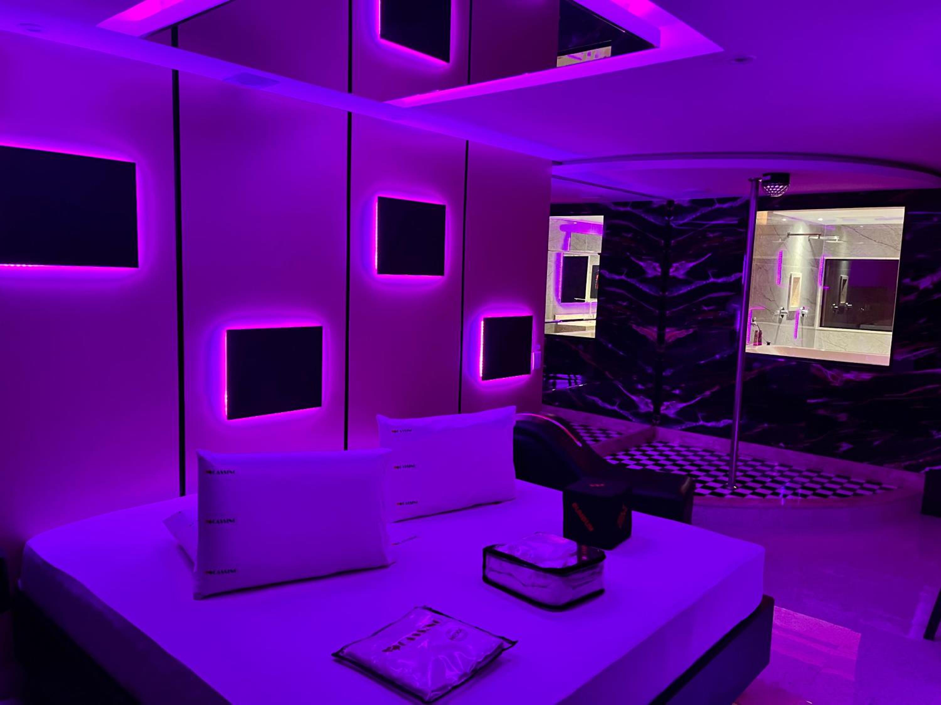 We arrived on Christmas 🎄 Eve and the room came complete with lights, disco 🪩 ball AND a stripper pole! Bondage wall, dildos by the nightstand and retractable roof over the jacuzzi were an amazing plus. Our stockings were hung by the chimney with care :)