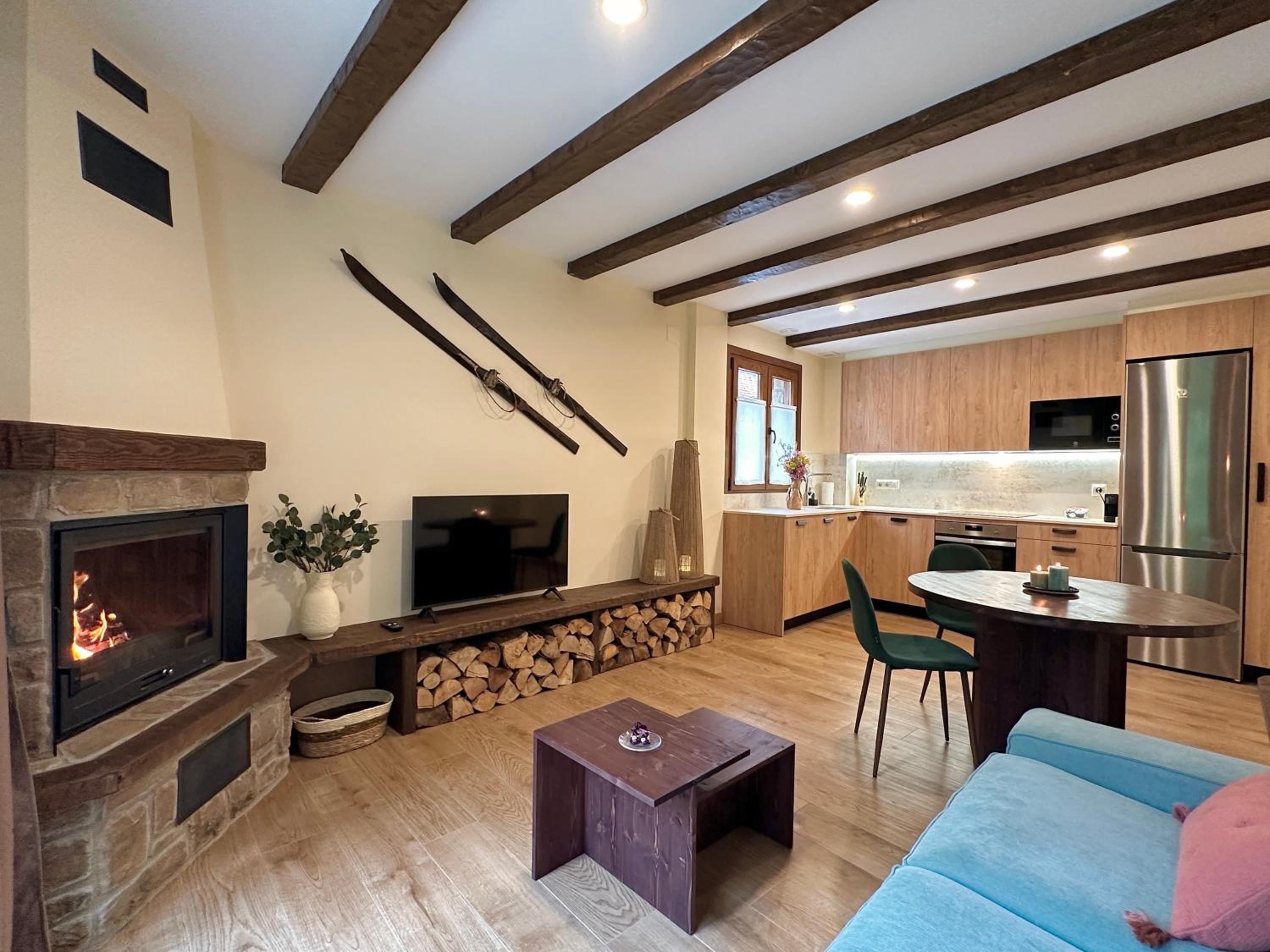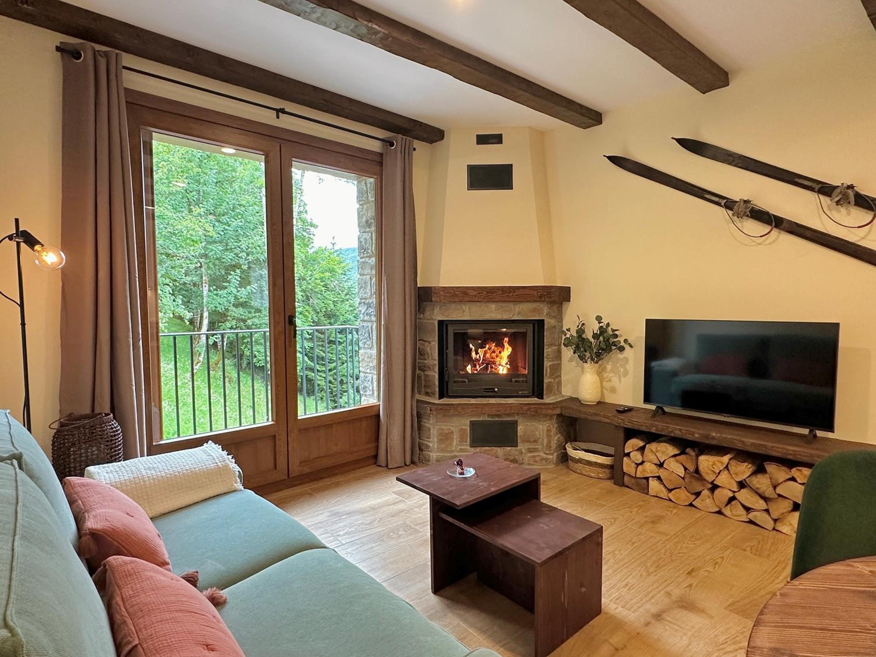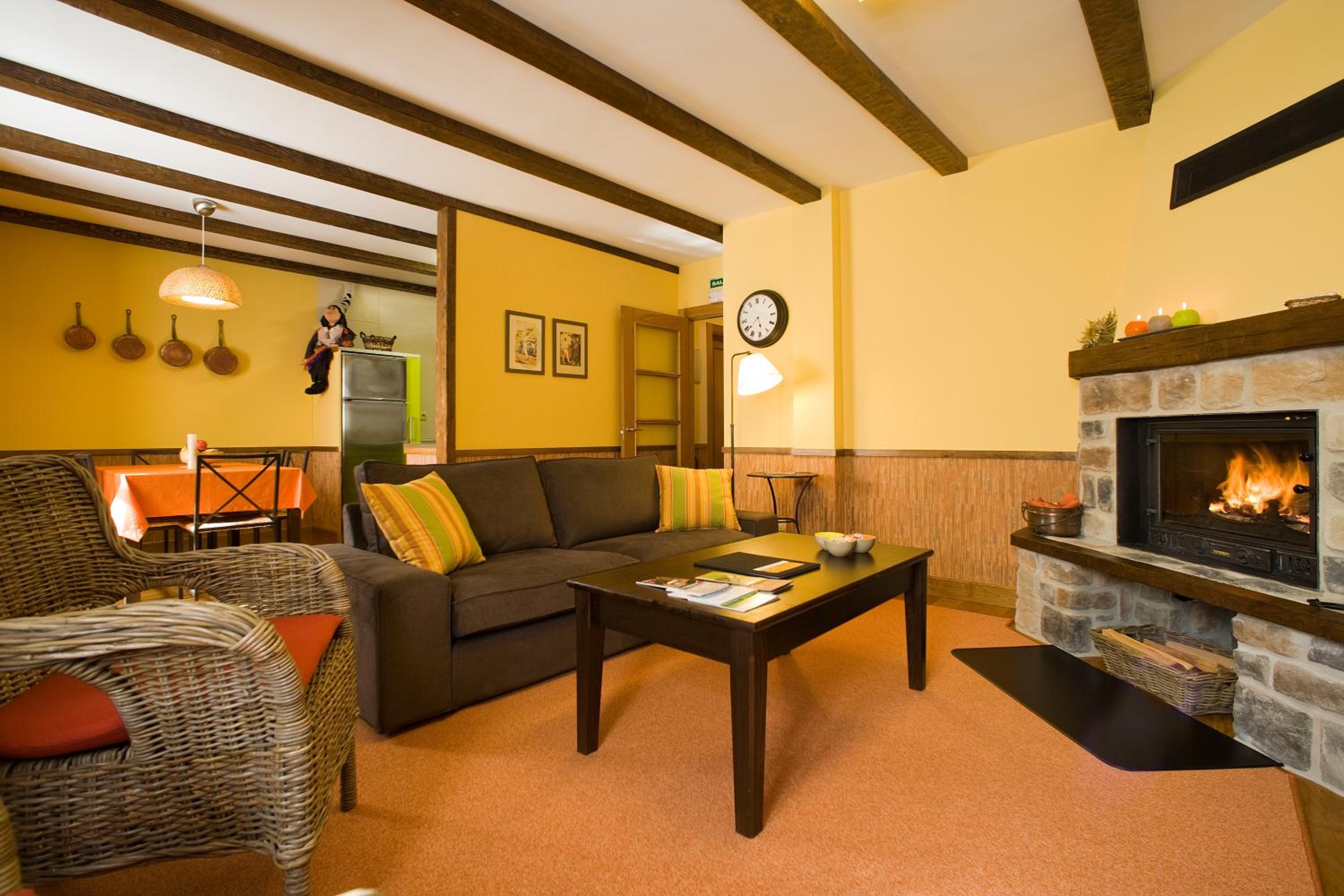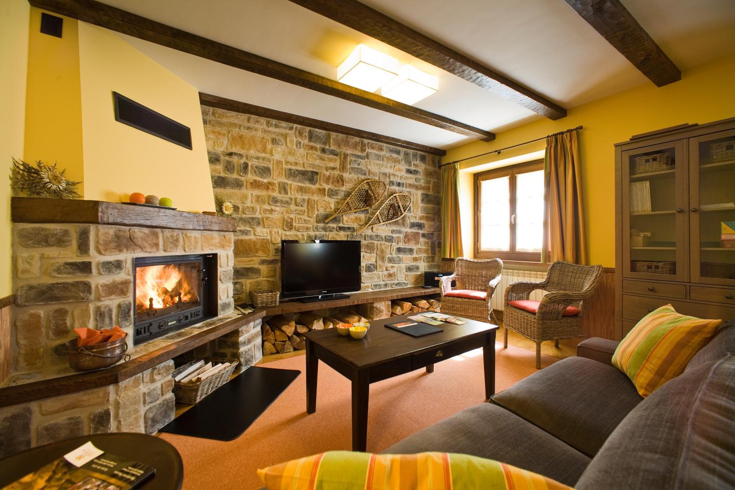 Unwind in the inviting lounge with an open fireplace, perfect for mingling with fellow guests and sharing stories after a day of adventure in Navarra.