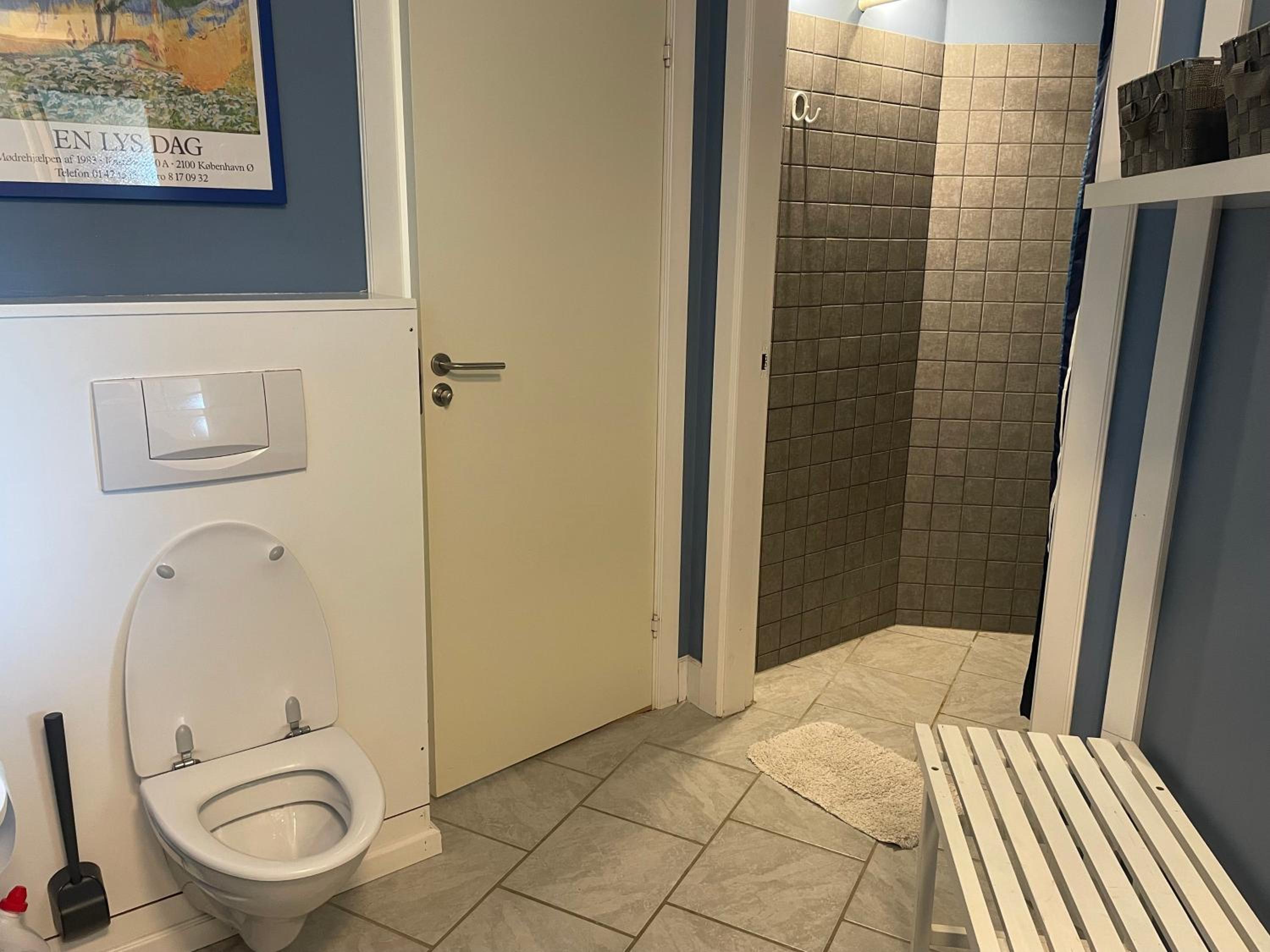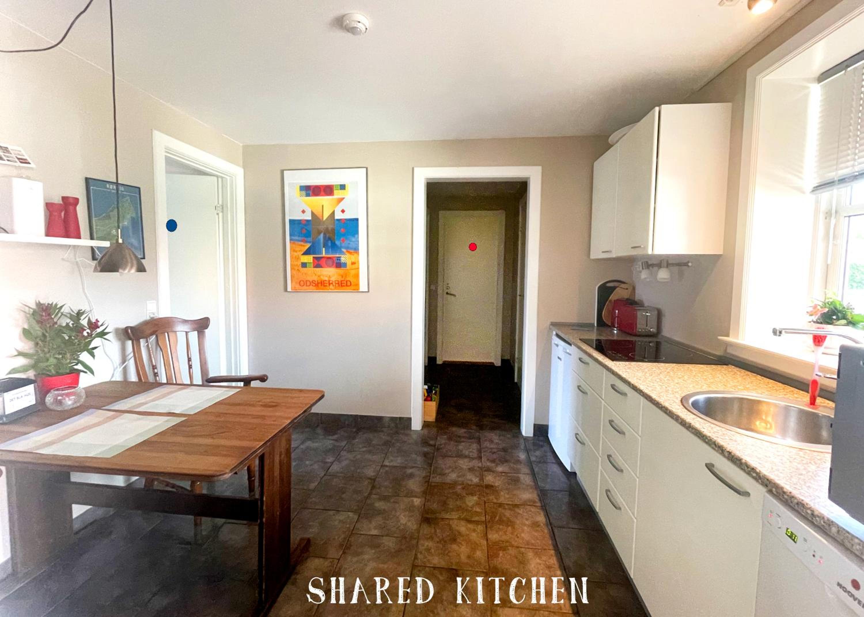 Tre udenlandske håndværkere i det andet værelse. De havde vænnet sig til stedet, og sad i underhylere og bar mave ved køkkenbordet af flere omgange. Man skal gå gennem køkkenet for at komme på toilettet, og selvom de var stilfærdige, ryddelige og hilste pænt, trak det ned i oplevelsen.