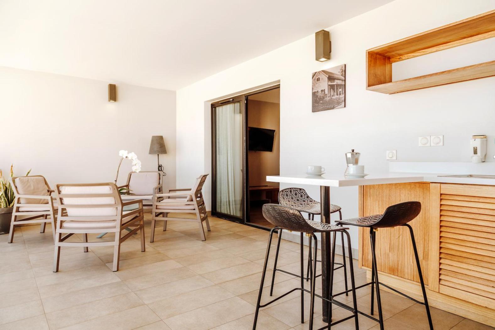 Relax in rooms equipped with modern amenities including a terrace, cable TV, and private bathroom. Upgrade to a Deluxe Suite for a stunning sea view and convenient kitchen facilities in most units.